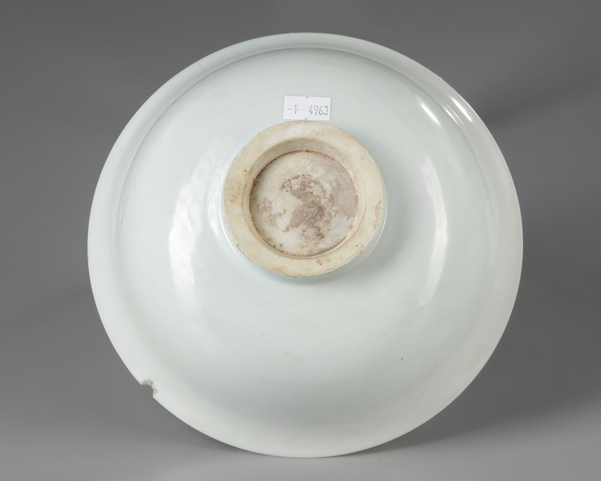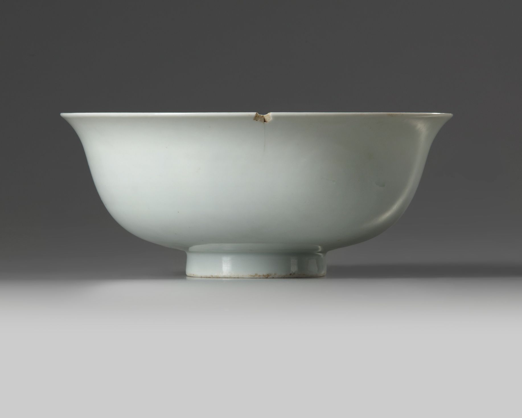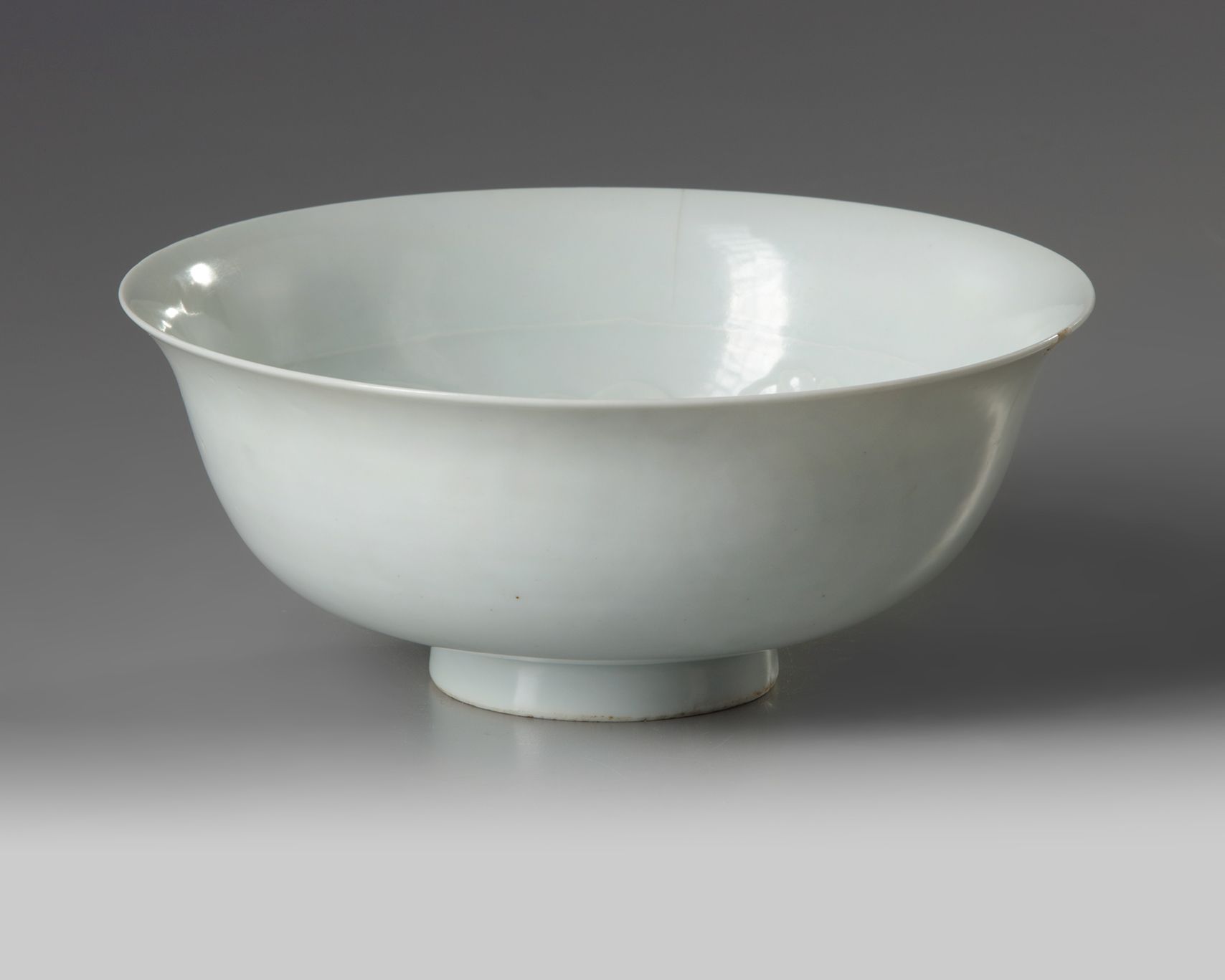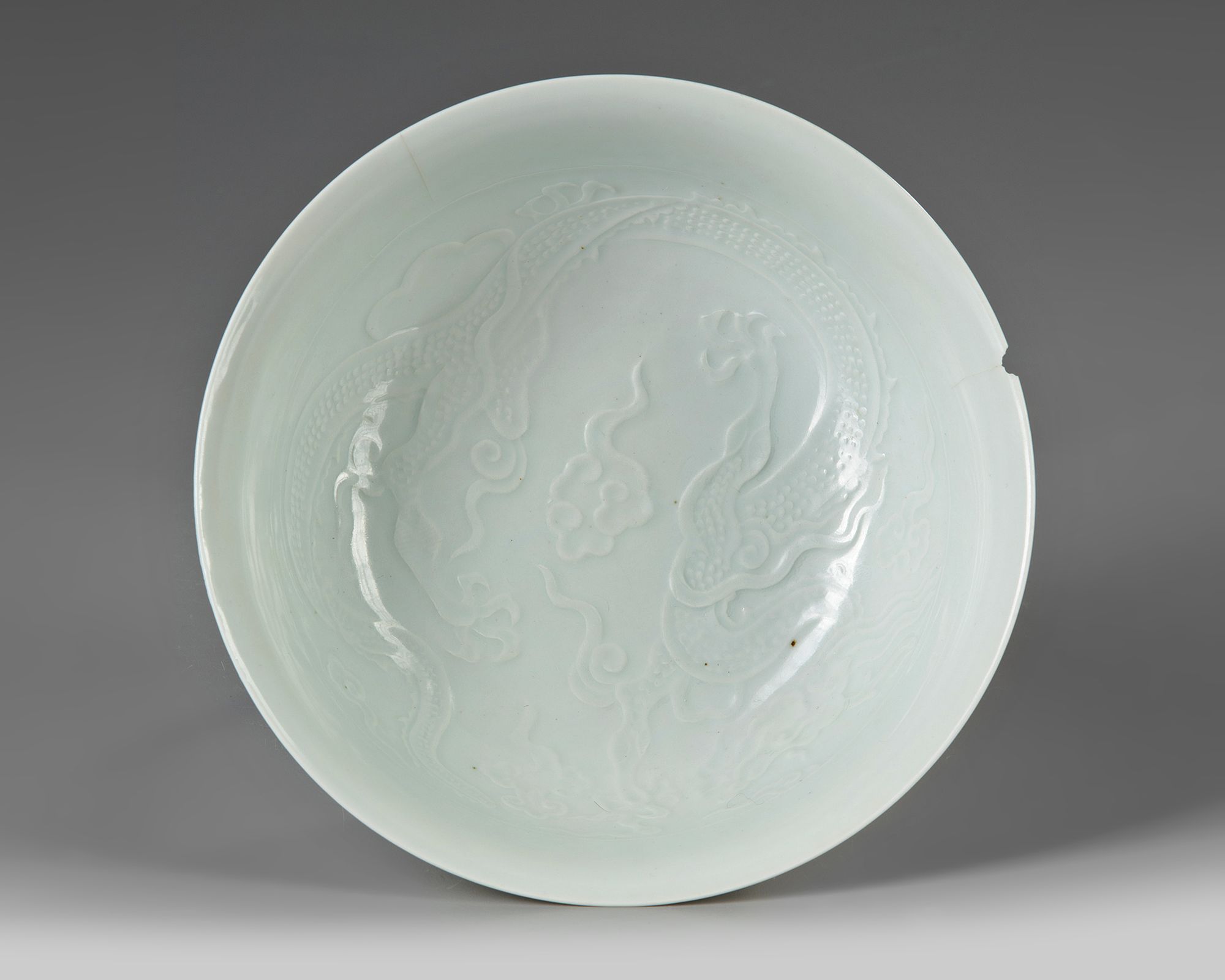 The bowl is decorated with a coiled dragon to the interior amongst cloud scrolls. The bowl is covered overall with a pale grey-blue glaze.