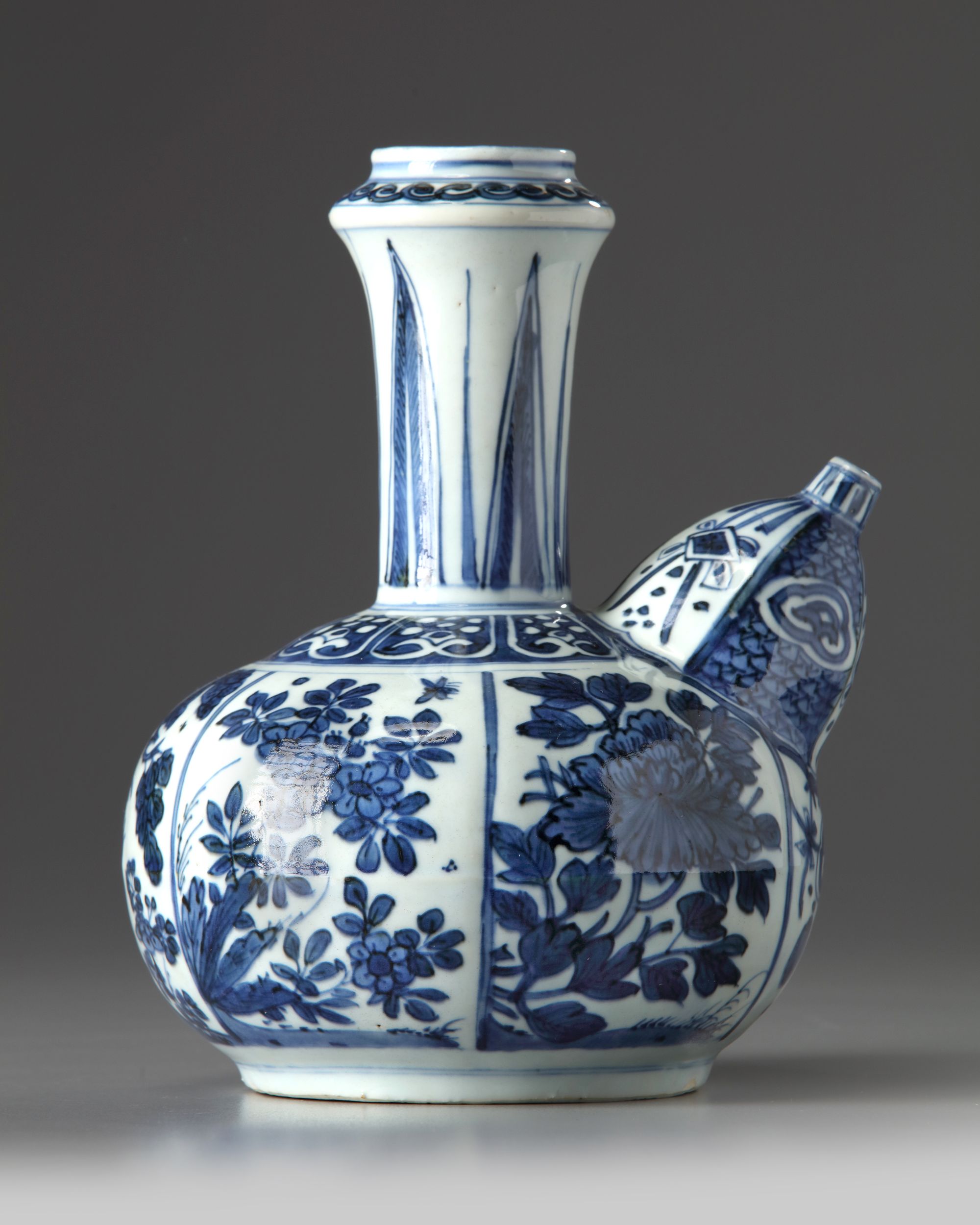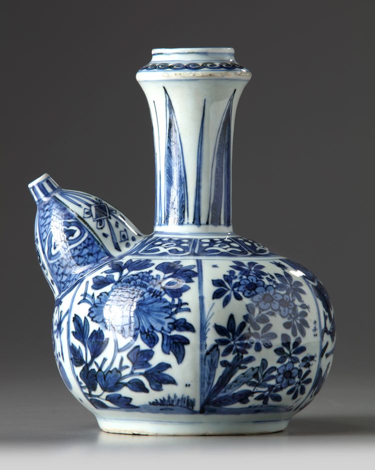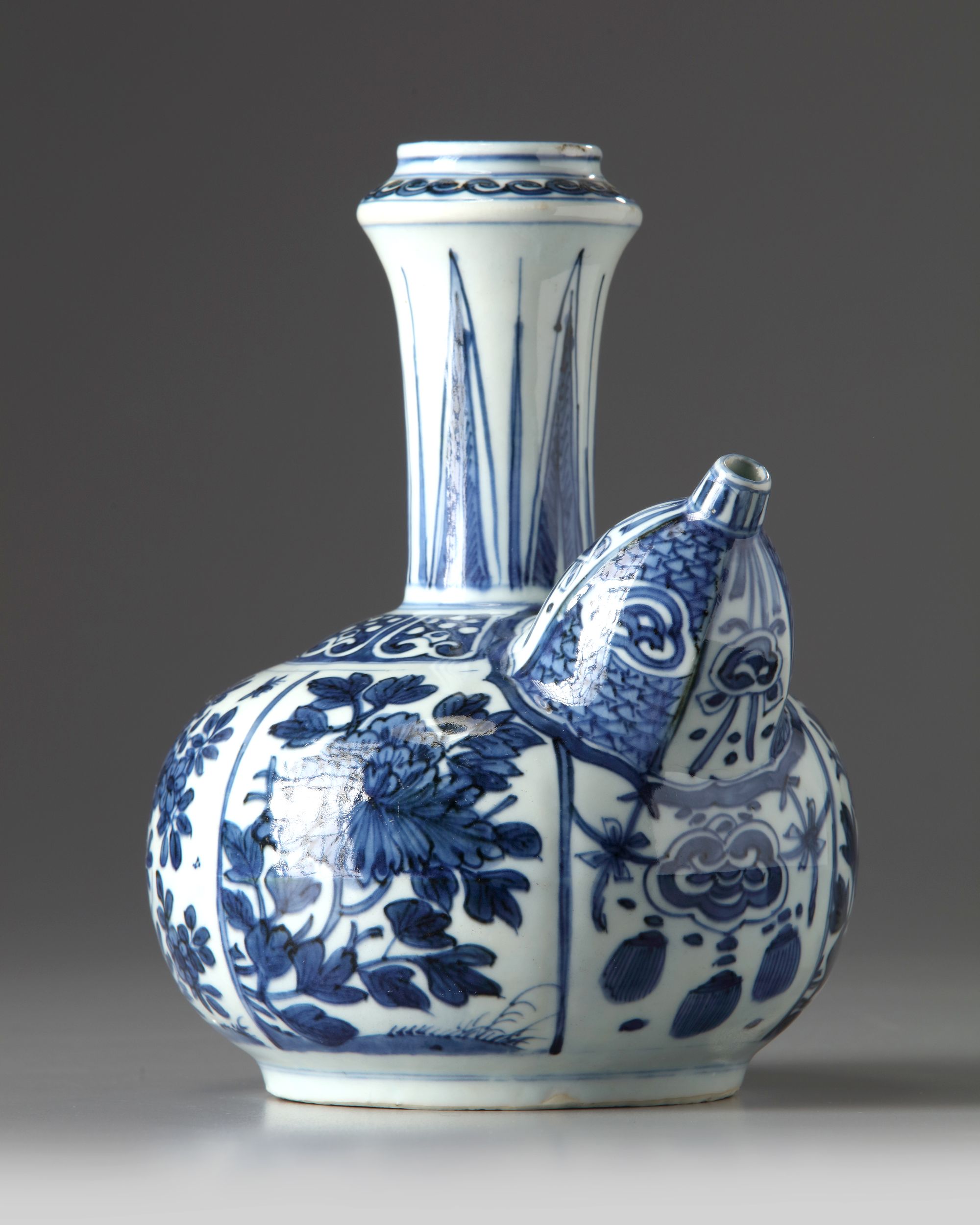 The globular body is separated into seven panels, four enclosing large blossoming flower sprays, one enclosing a bird perched below a tree, and one decorated with a tasselled ruyi head, all below a shaped spout moulded with ribs decorated with a tassels and a brocade design. The slender neck decorated with stiff leaves above a lappet band.