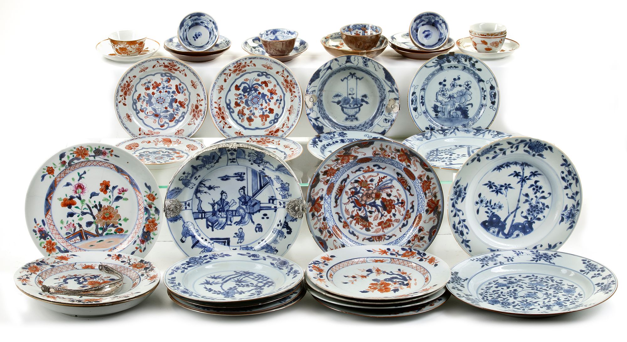 Thirty nine Chinese blue and white and Imari wares. Comprising: seventeen saucers with horses and landscape and a seated lady with flowers. The diameters vary from 8 to 12 cm. Twenty two blue and white and Imari dishes decorated with flowers, seated ladies. 24-20-18-cm. diam.