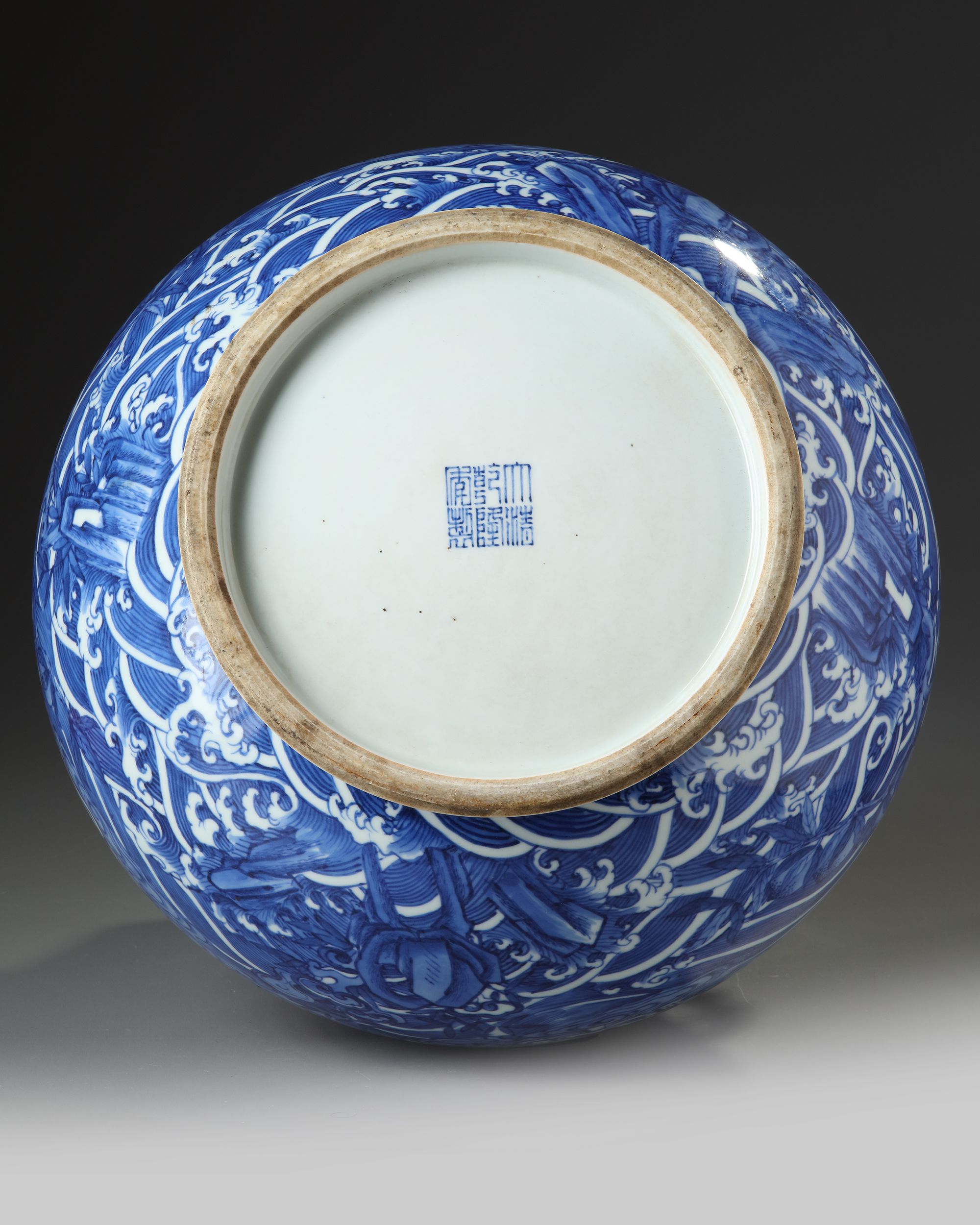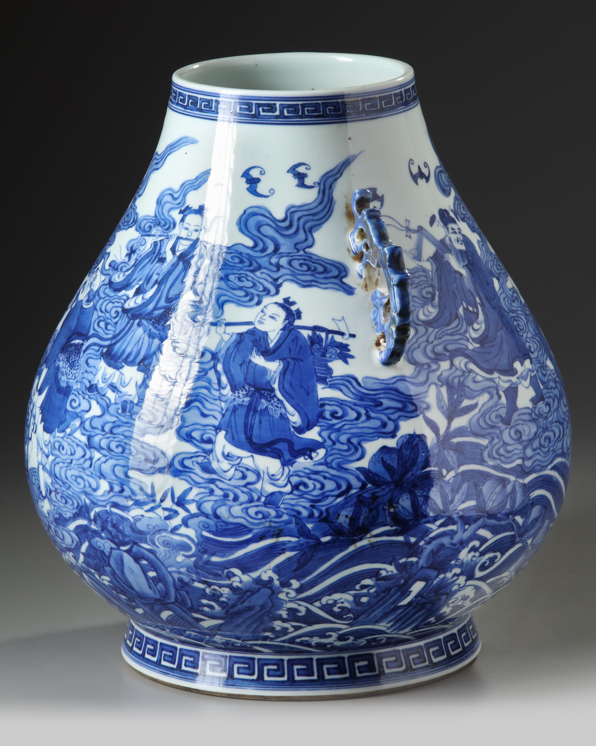 Of archaistic form, the full-bodied vase is superbly painted in blue and white with The eight Immortals on sea waves amongst clouds. All set between a key fret chain to the rim and the base.The vase is flanked with two dragon shaped handles. The bottom with a Chinese Qianlong seal mark. 38 cm high.