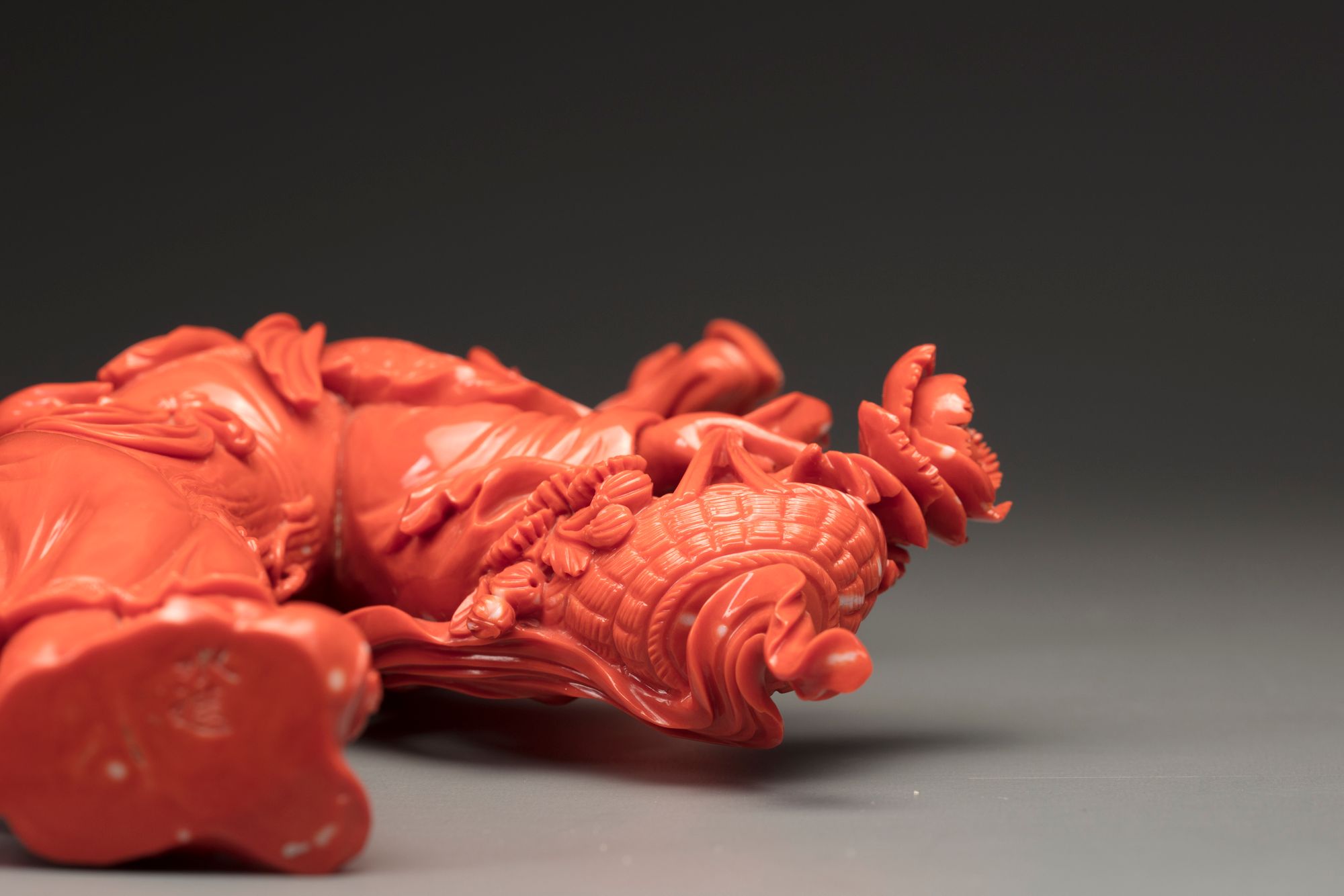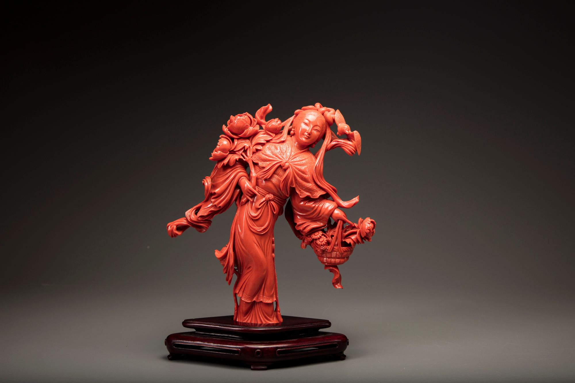 The piece is carved as a standing lady immortal holding a basket full of flowers in her left hand and a branch peony in her right. She wears long robes with her scarves fluttering in the wind. Her shawl is carved with a geometric design. A bird is in flight just above. The carving is marked 'Shui Jin'. With a wood stand. Weight without stand is 1832 gram.