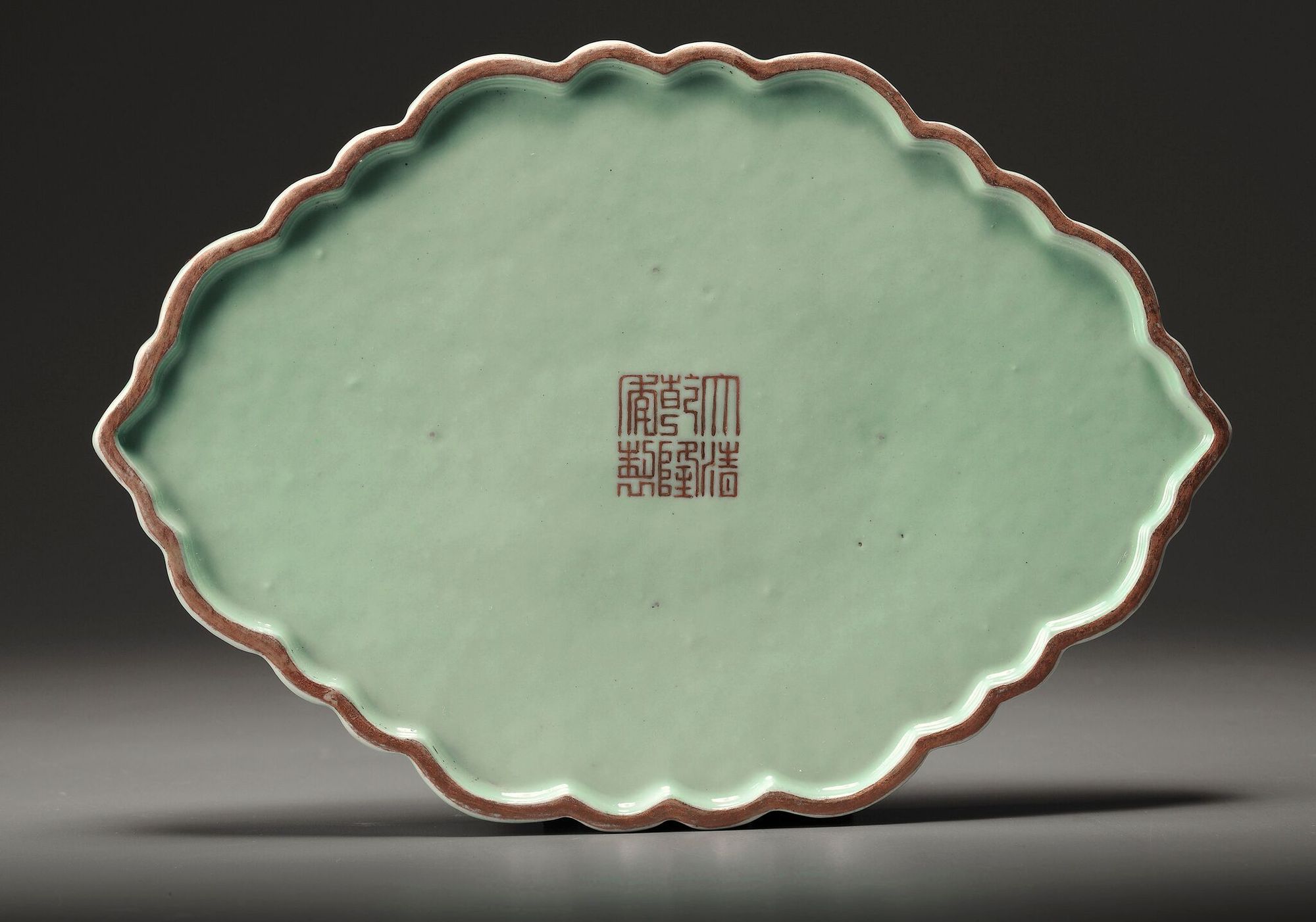 the box and cover are well-potted in a pecan-shape with foliate rims. The cover is decorated at the center with a Tai Chi symbol along with corresponding Ba Gua Zhang, enclosed by a meandering famille rose motif of lotus flowers on scrolling stems, and a border of conjoining ruyi-heads, reserved on a light turquoise enamel ground. The sides of the box and the cover are decorated with a border of floral motifs outlined in gilt, against a turquoise enamel ground with Qianlong Incised and Gilt Six-Character Seal Mark to the base.
