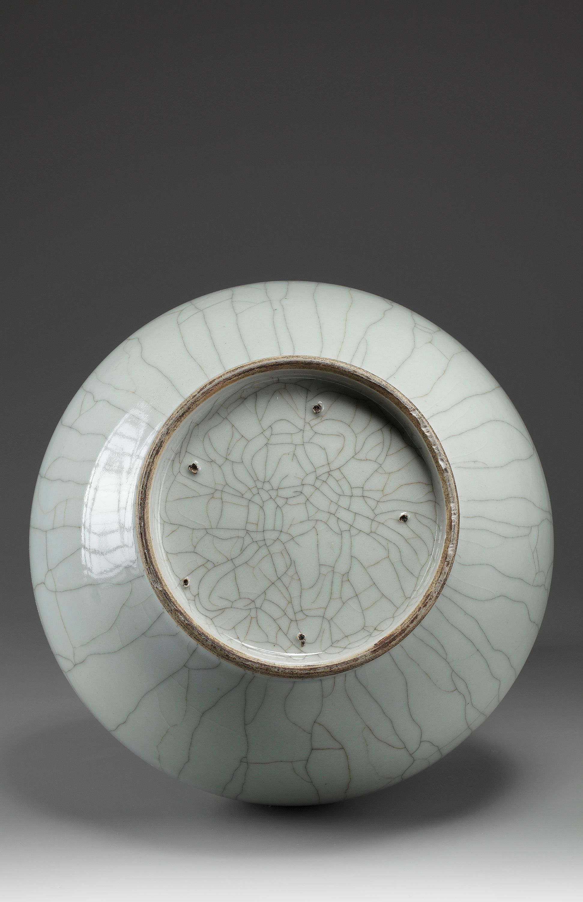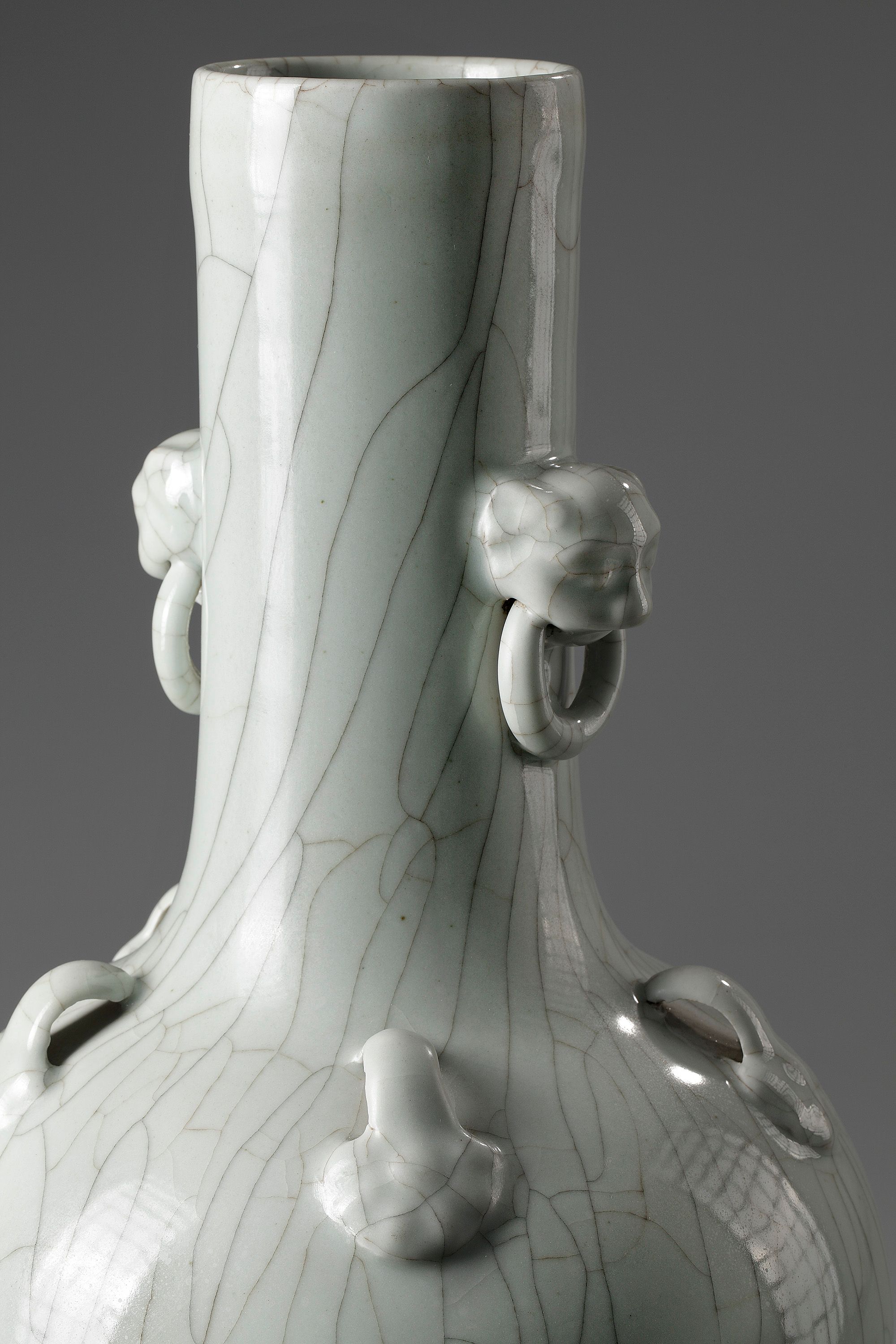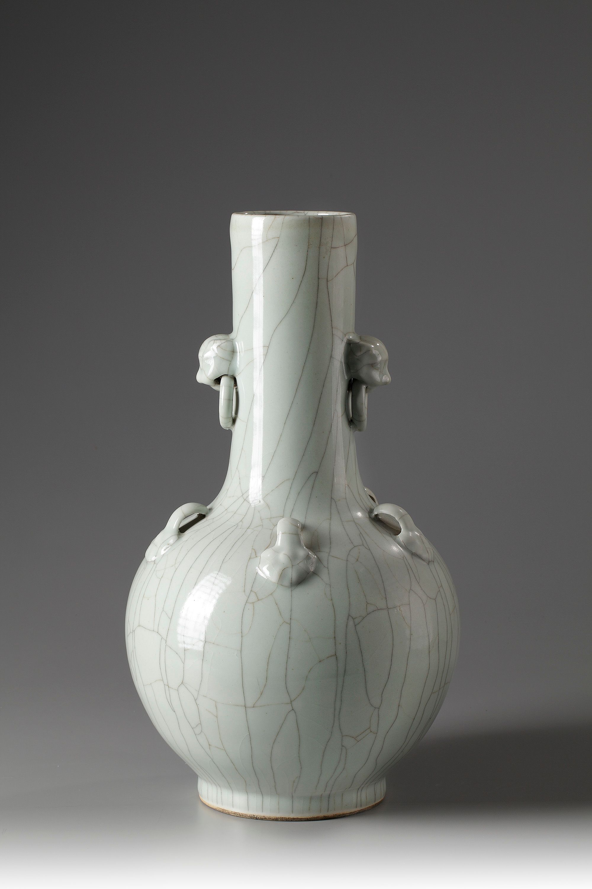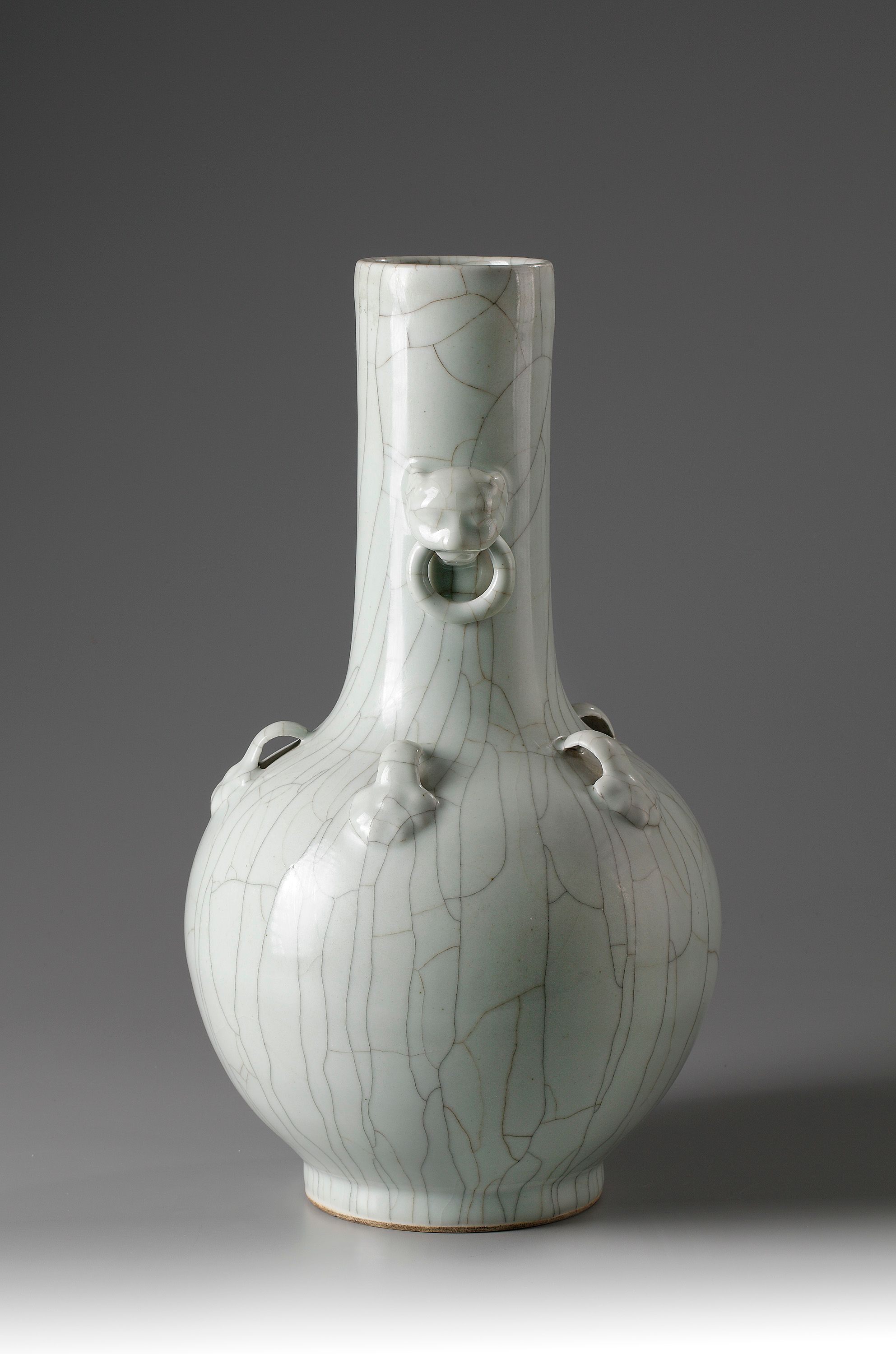 The long neck decorated with two applied fixed-ring beast-head handles. Five moulded loop handles adorn the shoulder. The body is covered overall with a thick glaze with fine crackles, the base with spur marks.