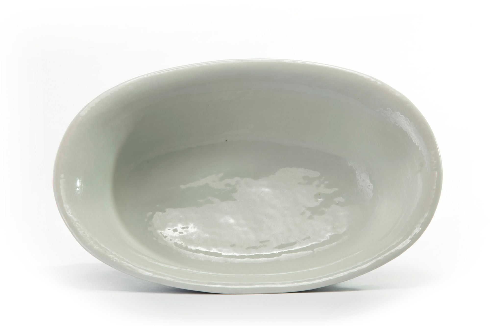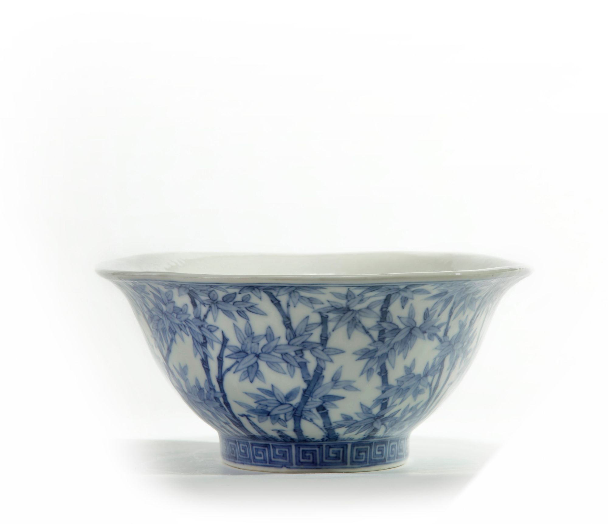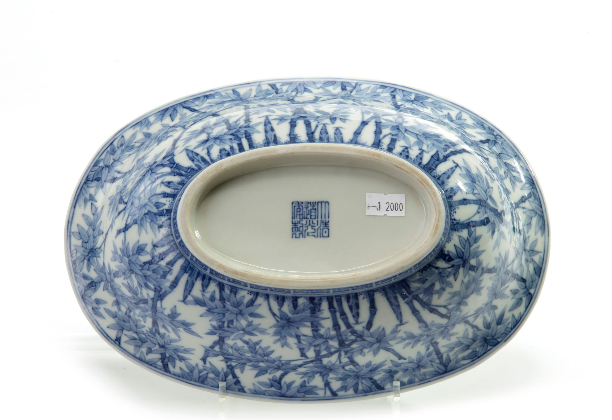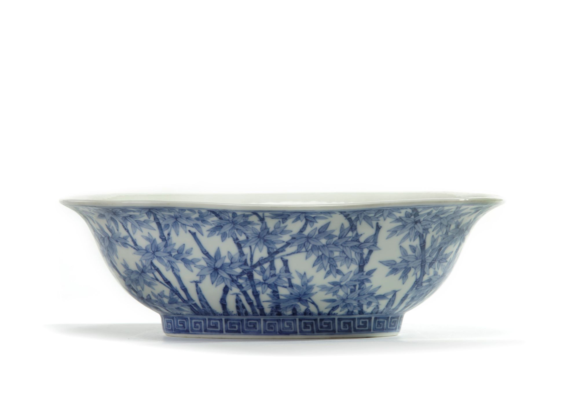 The oval-shaped bowl is decorated with a continuous band of bamboo stalks, all above a square scroll band to the foot. The base with an apocryphal Daoguang seal mark.