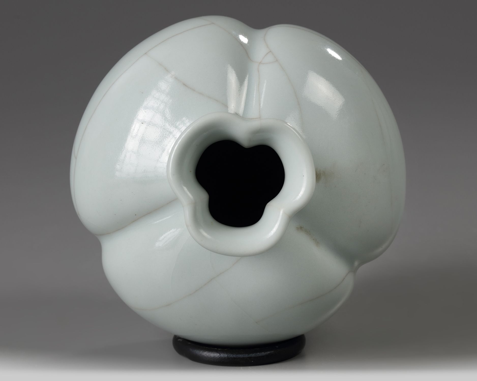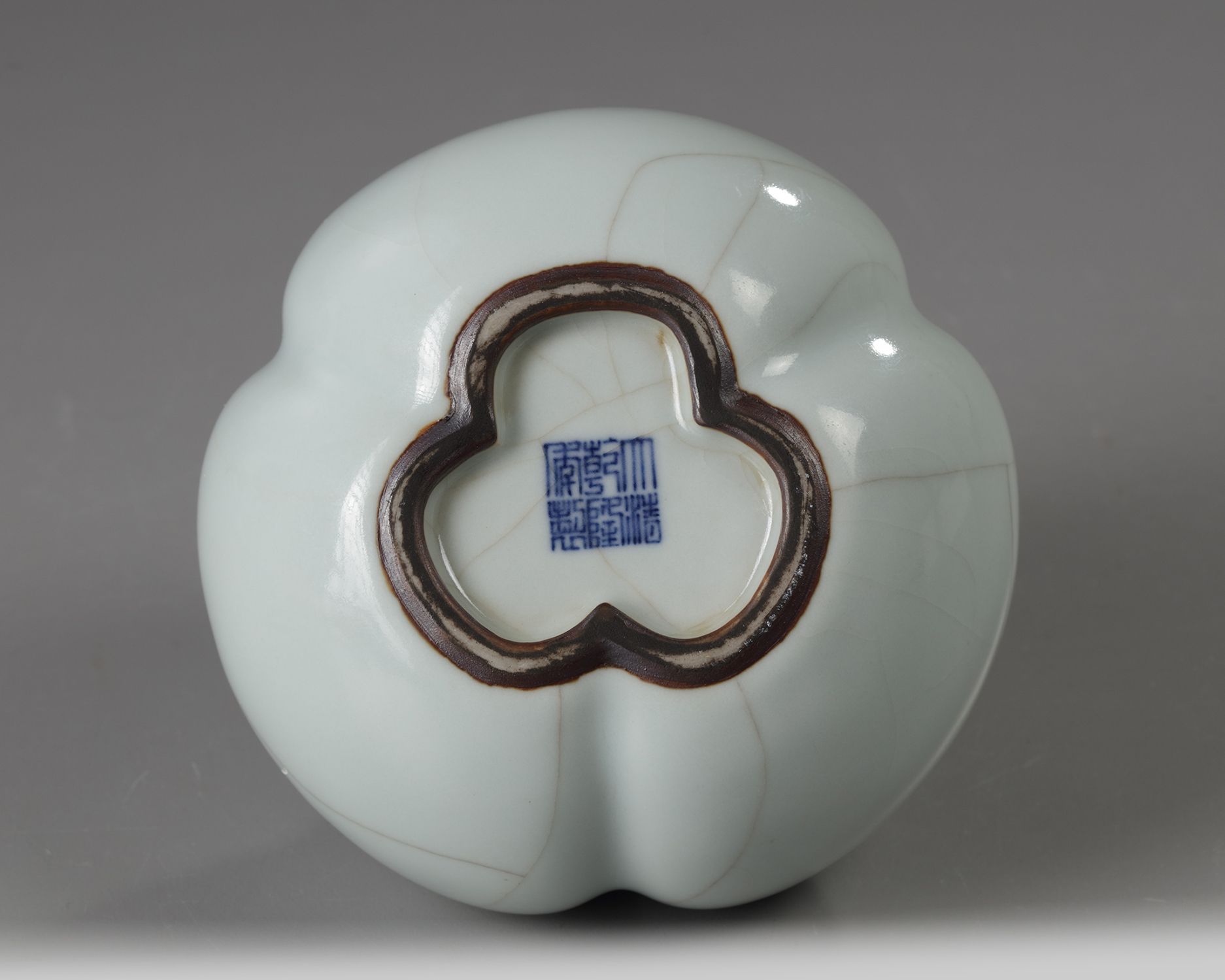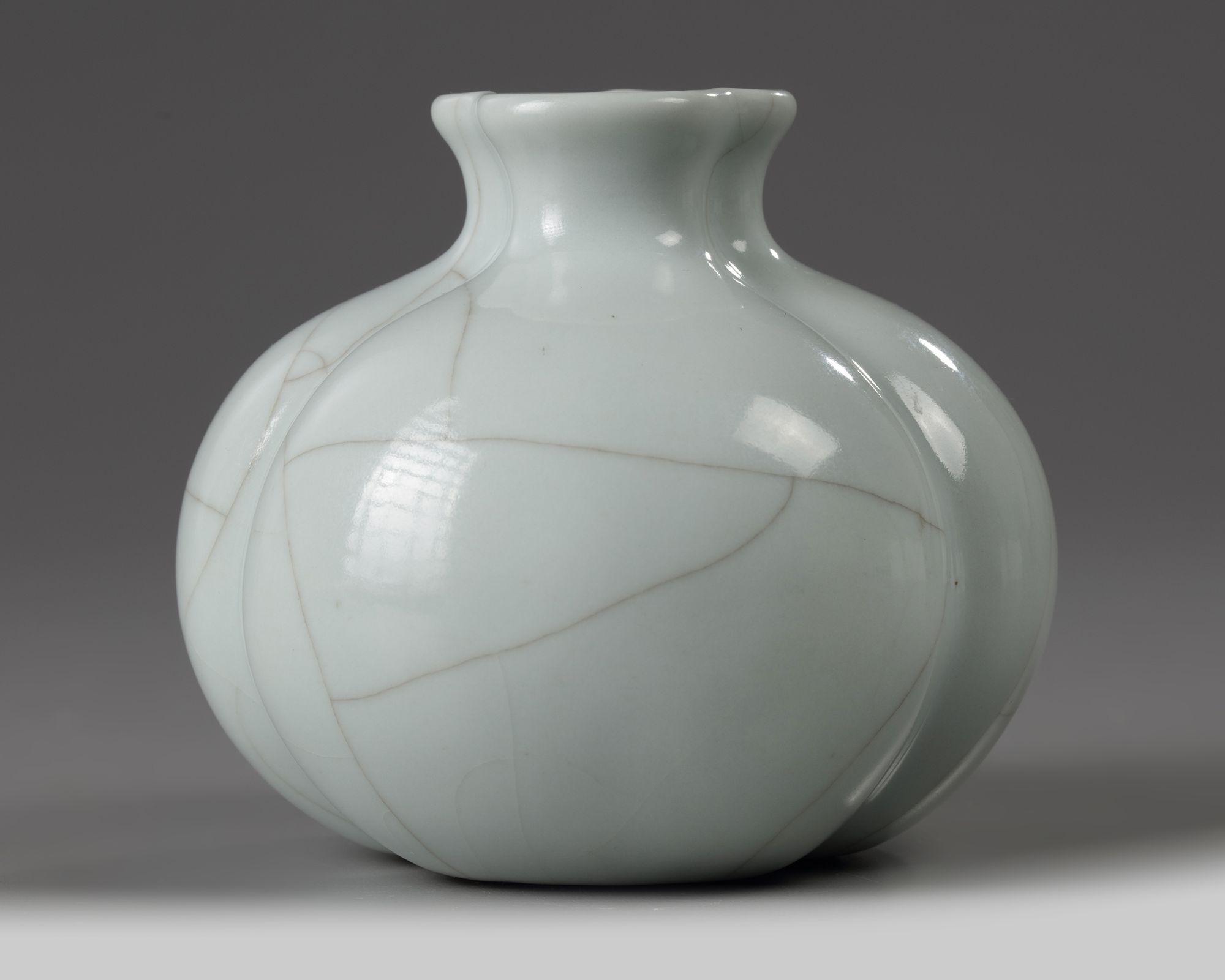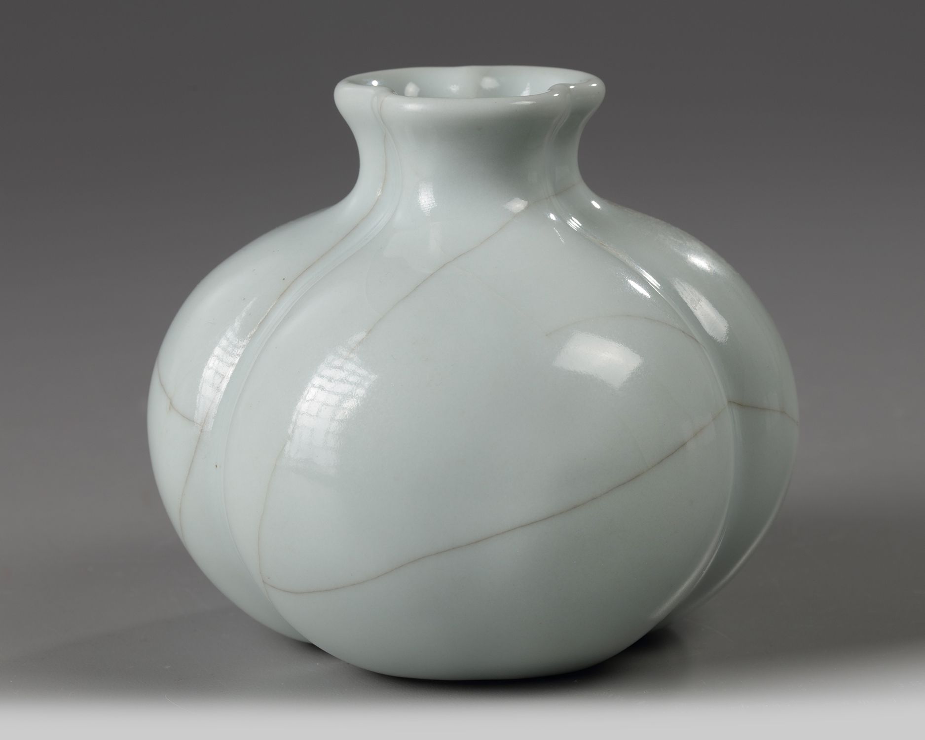 The small jar is moulded into three lobes with a narrow neck and slightly flaring rim. It is covered overall with a pale celadon glaze suffused with crackles. The base with an apocryphal Qianlong mark.