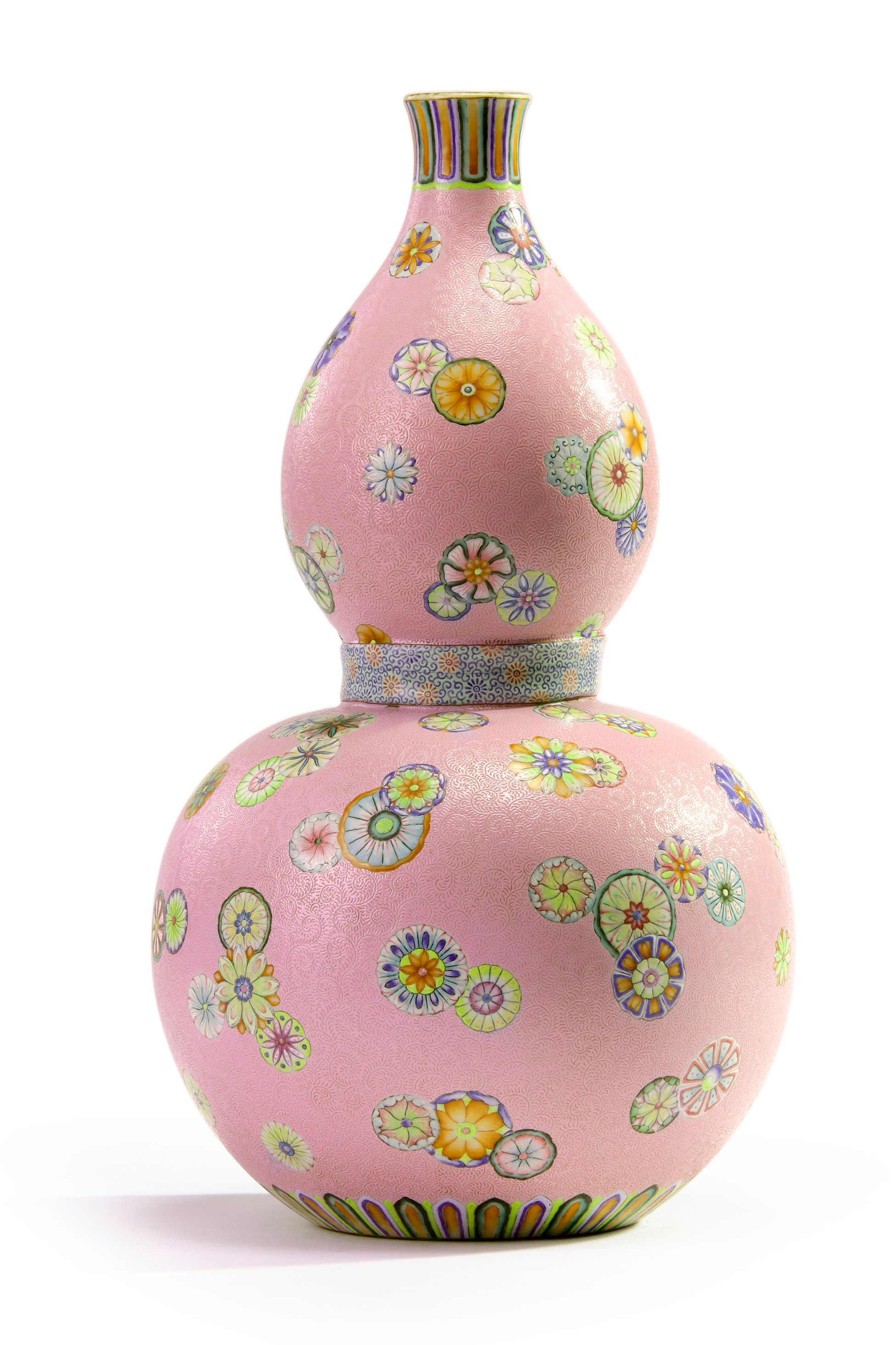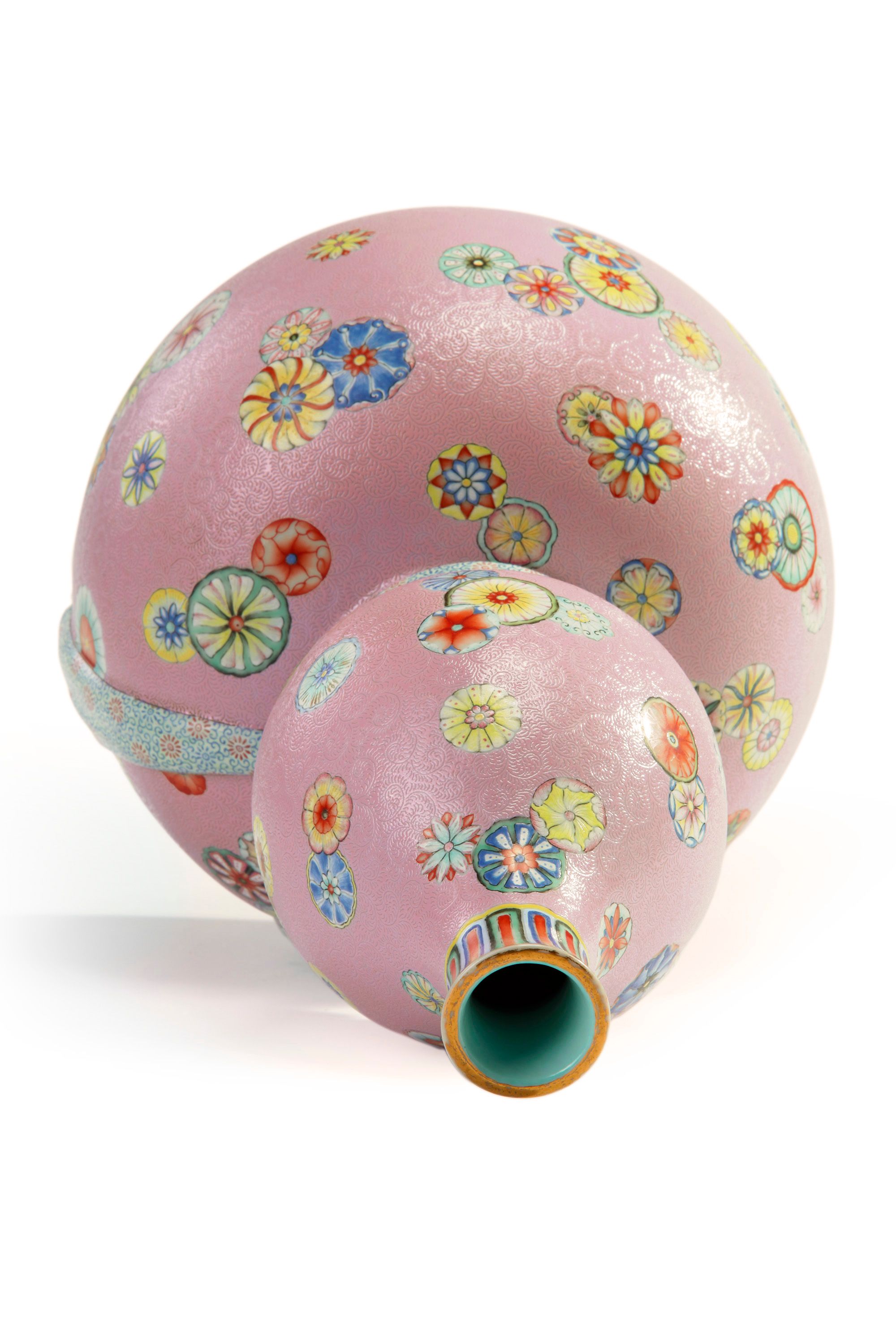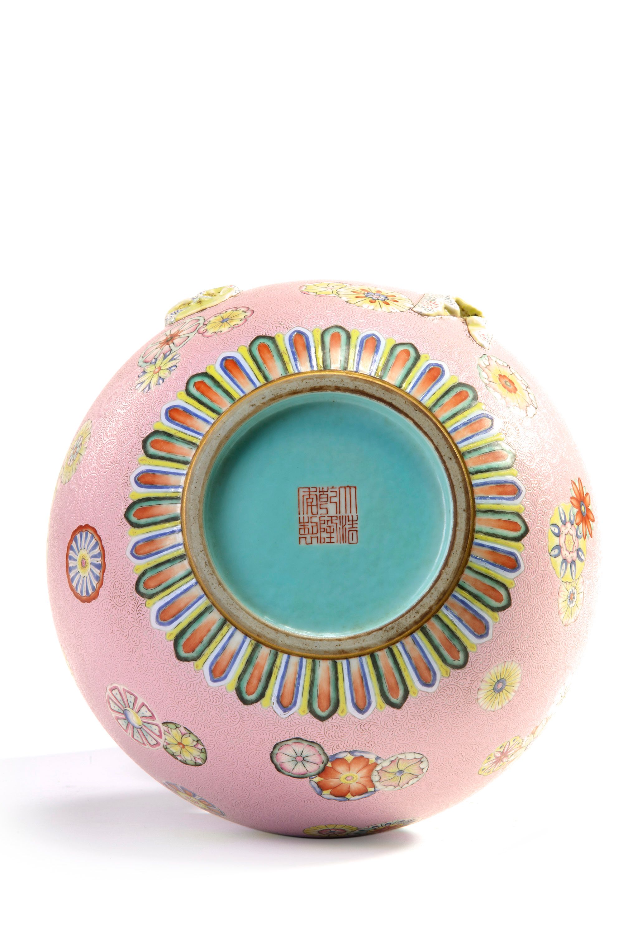 The vase is delicately decorated with various groups of flower roundels scattered on the upper and lower body, all between a lappet band to the rim and foot. The slender waist is decorated with a bow imitating a tied ribbon decorated with flower scrolls. The interior and base are enamelled turquoise with an apocryphal Qianlong mark.