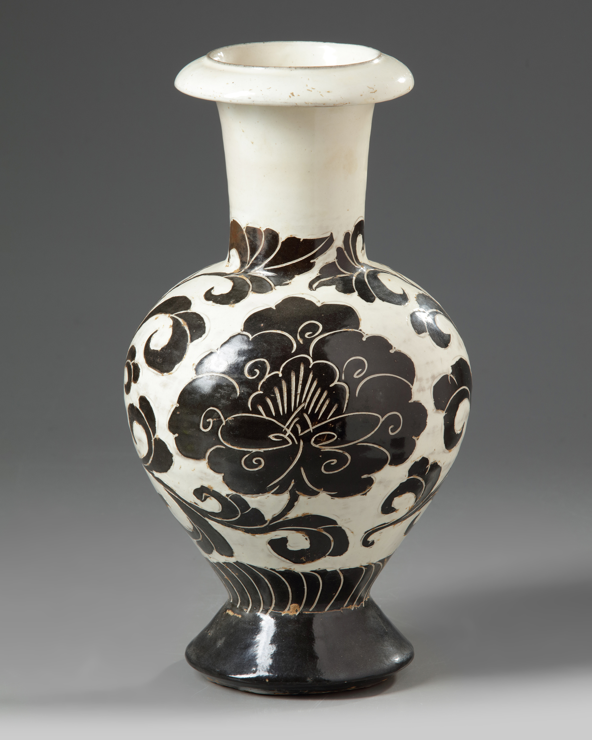 The vase is well carved on the globular body and trumpet-form neck with a broad band of peony scroll bearing two large blossoms framed by leafy, curving stems above a band of narrow petals below, all in dark brown reserved on a white slip ground and covered with a clear glaze.