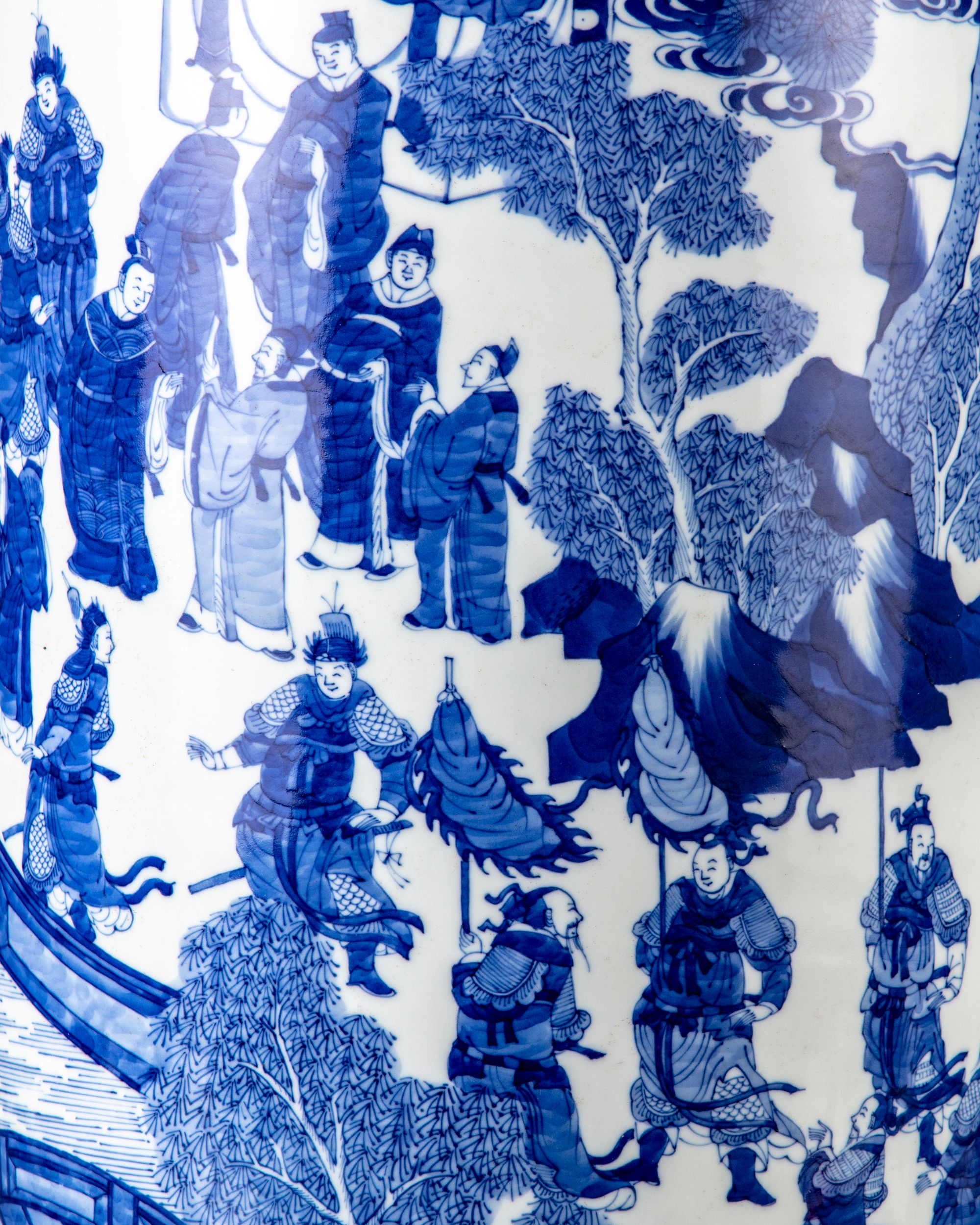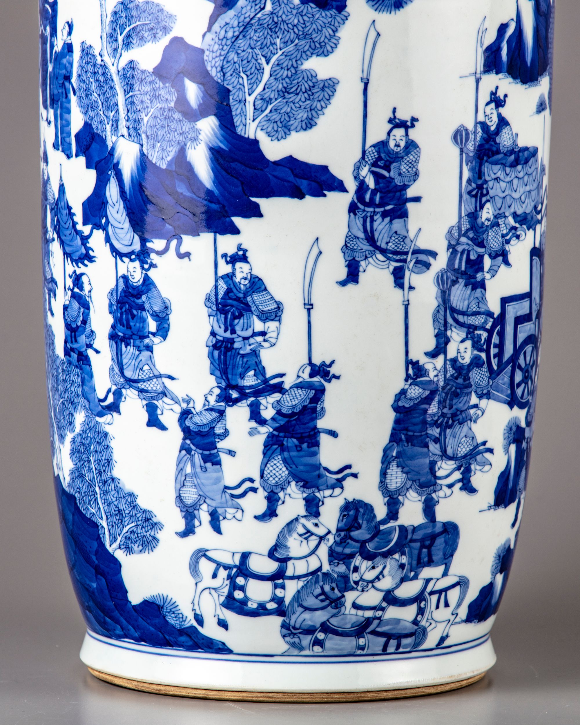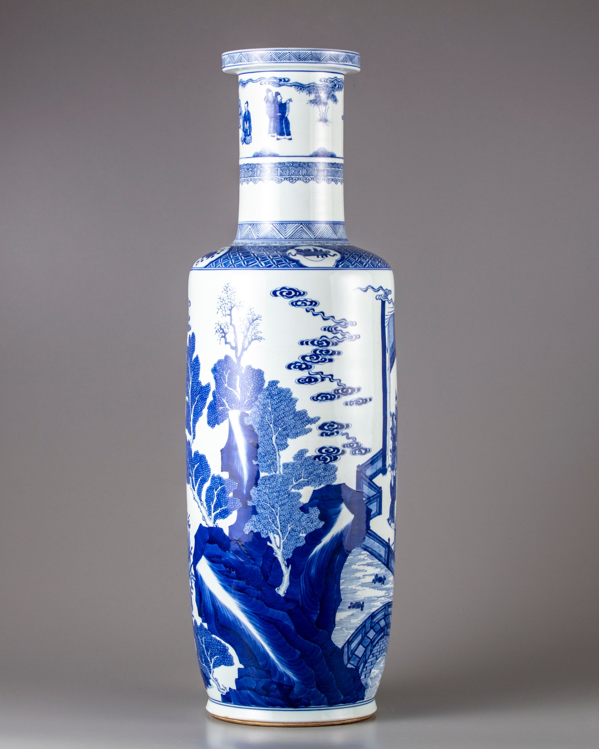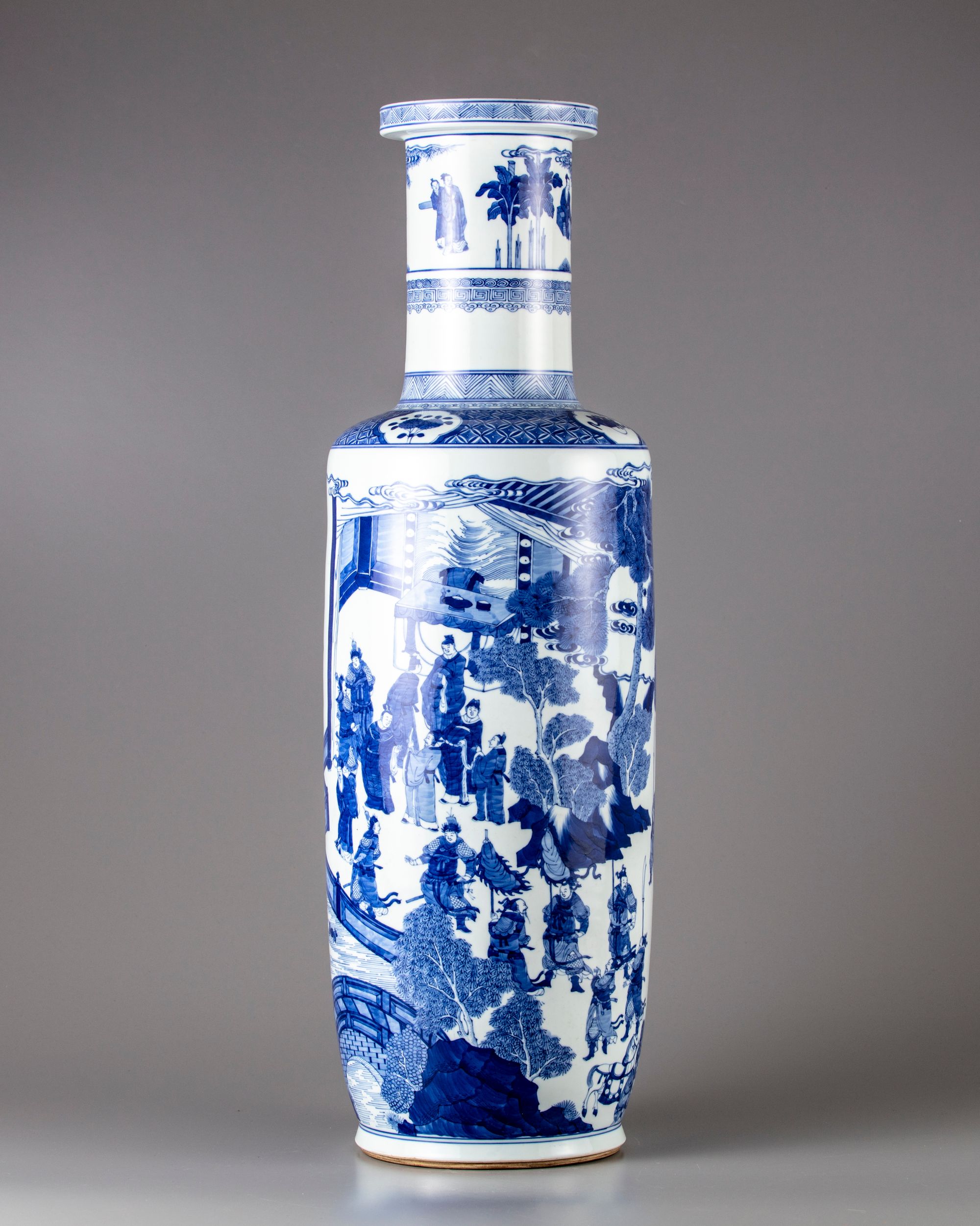 The tall rouleau vase is decorated to the body with a continuous court scene, the shoulder with a diaper band containing cartouches of precious objects and flower. The neck with a continuous scene of figures in a landscape. The bottom with a Kangxi six character mark.
