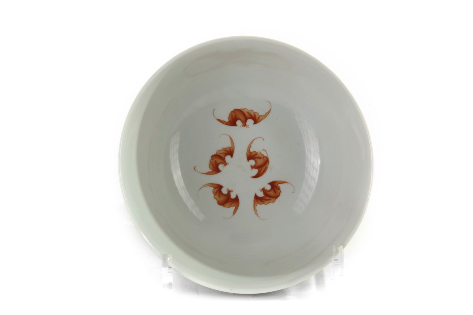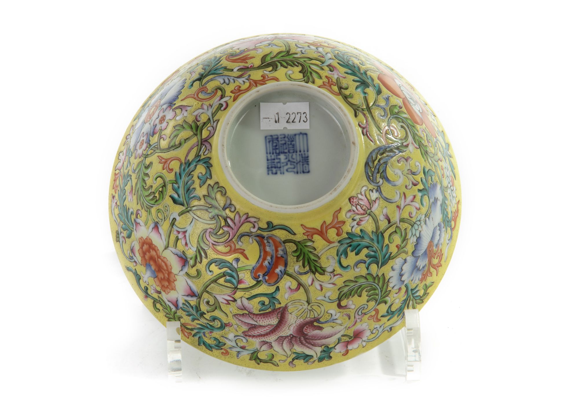 This delicately potted bowl has rounded spreading sides and stands on a tapering foot ring, the exterior is elaborately decorated with six large stylised flowers on leafy scrolling stems reserved on a rich lemon-yellow ground. The interior is decorated with five iron-red bats (wufu) in flight in the centre. With an apocryphal Daoguang seal mark to the bottom.