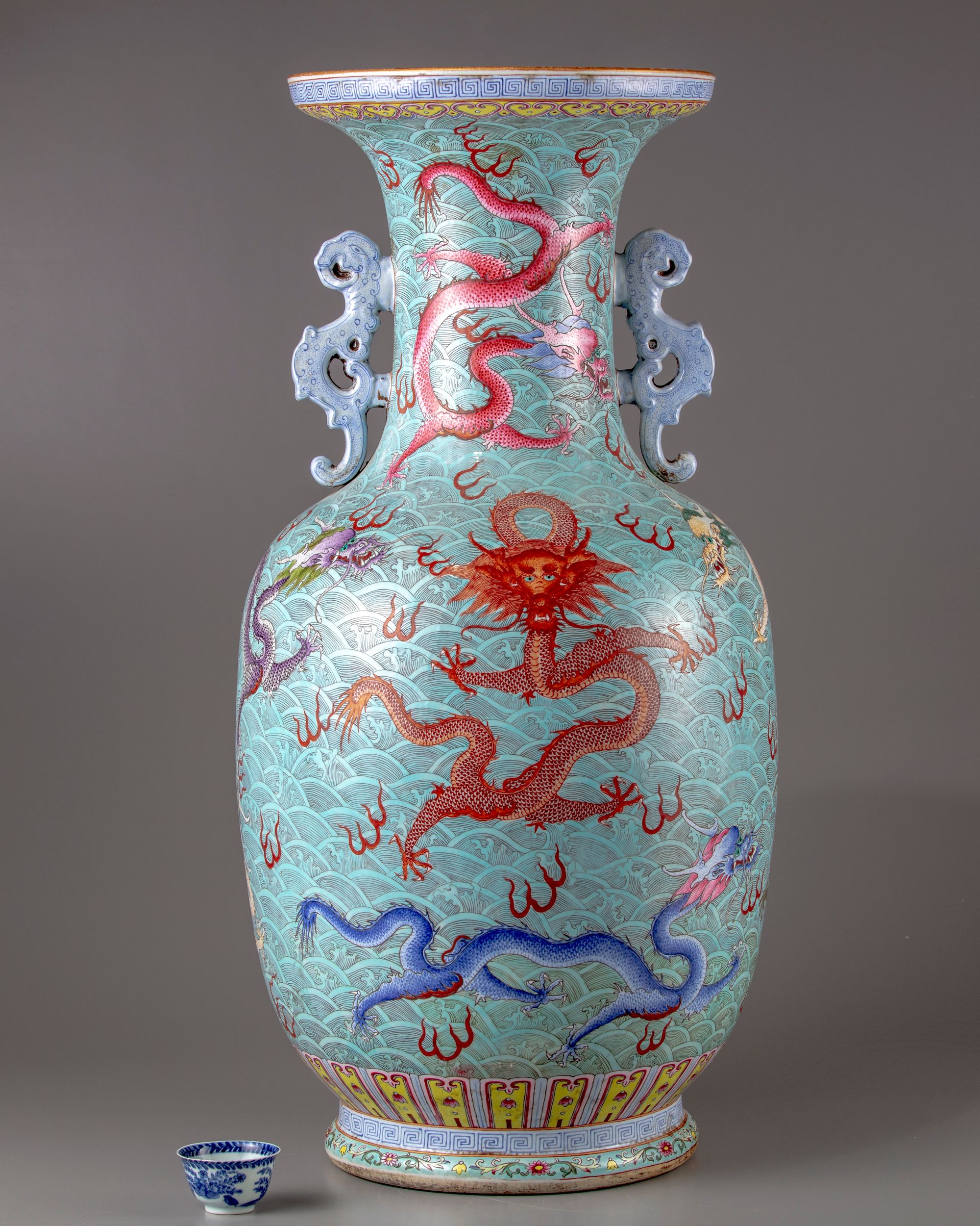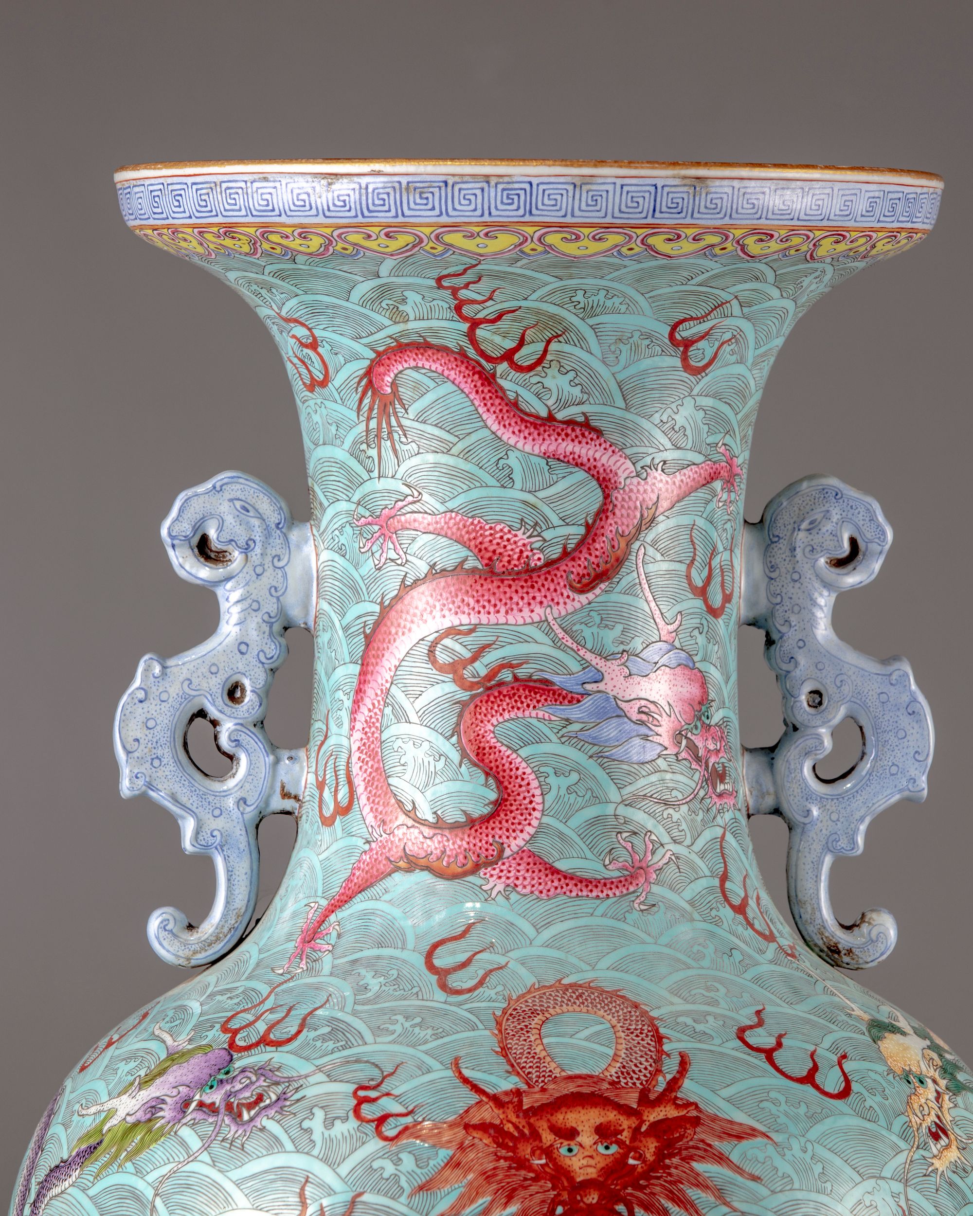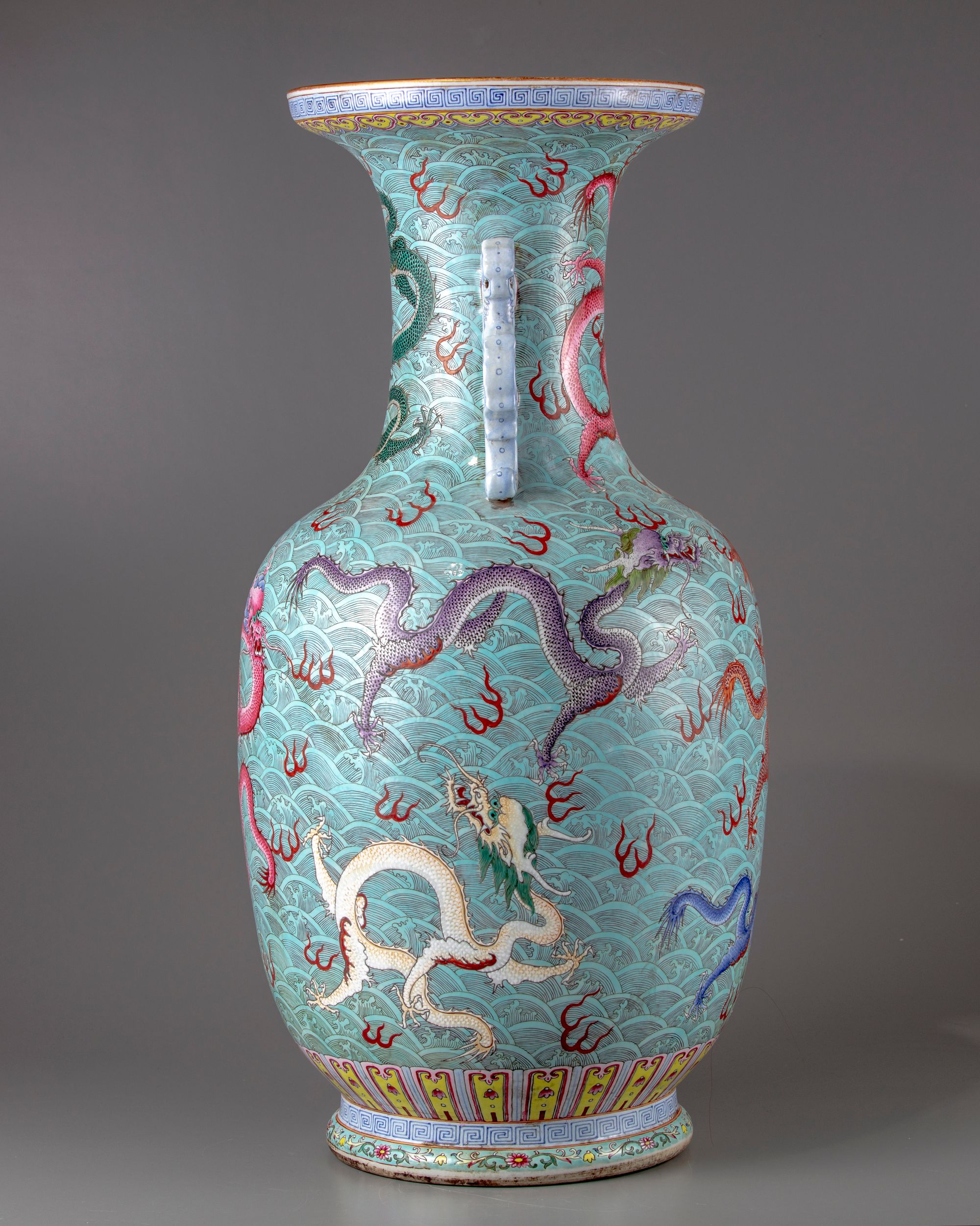 The large faille rose vase is decorated with two elephant shaped handles ,further finely enamelled with five clawed dragons in a variety of postures amongst Fu bats on a wavy background.All set below a key fret chain and a band of ruyi heads to the rim.The base with a petal border above a key fret chain.The bottom with a Qianlong seal mark on a glazed background.