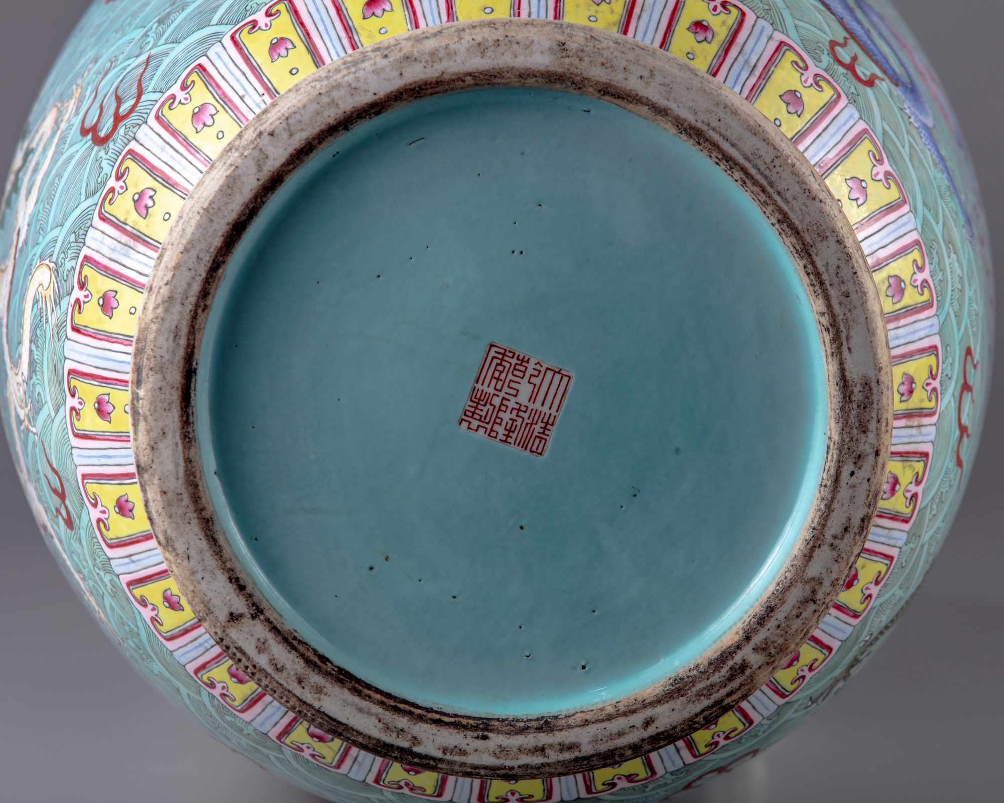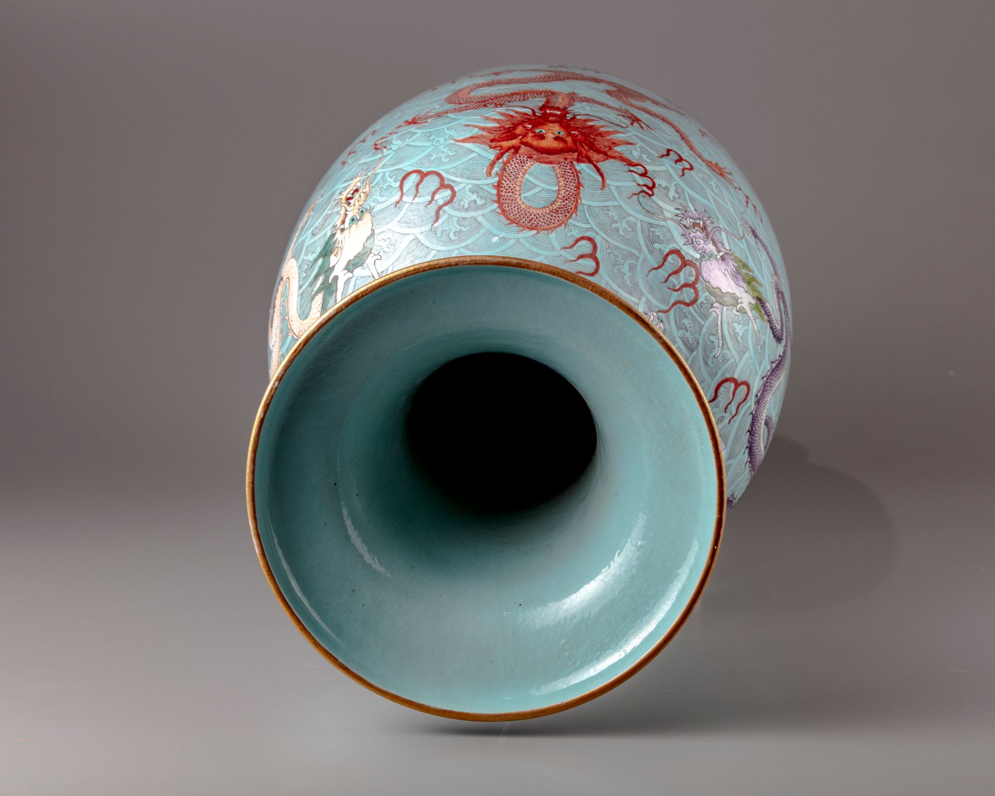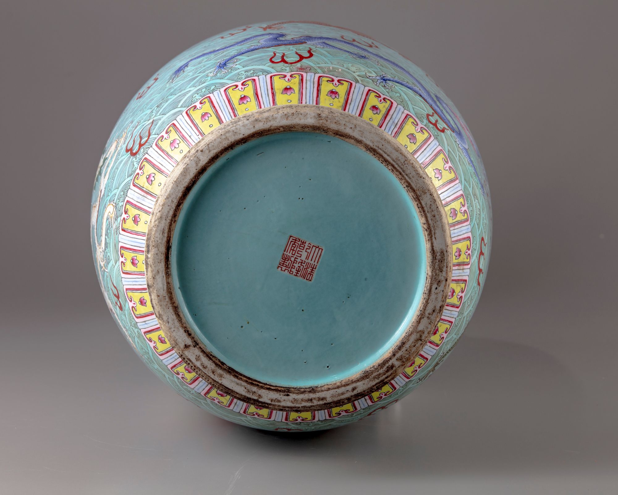 The large faille rose vase is decorated with two elephant shaped handles ,further finely enamelled with five clawed dragons in a variety of postures amongst Fu bats on a wavy background.All set below a key fret chain and a band of ruyi heads to the rim.The base with a petal border above a key fret chain.The bottom with a Qianlong seal mark on a glazed background.