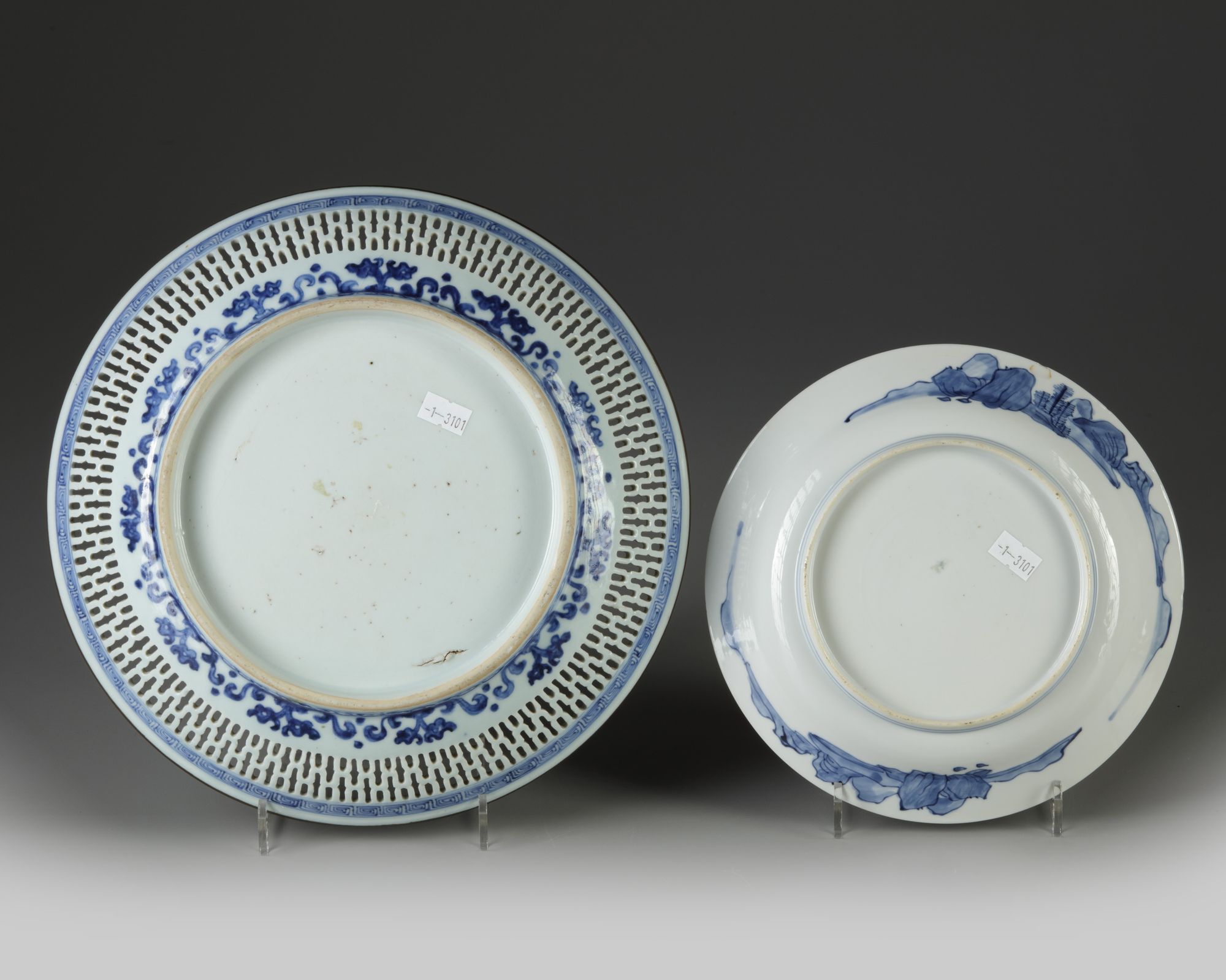 The first is a dish decorated in the 'Master of the Rocks' style, depicting a scholar and attendant holding a qin below a gnarled pine tree amongst rocks and mountains in a river landscape. The second is a charger decorated to the centre with figures in a mountainous river landscape surrounded by a diaper band. The cavetto is delicately pierced with an openwork basket design, all below a keyfret band to the rim, which is bound with a metal band. The reverse is decorated with a stylised scroll band and further keyfret band.