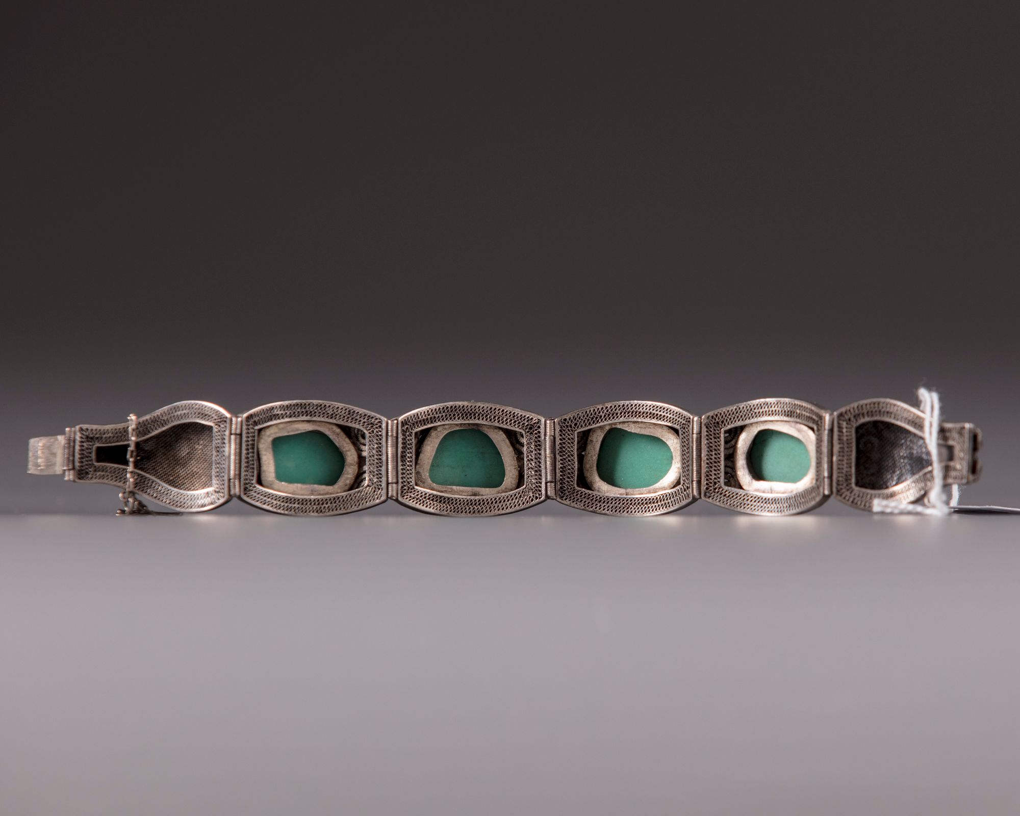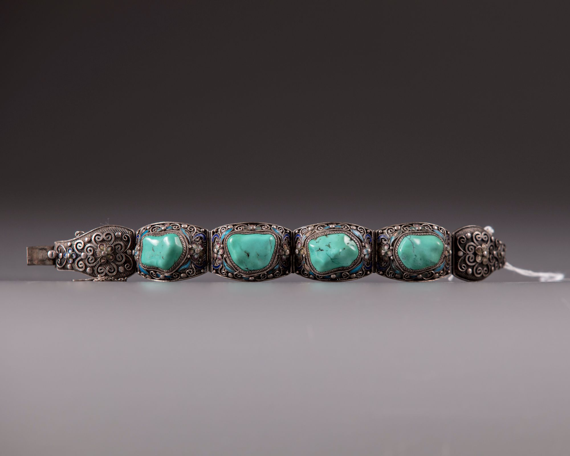 The silver bracelet is decorated with blue and purple enameled flowers and turquoise inlay.
