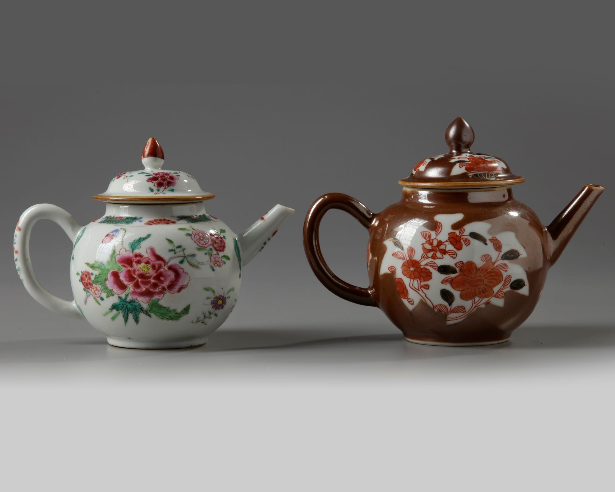 The 'Batavia ware' teapot is decorated to both sides with leaf-shaped panels enclosing iron red and black-enamelled flowers, with a further panel below the spout enclosing persimmons. the domed cover is similarly decorated and is surmounted by a lotus bud finial. The famille rose teapot is boldly decorated with large scattered peony sprays amongst scattered flowers below a diaper band with half-floral cartouches. The rim is decorated with further flower sprays and is surmounted by an iron-red lotus bud finial.