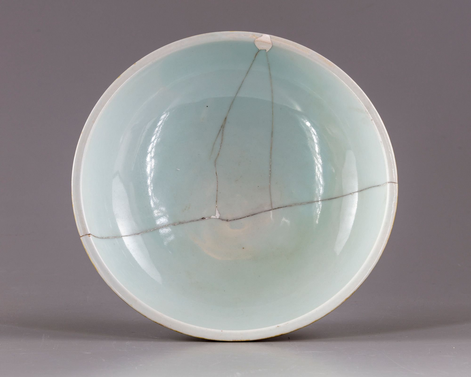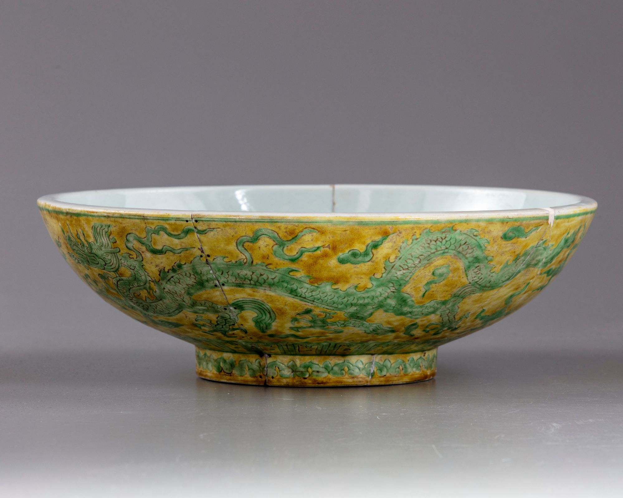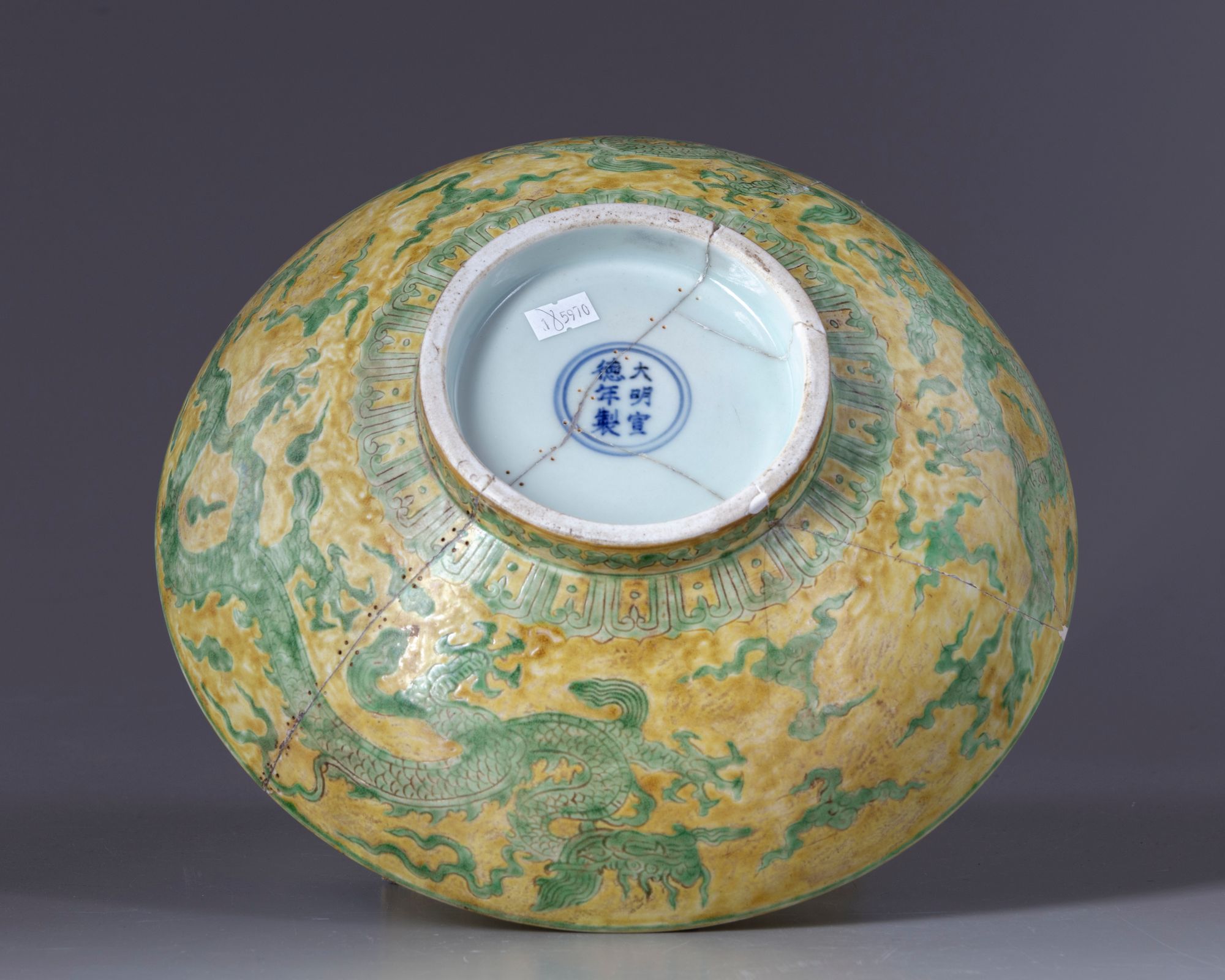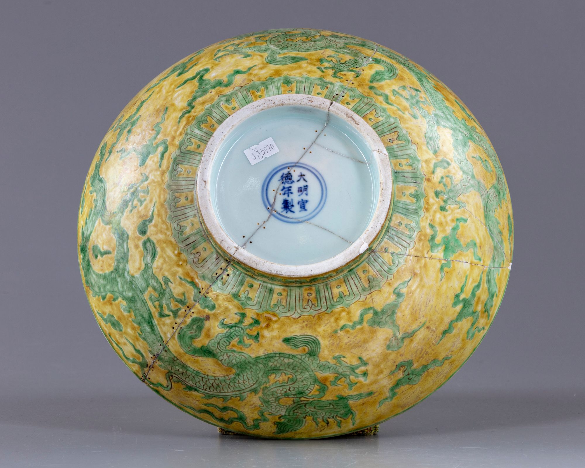 A large Chinese yellow-ground green decorated 'dragon' bowl