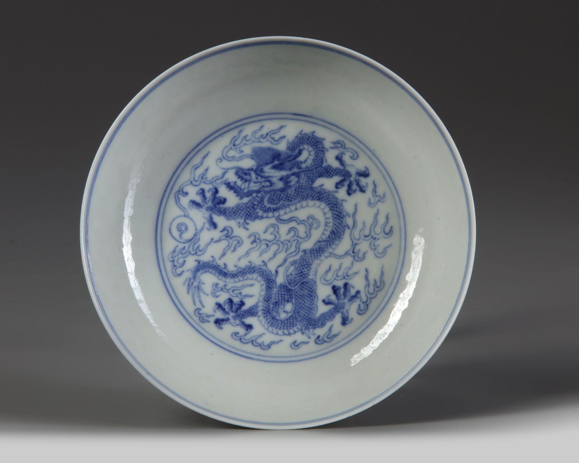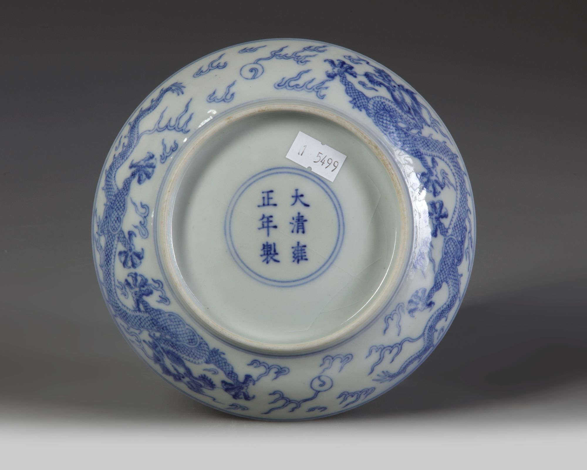 The dish is finely decorated to the centre with a dragon chasing the flaming pearl amongst flower scrolls. The exterior decorated with two striding dragons chasing the flaming pearl. Yongzheng six-character mark in underglaze blue within a double circle and of the period (1723-1735) Catalogue notes: Compare a 'dragon' dish with a similar shade of cobalt blue and design in the National Gallery of Victoria, Melbourne, accession no. 4338-D3.