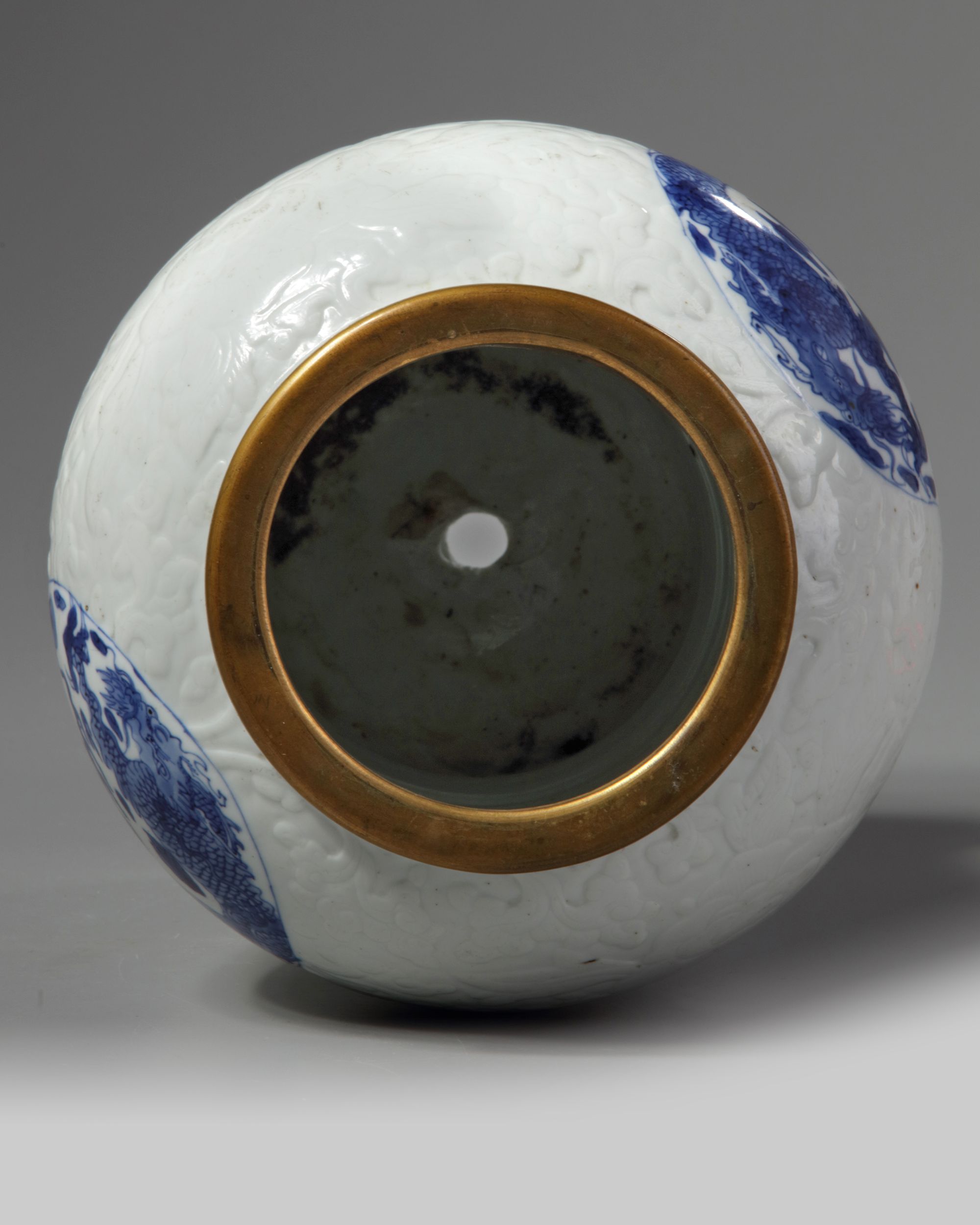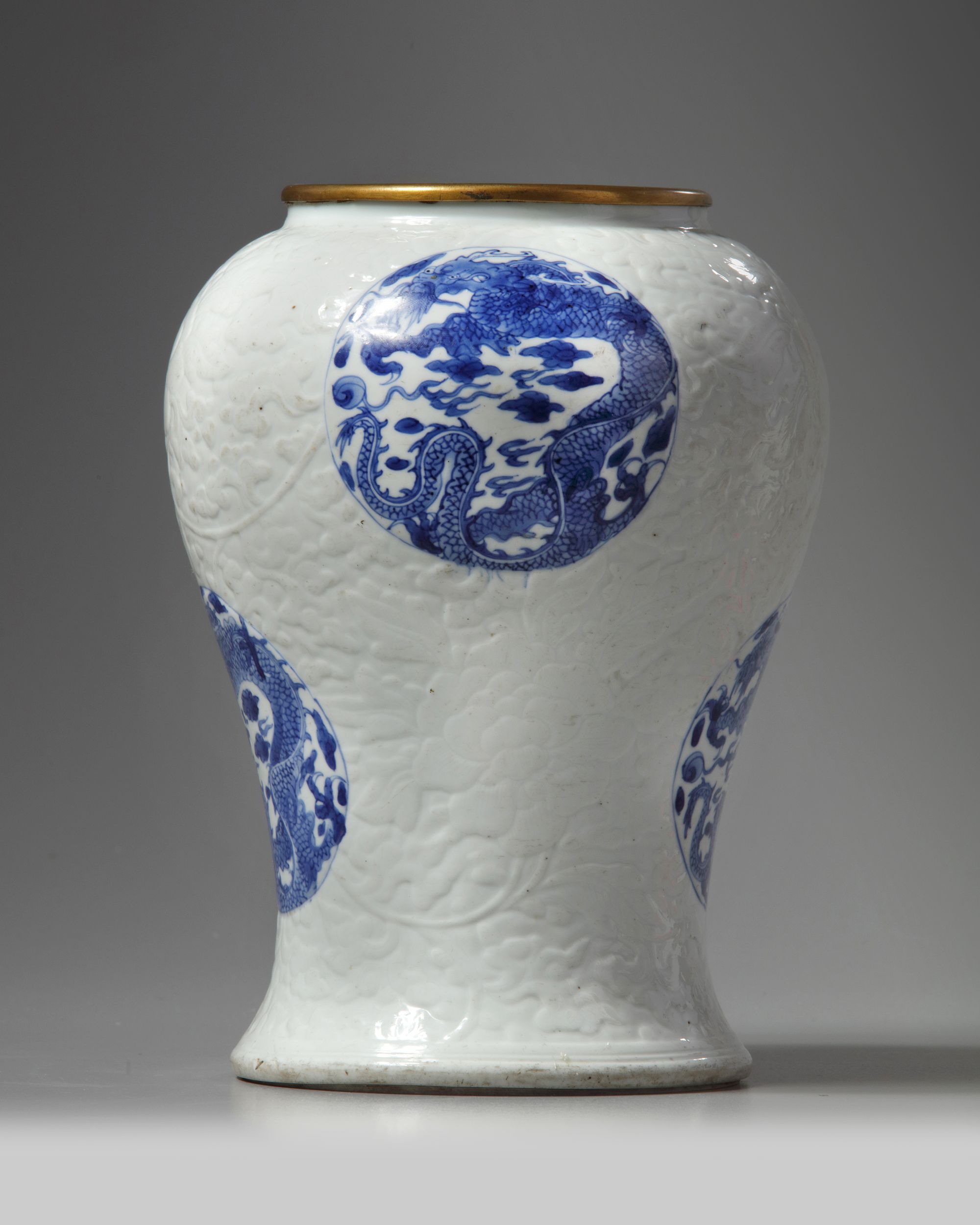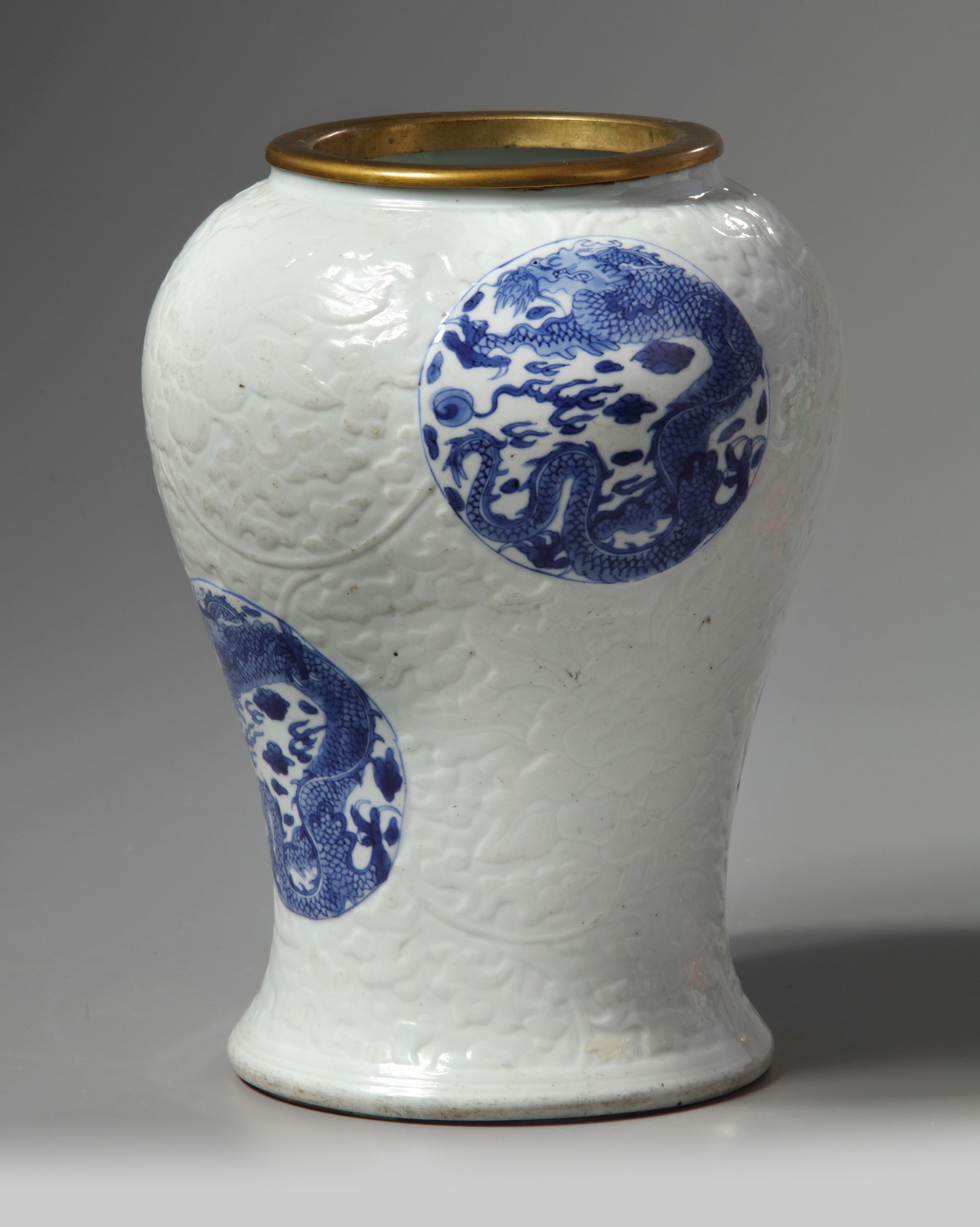 The vase is finely decorated with four roundels each enclosing a four-clawed dragon chasing the flaming pearl, all reserved on a carved and moulded white-glazed ground of densely scrolling leafy peonies. The rim is mounted in gilt metal.