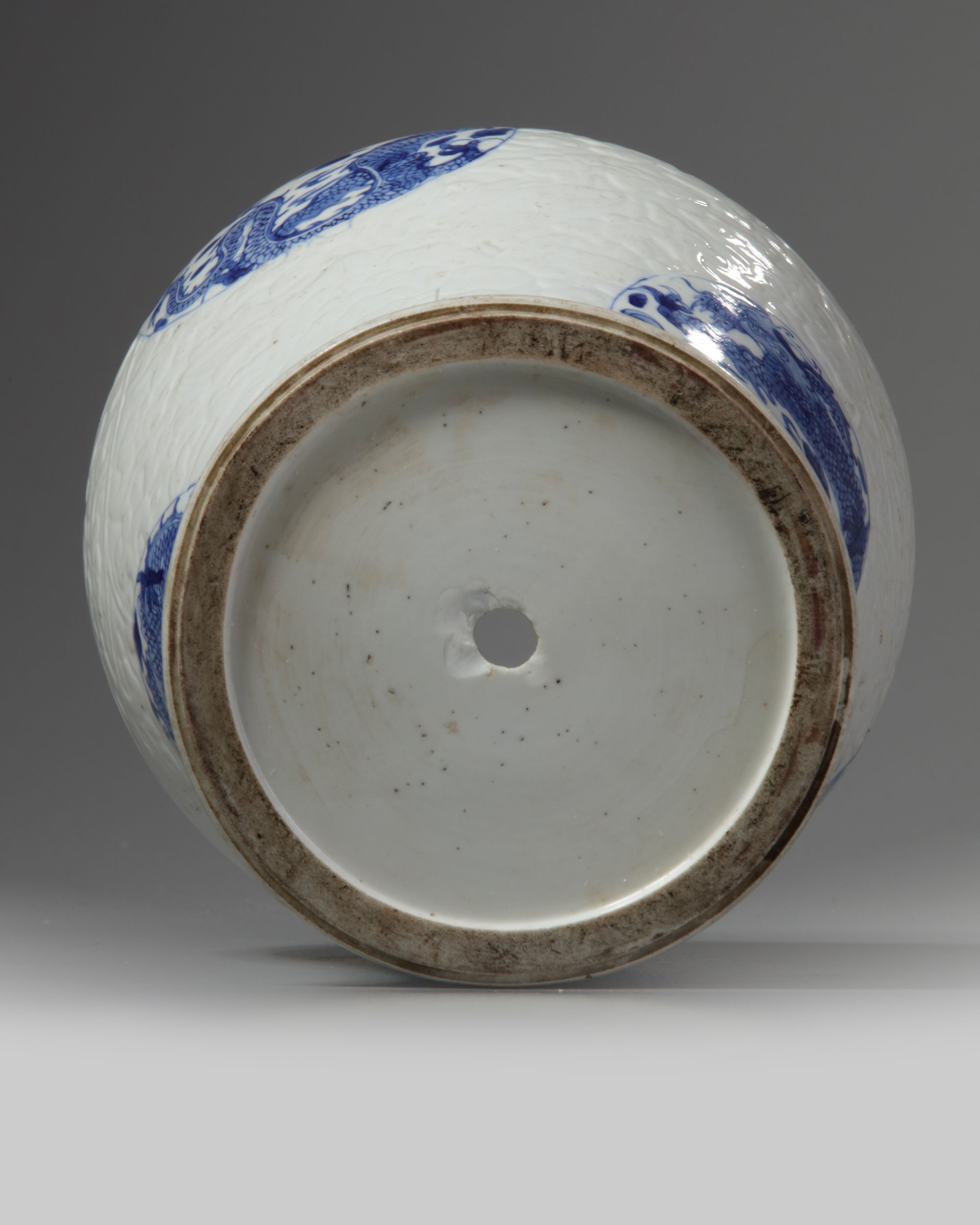 Catalogue notes: It is rare to see this type of blue and white vase with a moulded peony ground, but when they do appear, they can picture dragons, figures, and landscape panels on a ground of white glaze (like the present lot) or celadon.
