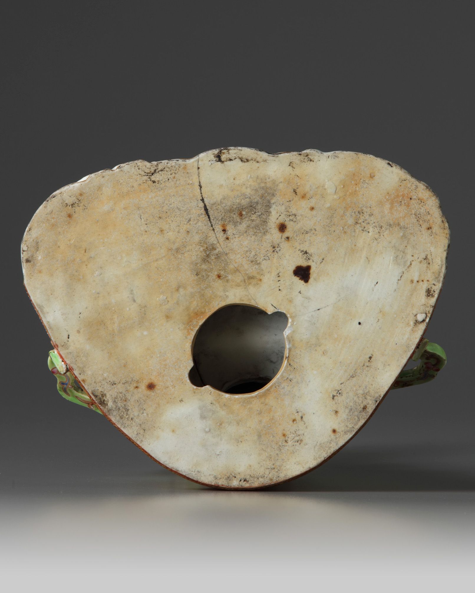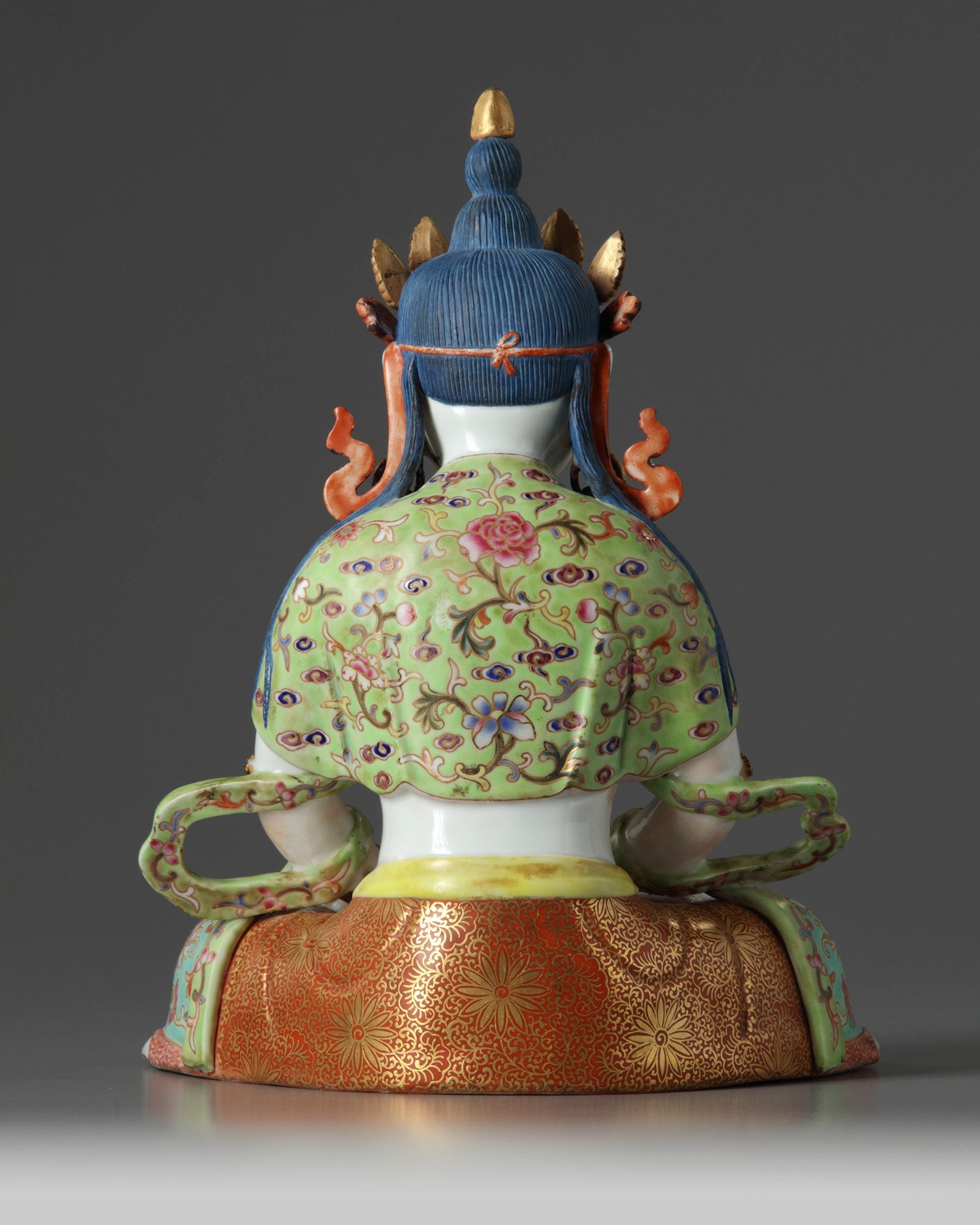 The figure is modelled with a serene expression on his face, with his hair piled high behind a diadem. He wears a shawl and celestial scarves which billow out at the elbows. His hands are held in front of him and he is seated in dhyanasana.