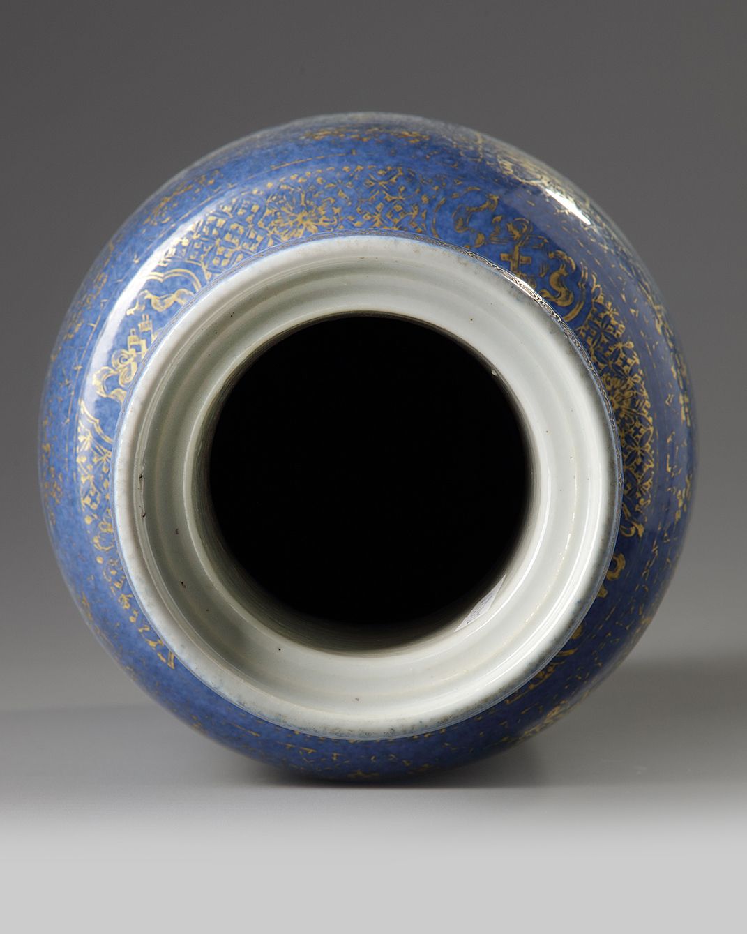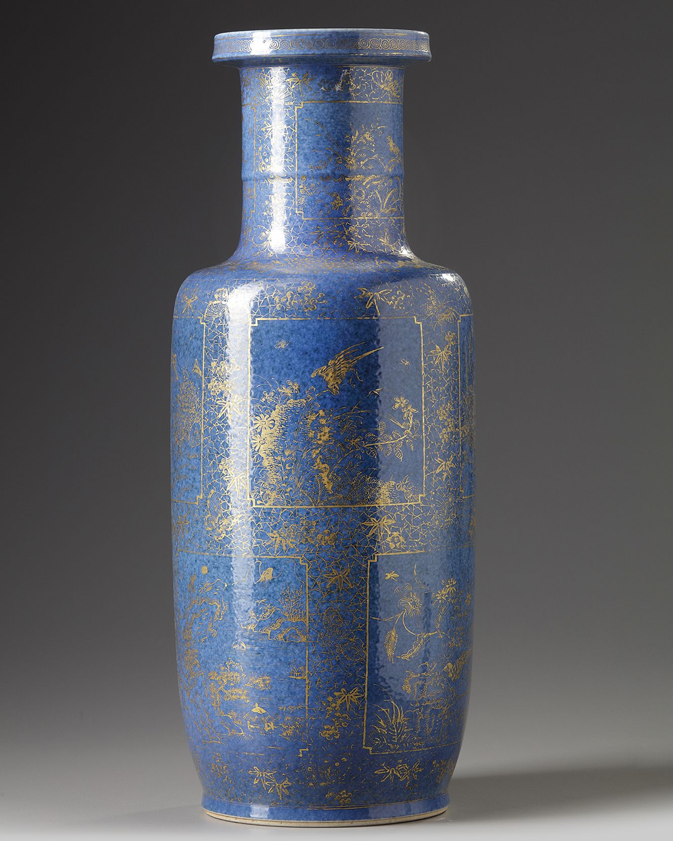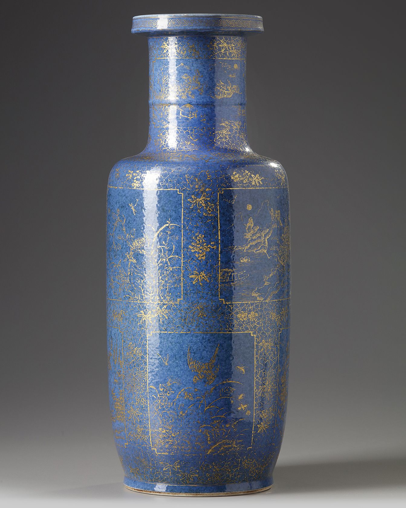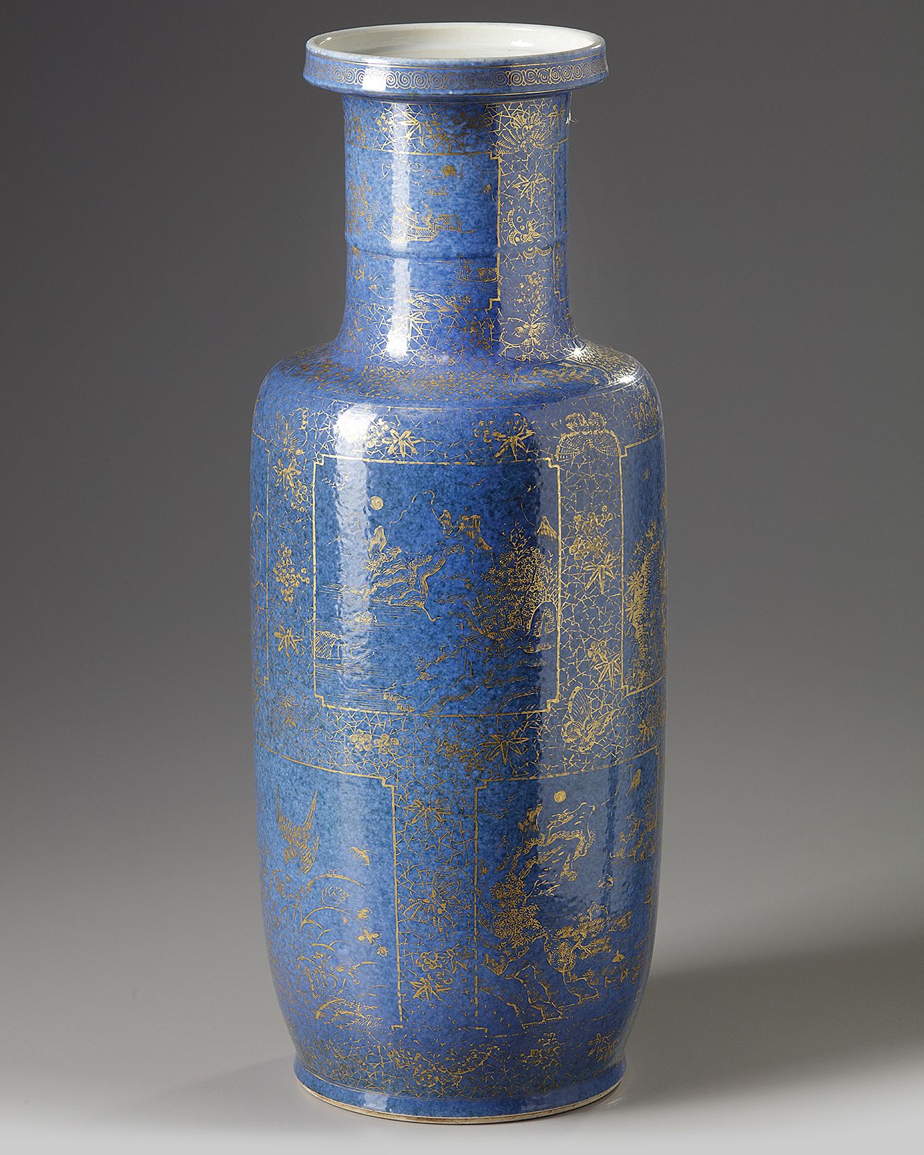 The vase is decorated to the neck and body in gilt with panels enclosing mountain landscapes and birds and flowers, the shoulder is decorated with four scholar's objects reserved on a trellis band, all reserved on a cracked ice pattern on a mottled blue ground. 48 cm high.