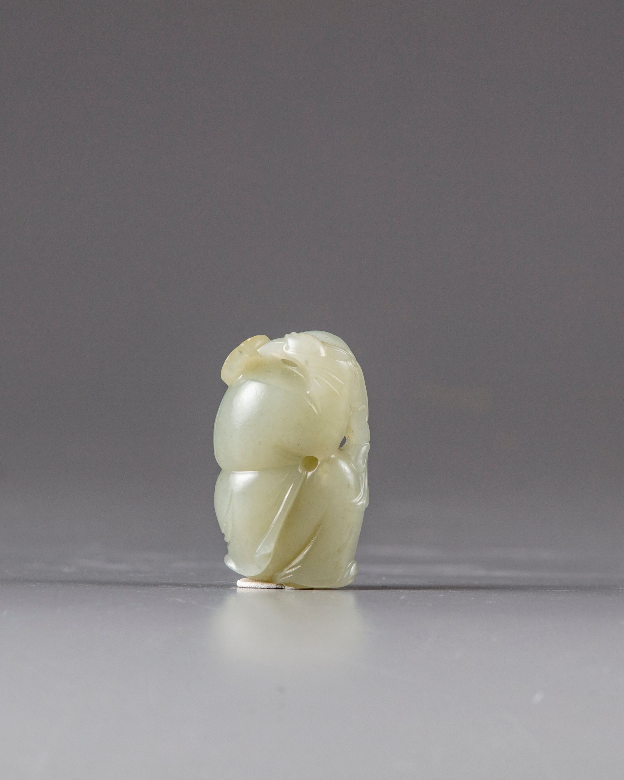 A pale celadon jade carving of a boy holding a ruyi sceptre over his shoulder. The stone is of pale celadon tone with minor russet inclusions.