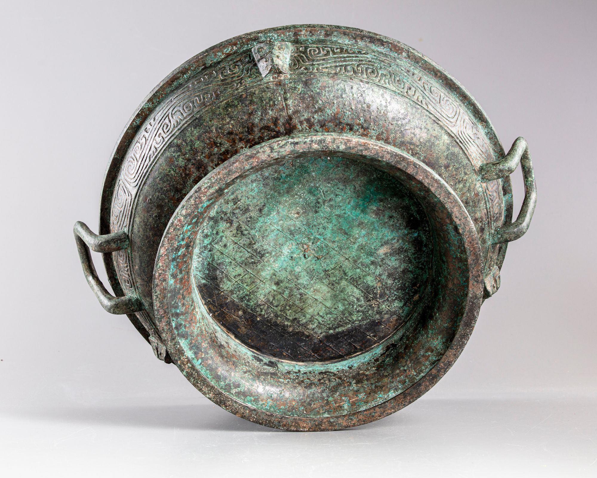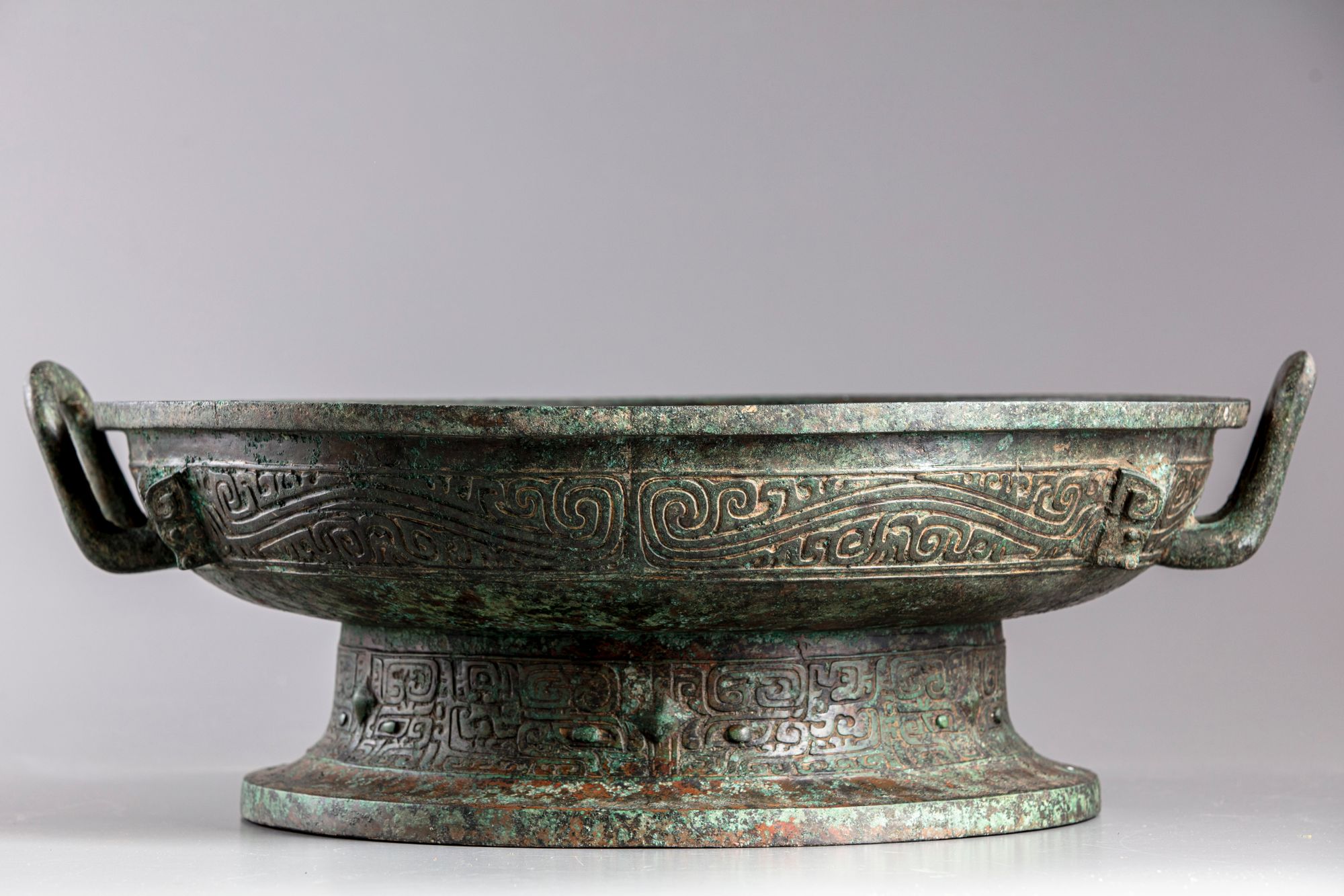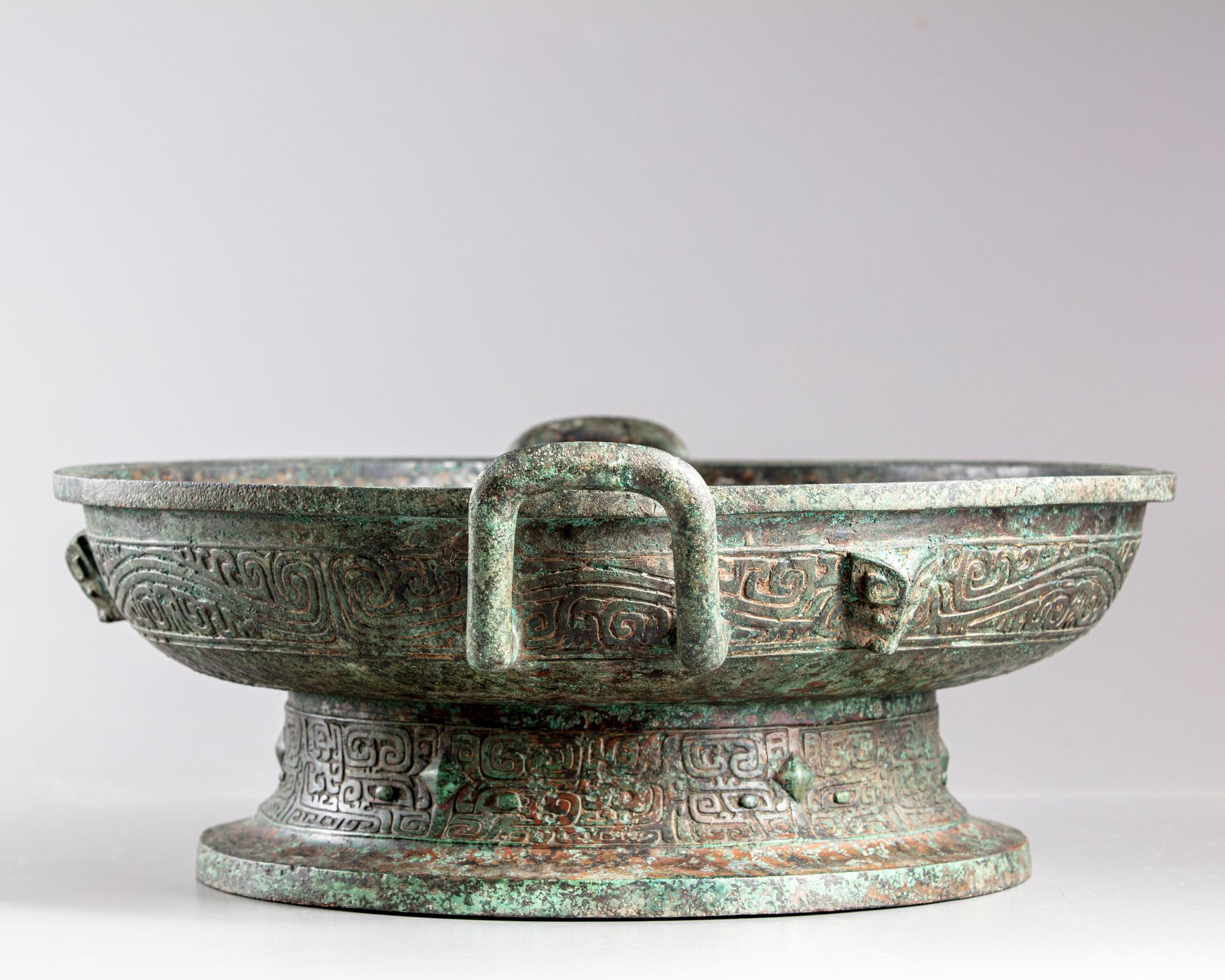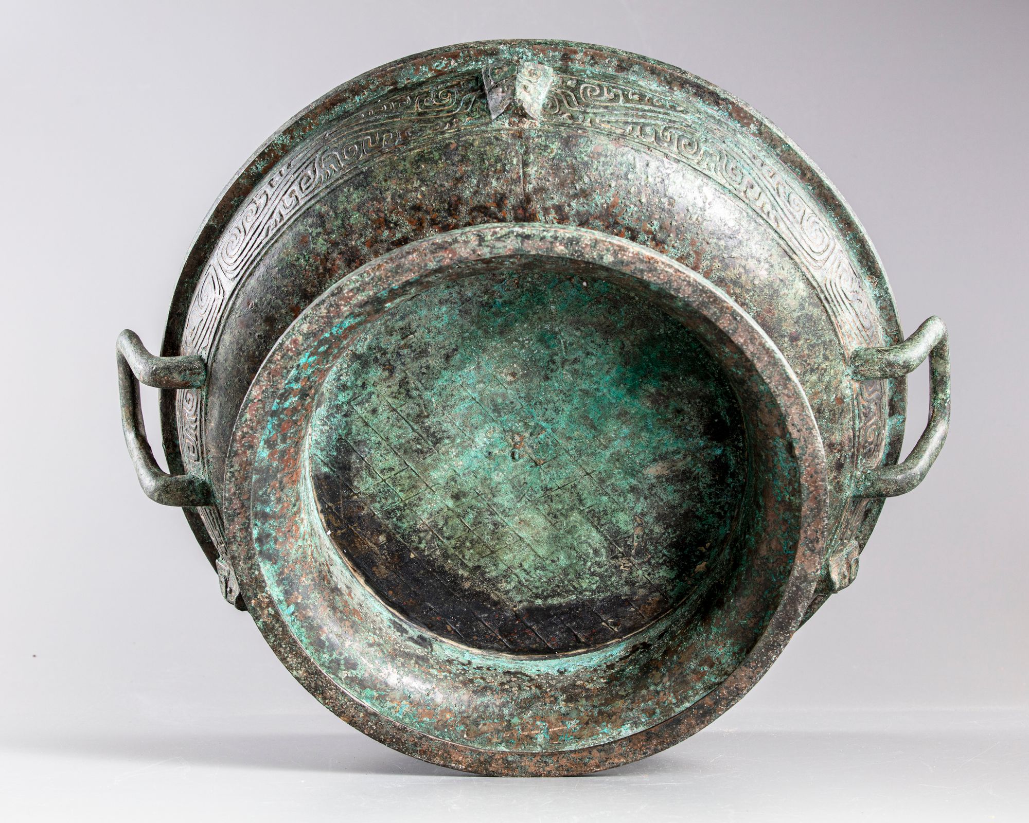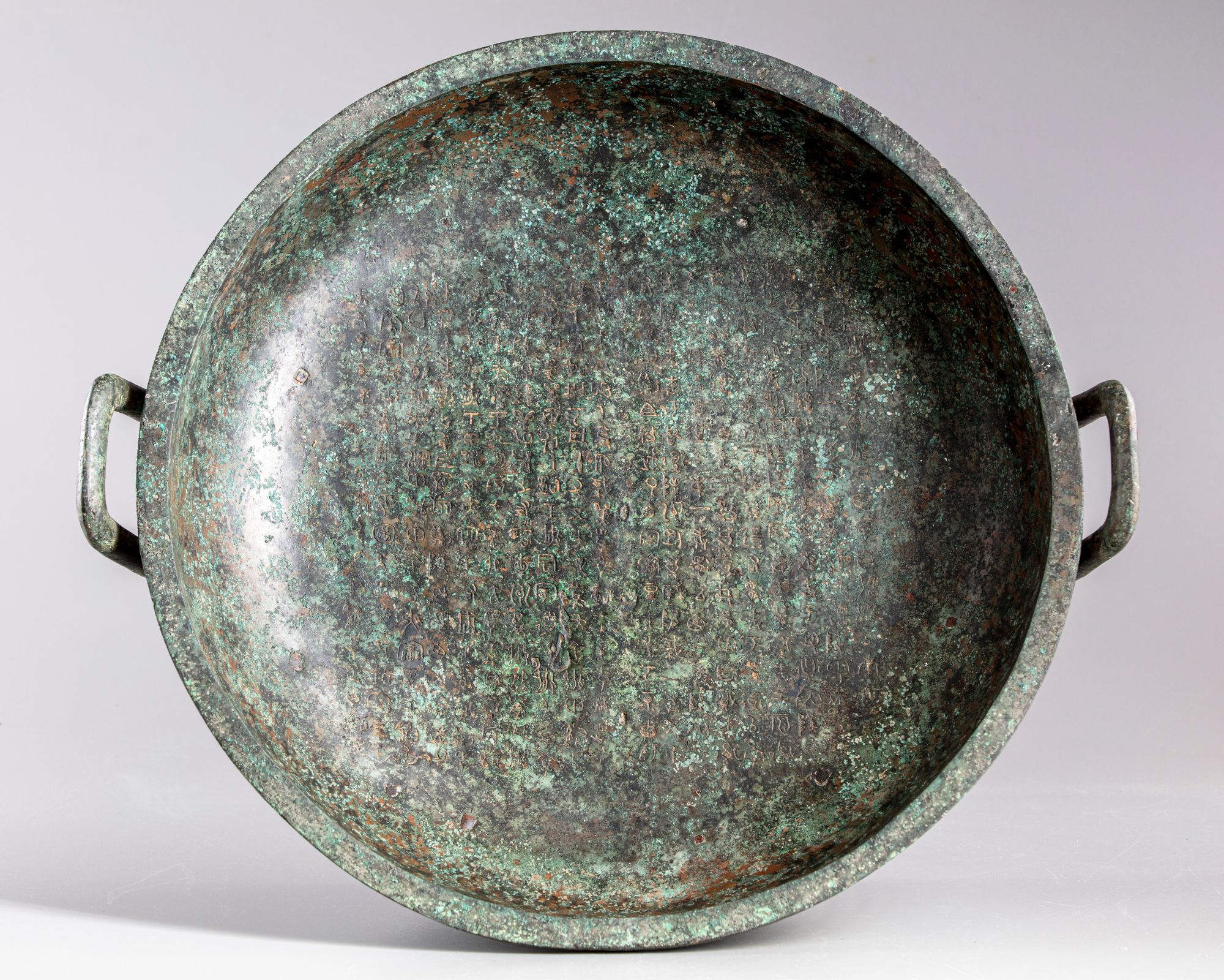 The shallow body is flanked by a pair of upright U-shaped handles and decorated on the exterior with a band of scrolls, above a band of taotie-masks cusped ends on the pedestal foot. The interior with Chinese graphs and inscriptions. 20 cm. height, 55 cm. diam.
