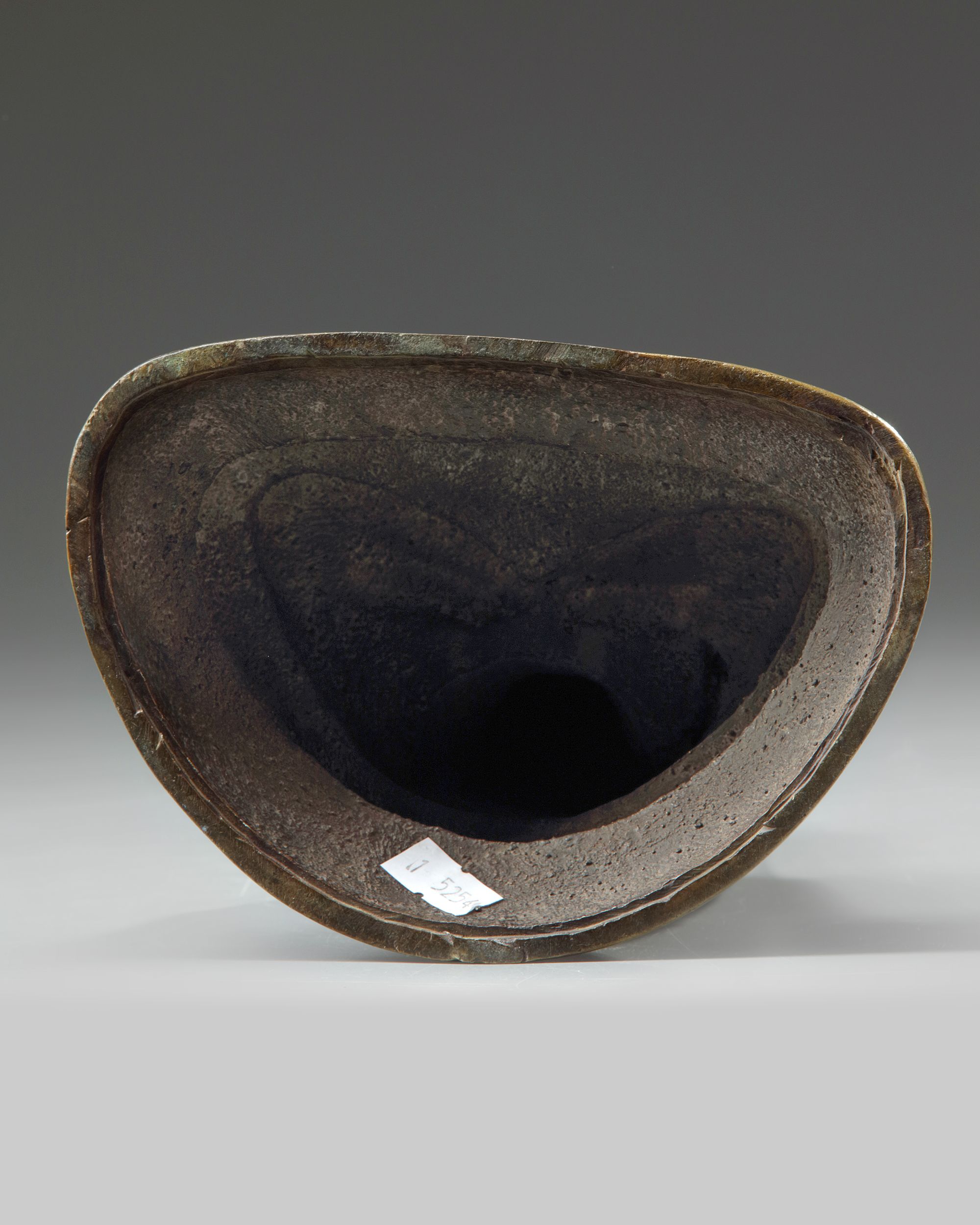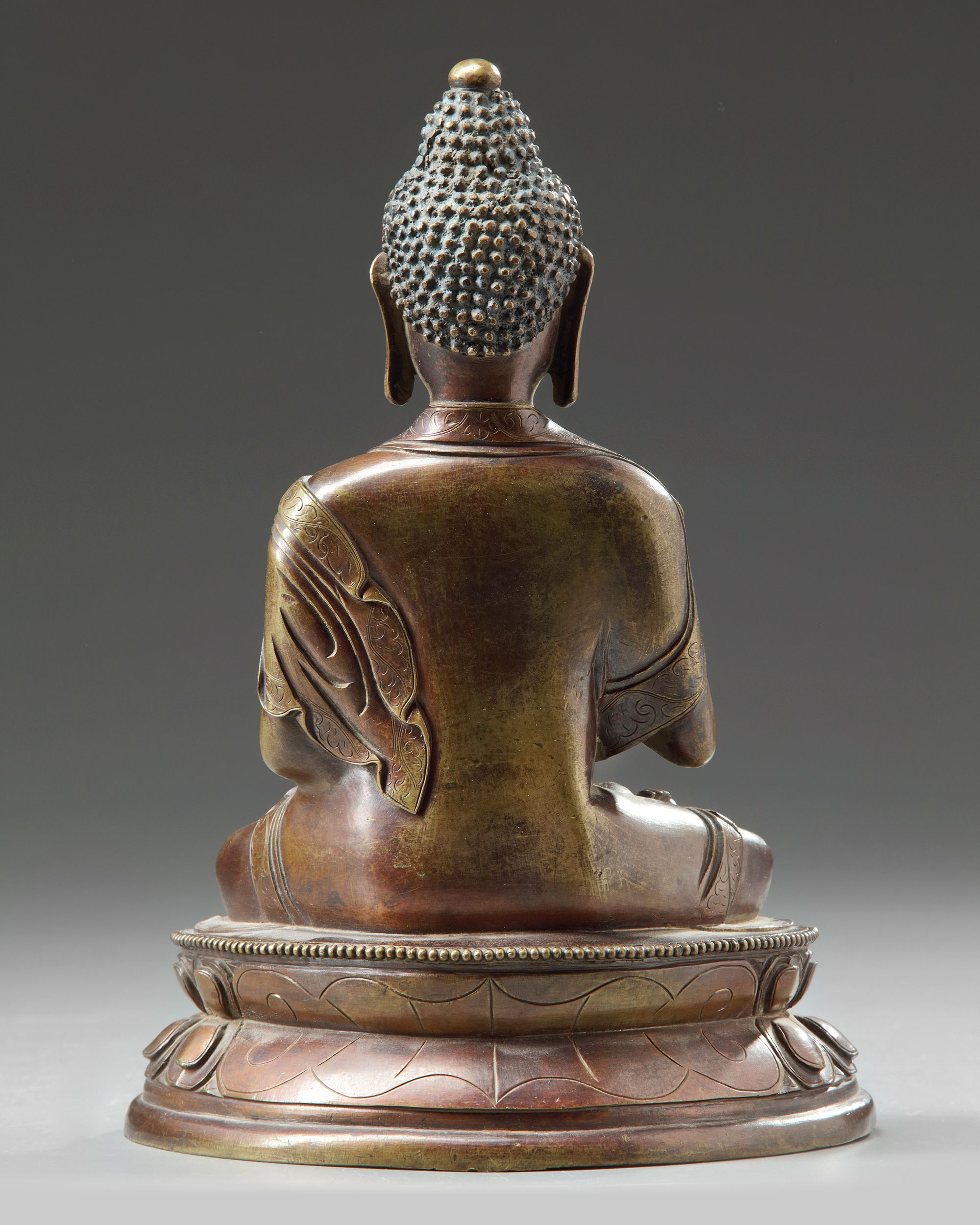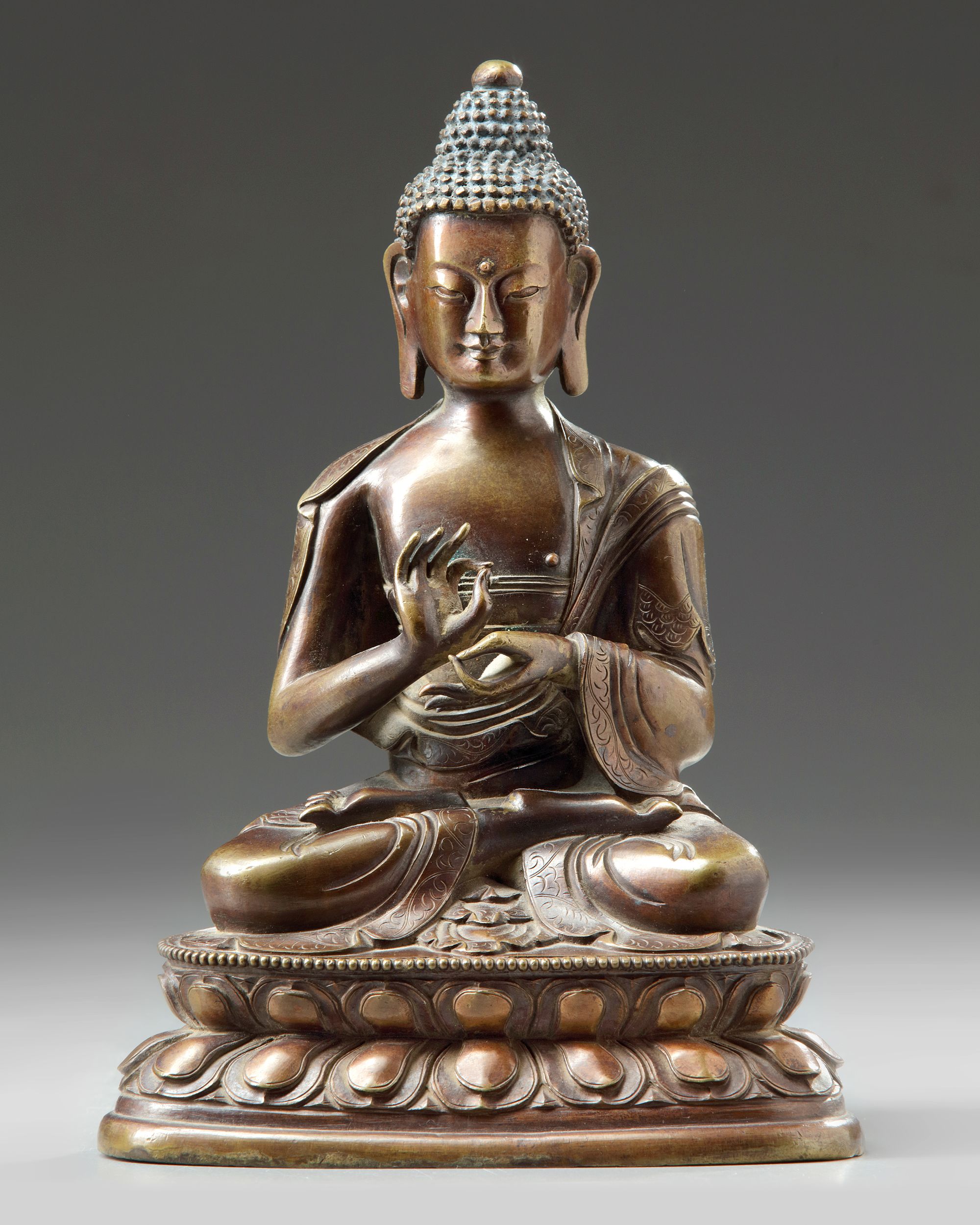 The Buddha is seated in dhyanasana on a double-lotus base with his hands held in vitarka mudra. He is clad in ornate, patchwork robes. The face is serene, with gentle smile and downcast eyes, and the hair arranged in rows of tight whorls surmounted by a domed ushnisha.