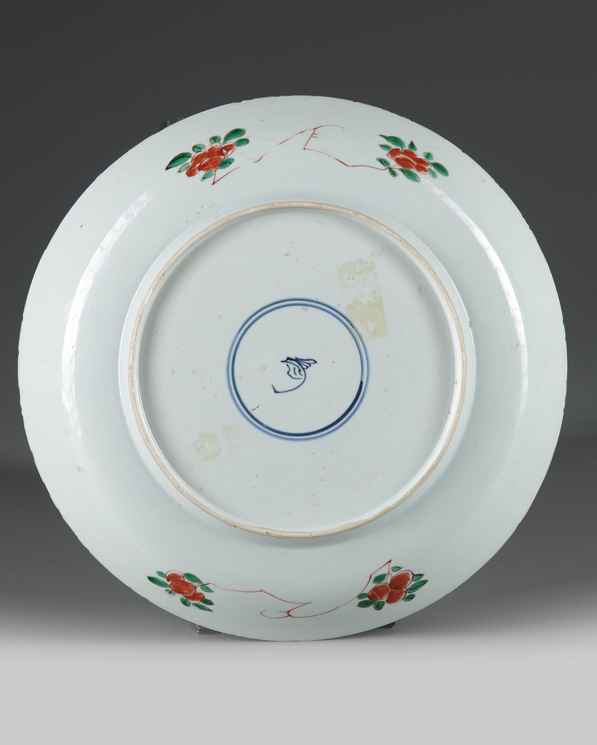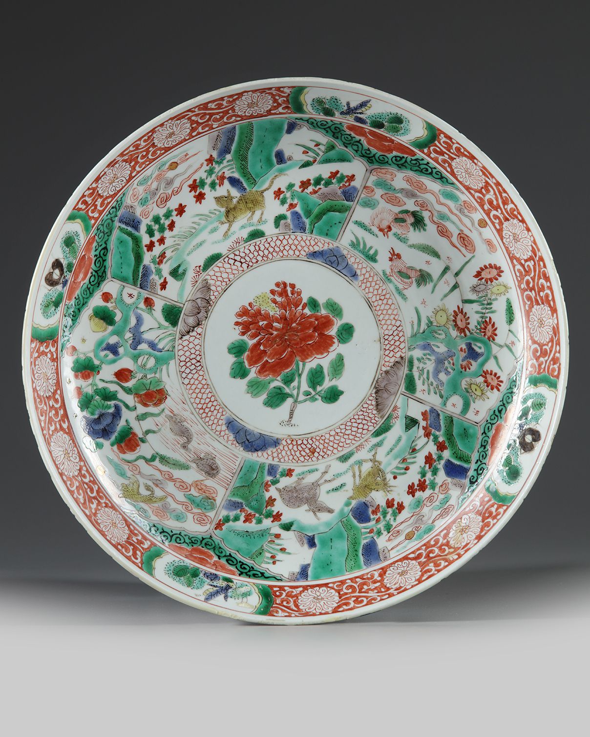The dish is decorated to the interior with four panels enclosing auspicious animals, including cockerel, deer, mandarin ducks, and a further mythical beasts. The rim is decorated with scrolling lotus on an iron-red ground interspersed with insect cartouches. The reverse is decorated with flower sprays and the base bears an artemisia leaf mark in underglaze blue.