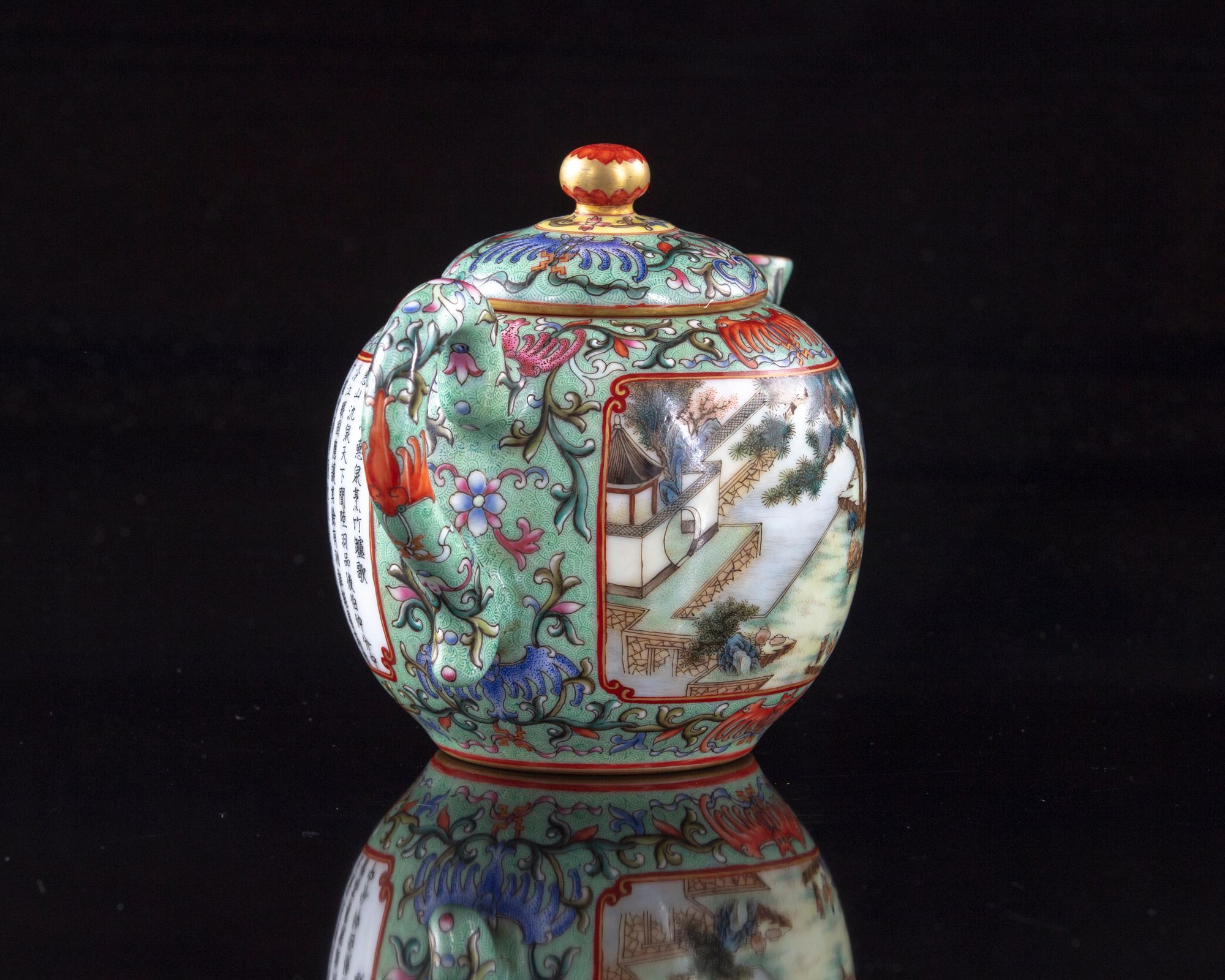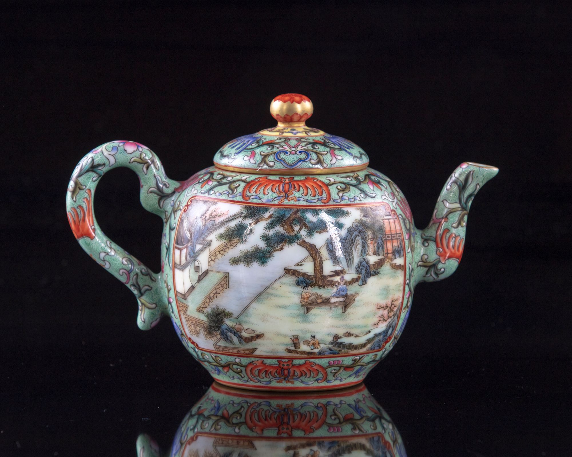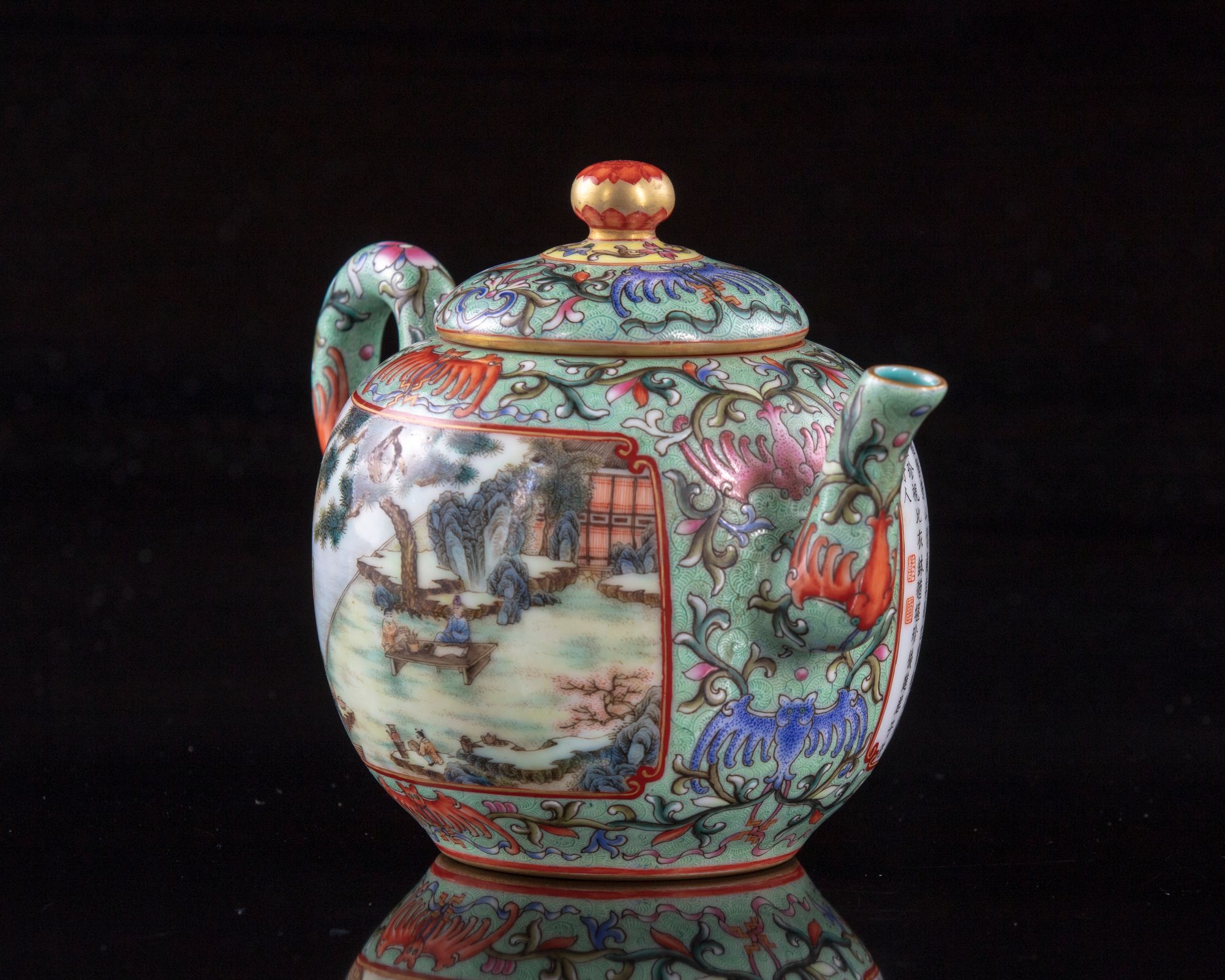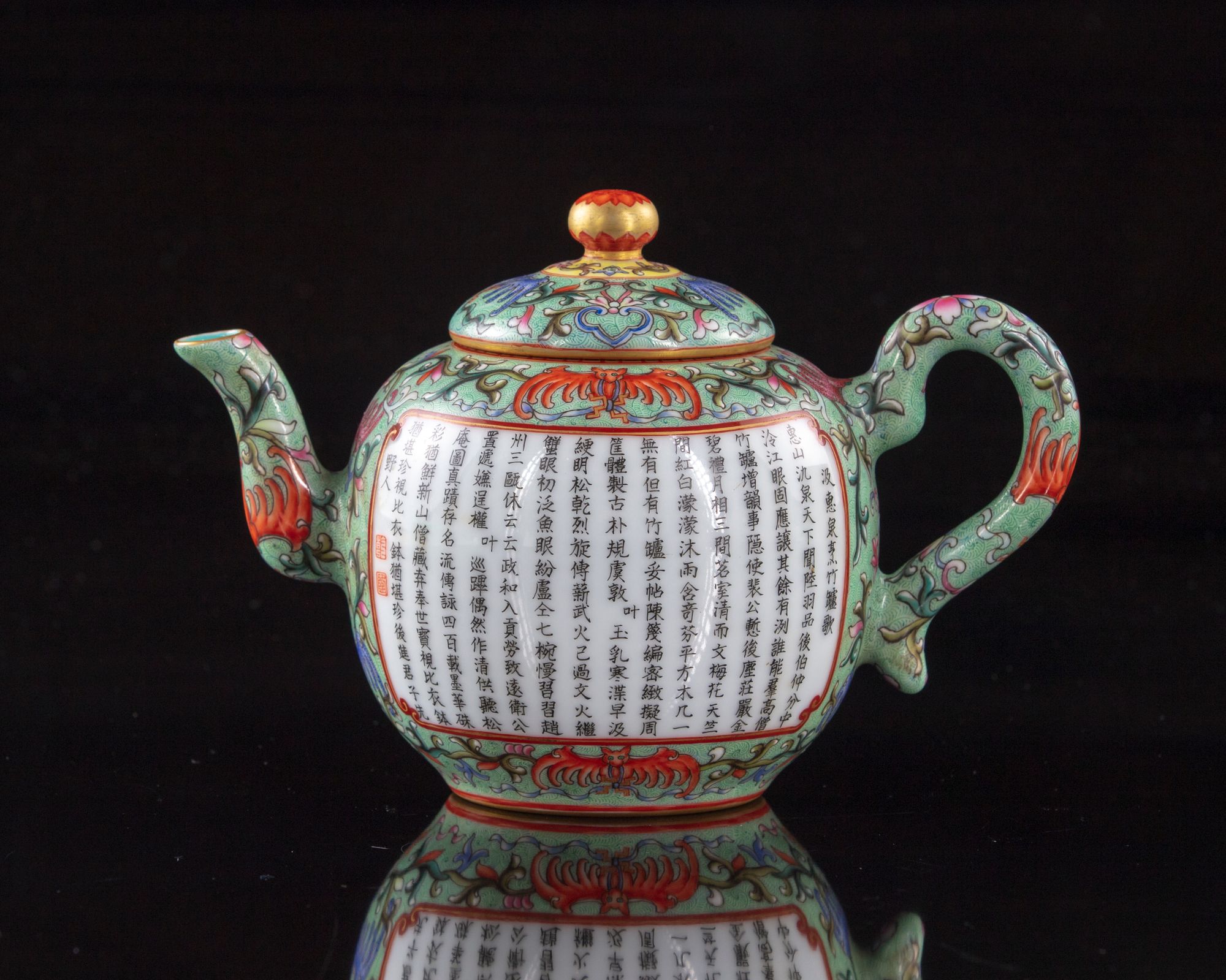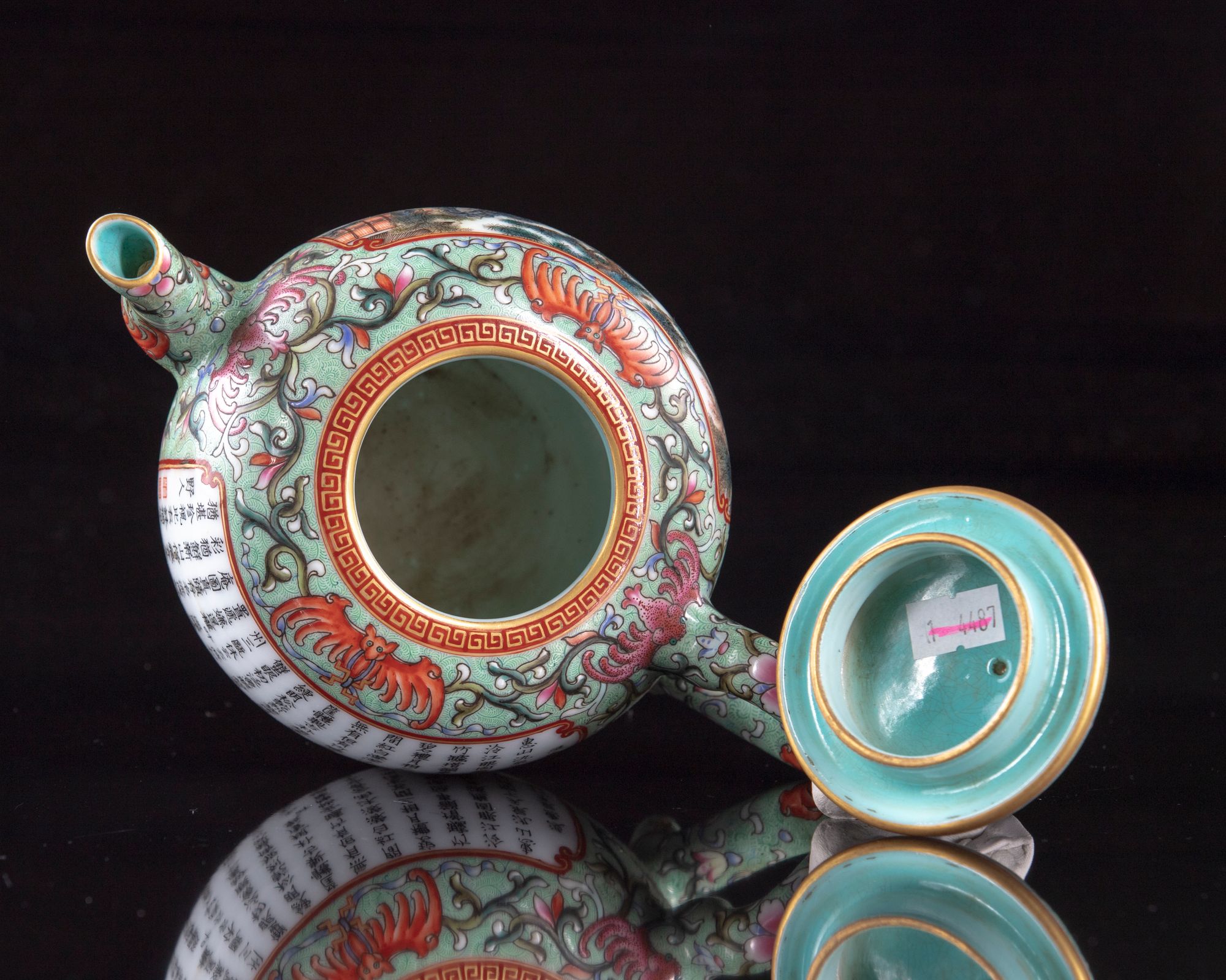 The teapot is decorated with a gilt panel enclosing a garden scene of a scholar admiring a scroll below a pine tree, with an attendant serving tea and a further attendant at the stove. The reverse is decorated with a similarly shaped panel framing an imperial poem by the Qianlong emperor, Brewing Tea by Hui Spring (Jihuiquan peng zhulu ge), and by two seals reading Qian and Long. The panels are reserved on a pale turquoise sgraffiato ground, amongst bats grasping beribboned wan symbols and scrolls. The interior and base enameled in turquoise and the base with an apocryphal Qianlong mark.