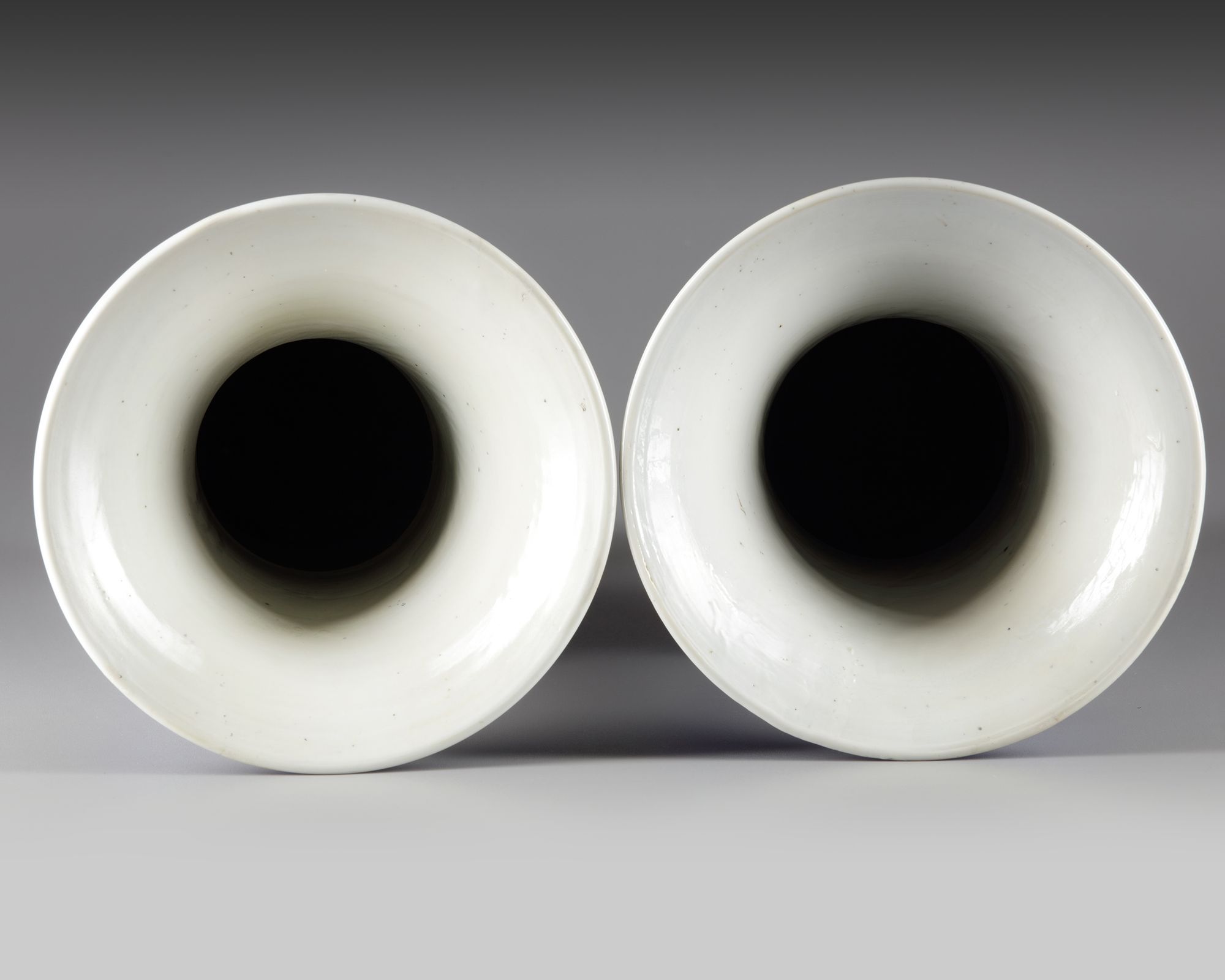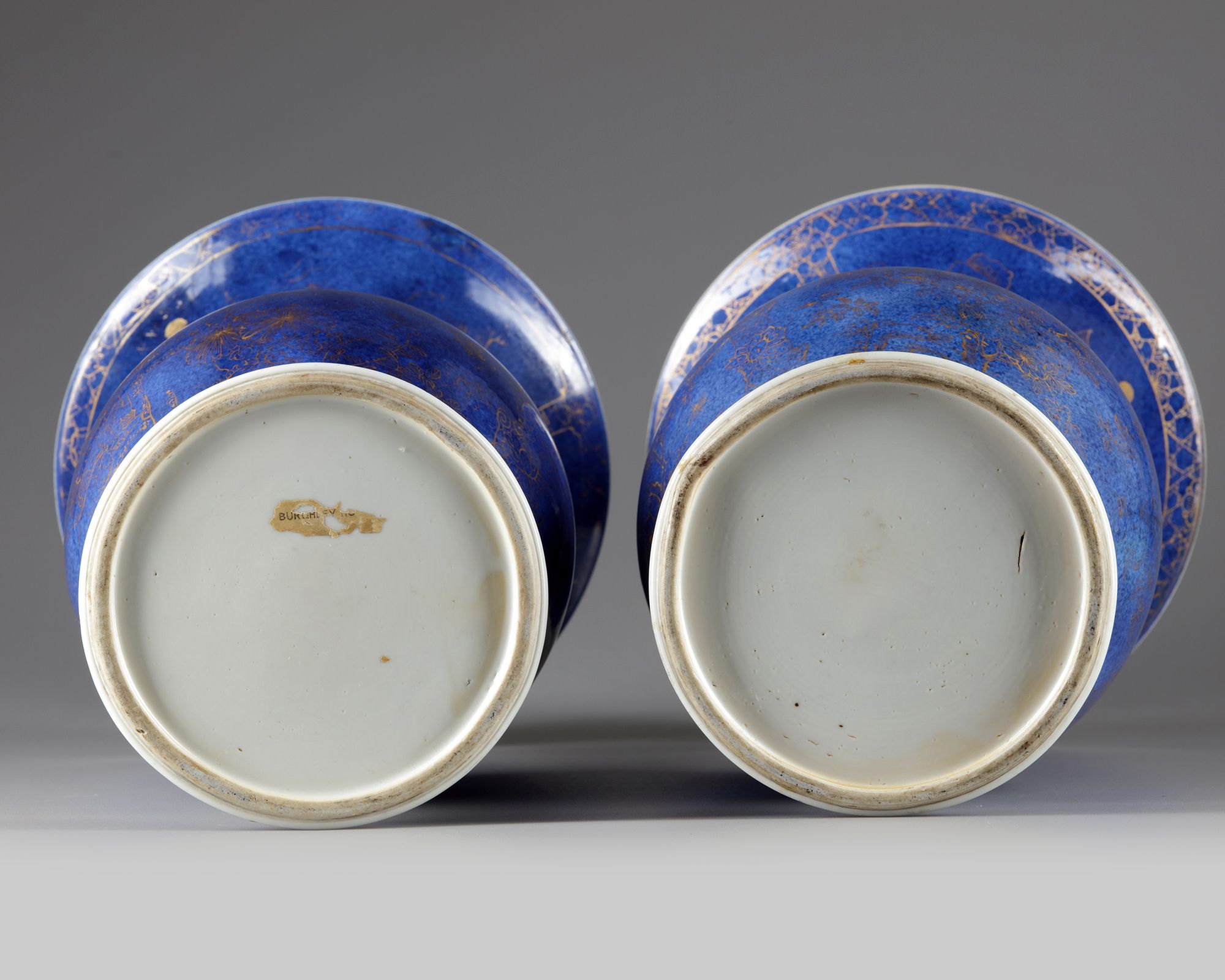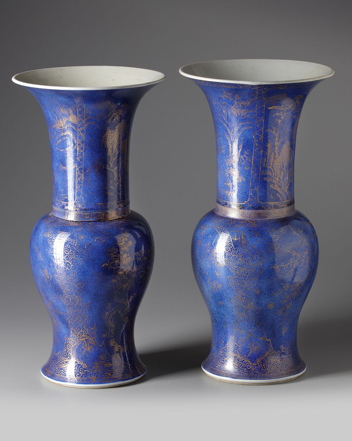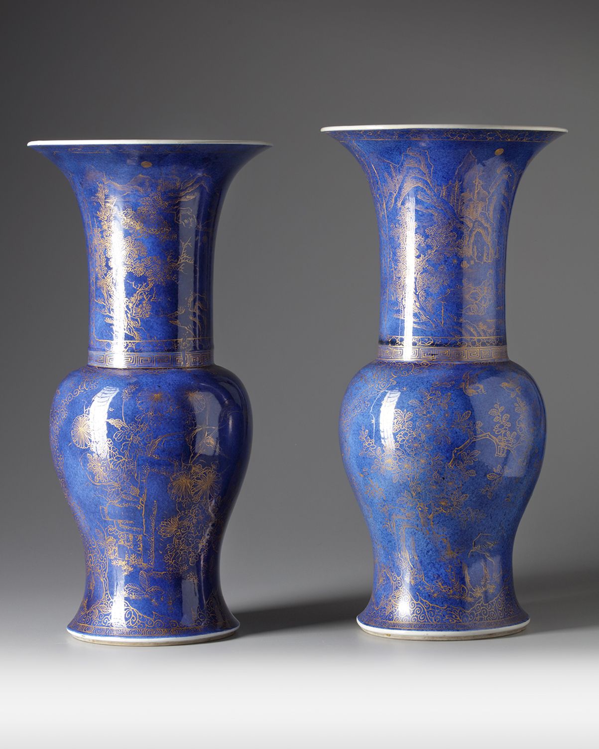 Each vase is decorated in gilt to the neck with a landscape scene depicting scholars and pavilions. Each body is decorated with panels enclosing blossoming flowers separated by lotus flowers and scrolls, all reserved on a mottled blue ground.