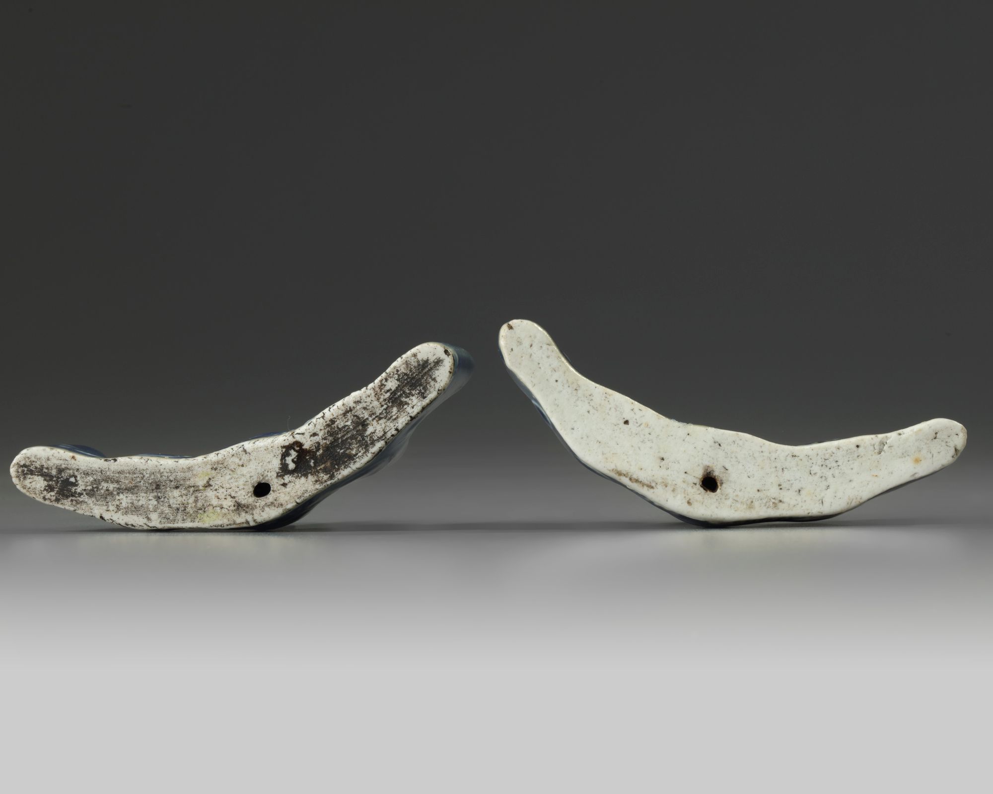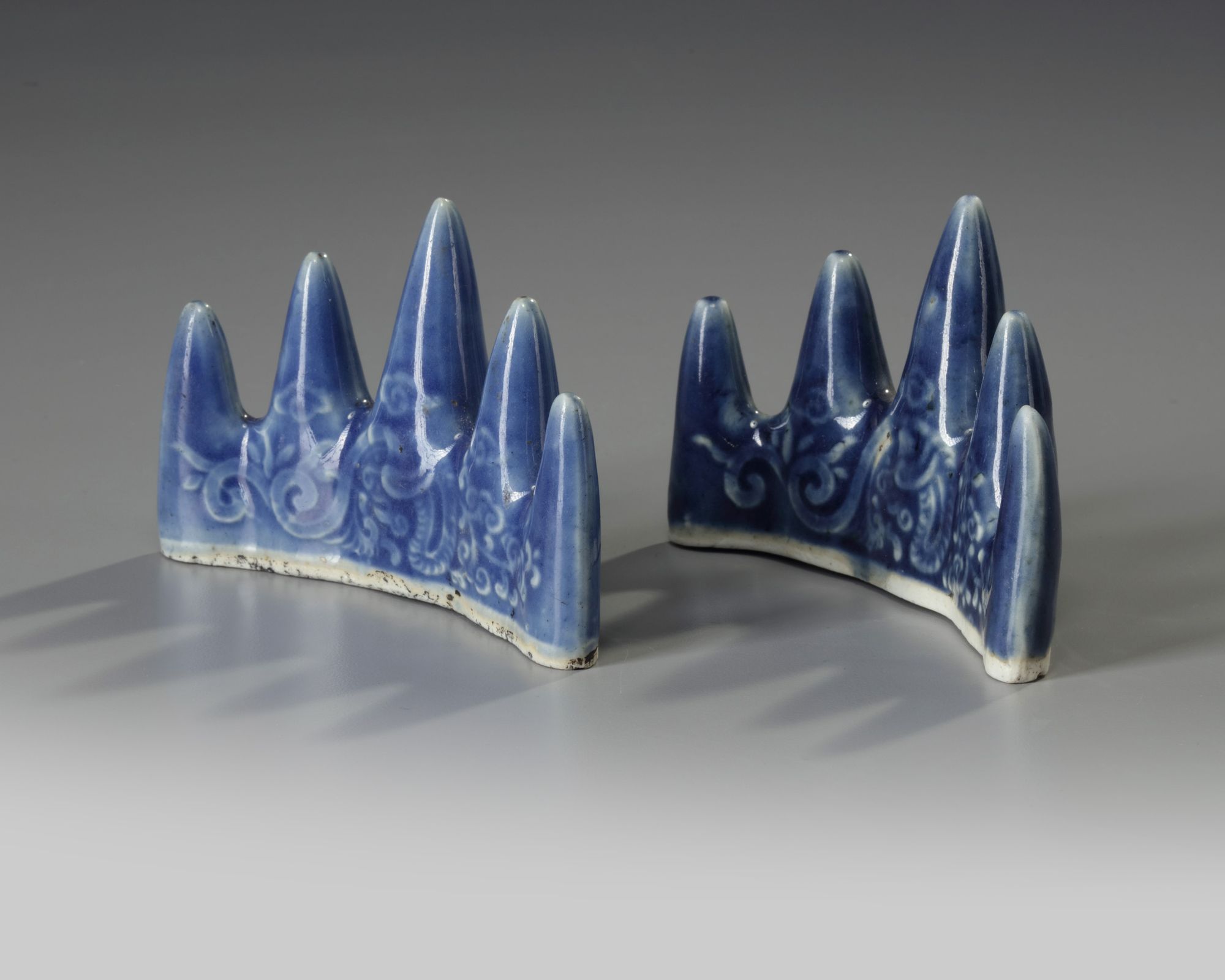 Each gently curved brush rest is crafted as a five-peaked mountain, and is moulded in low relief to both sides with a striding dragon amongst coiled clouds. Each brush rest is covered in a thick blue glaze which thins at the raised design and stops at the foot.
