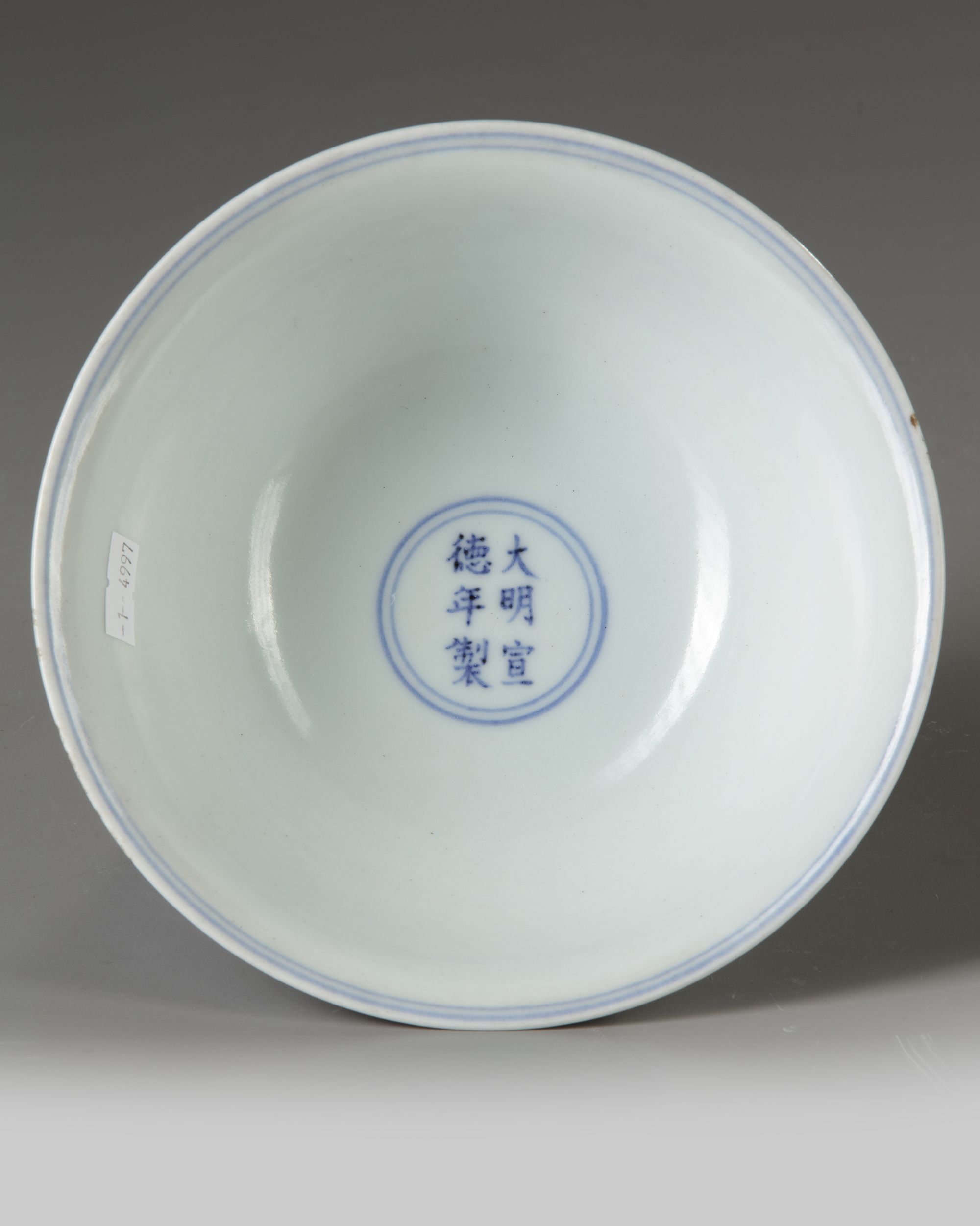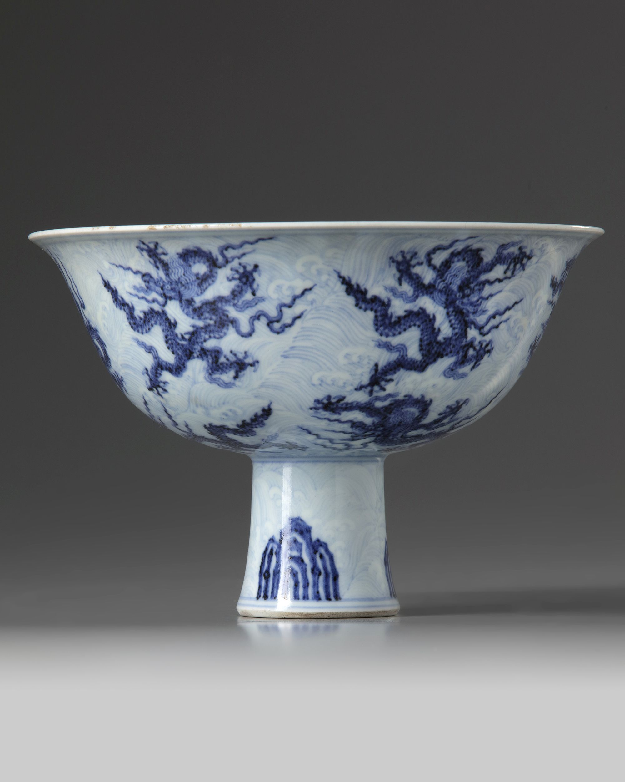 The exterior of the bowl is decorated with nine dragons in various positions amongst tumultuous waves. The high foot is decorated with three mountains to the base, the interior with an apocryphal Xuande mark.