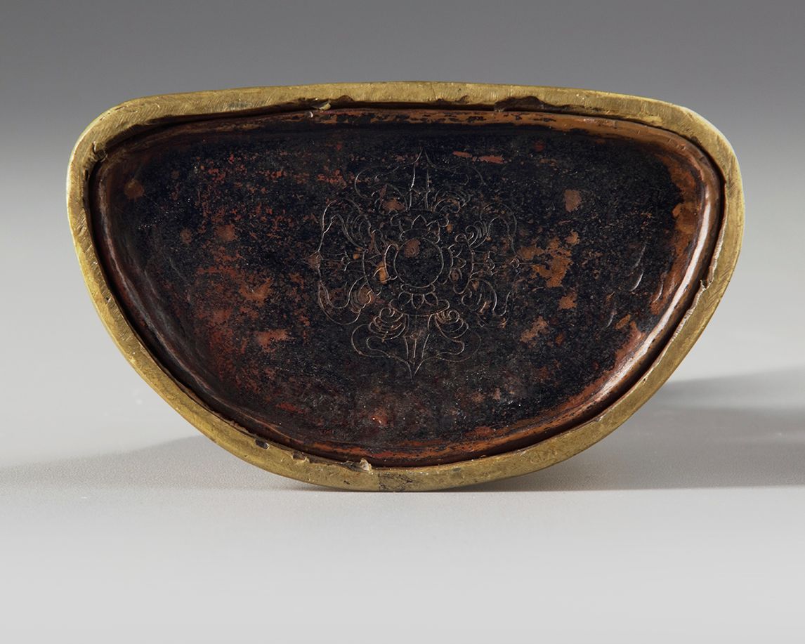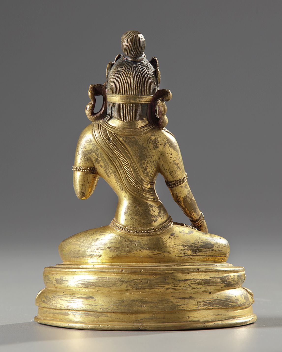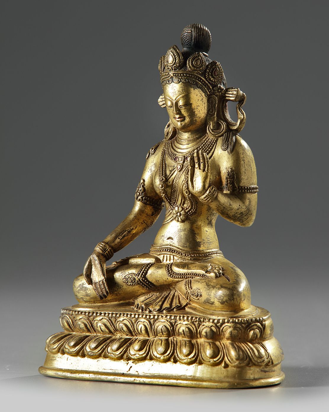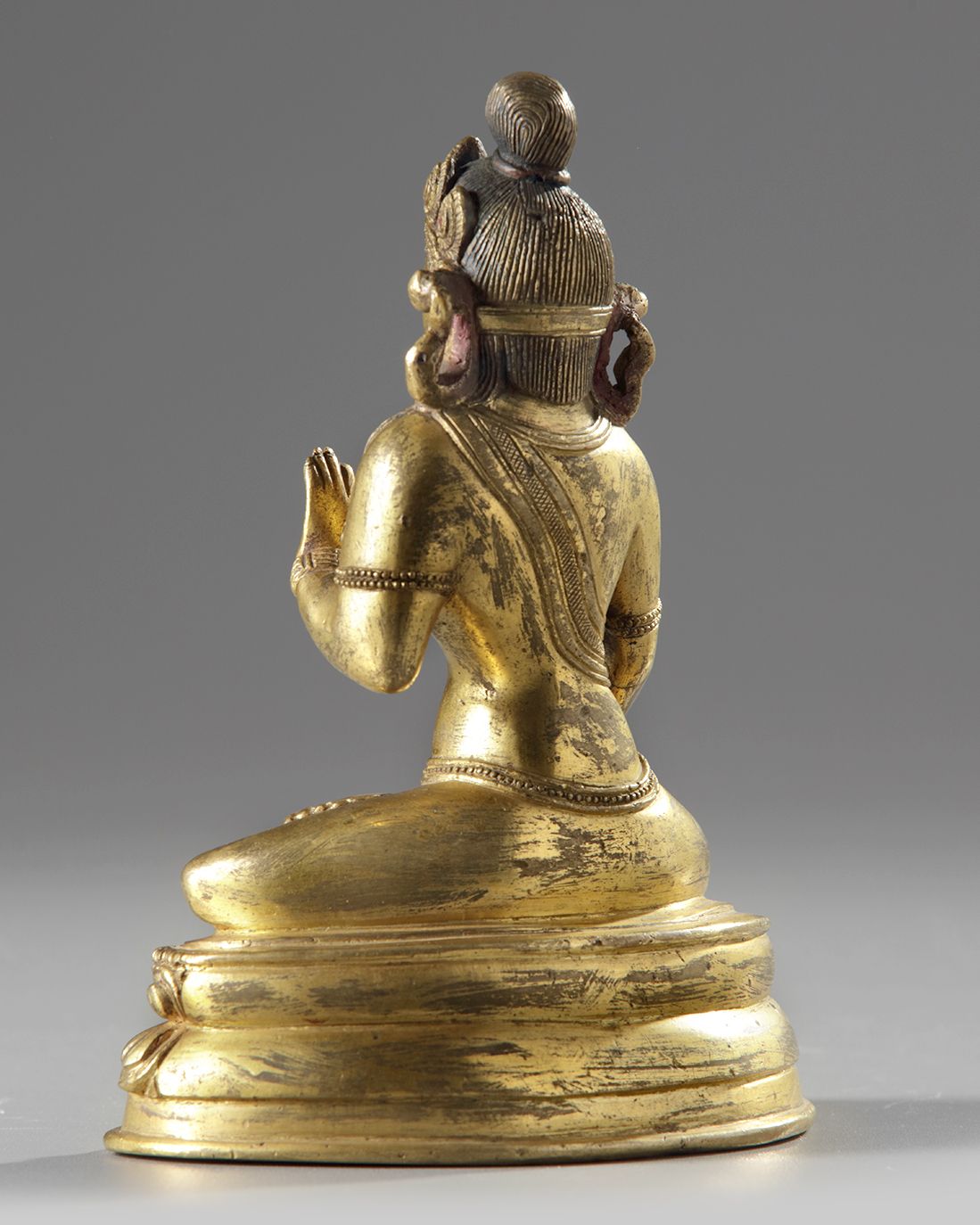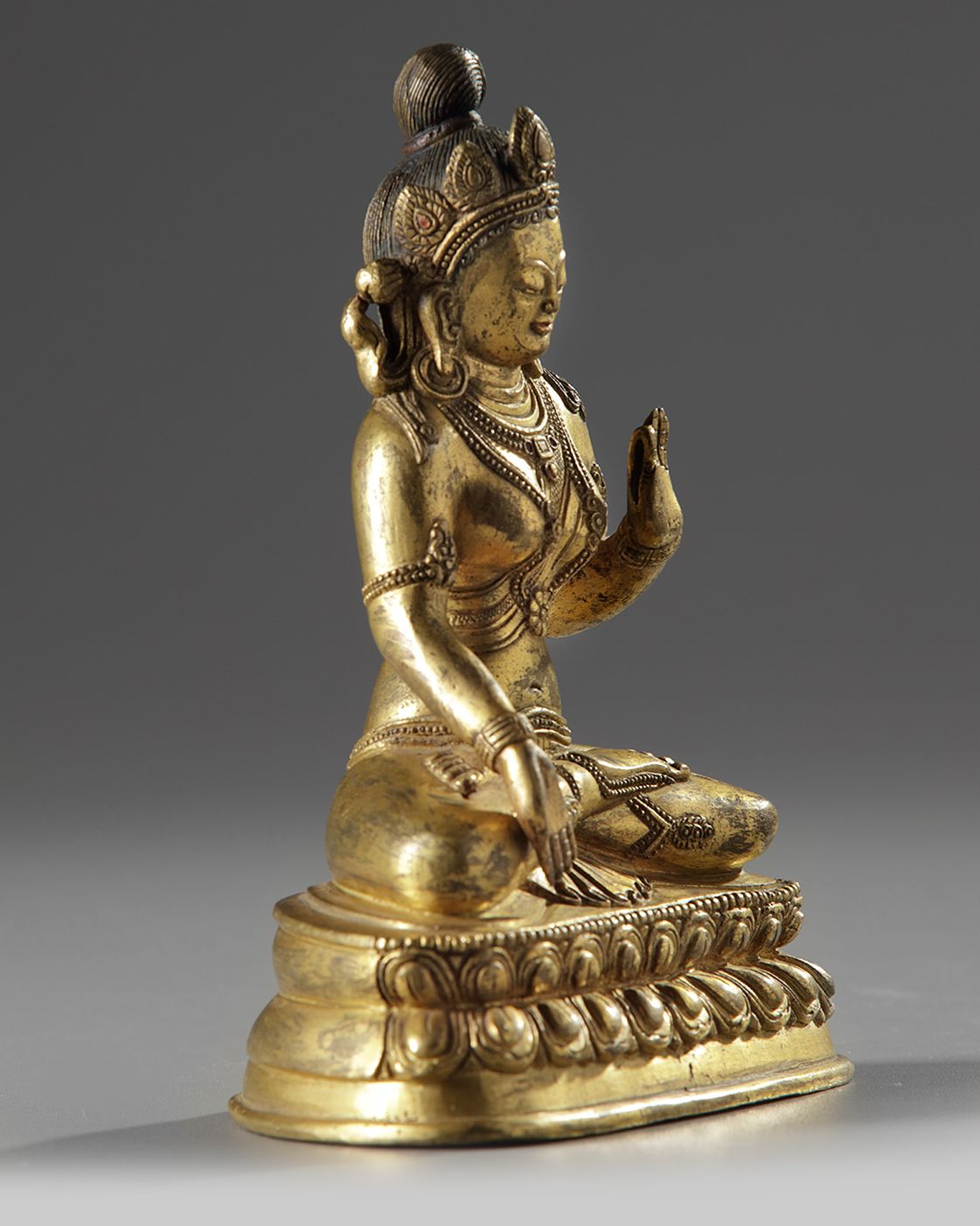 Seated on a double lotus base with bearded edges, the right hand raised and holding an attribute.
