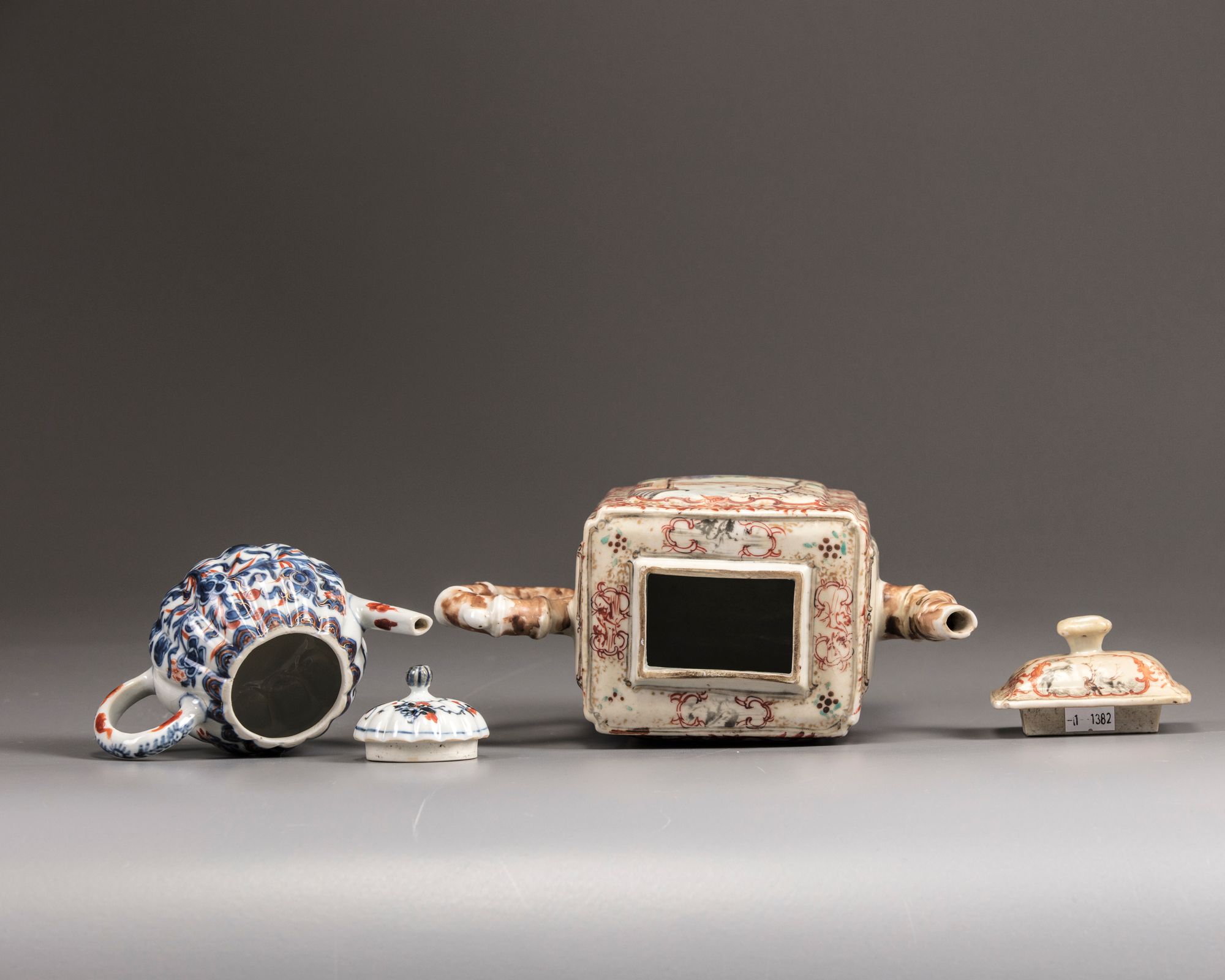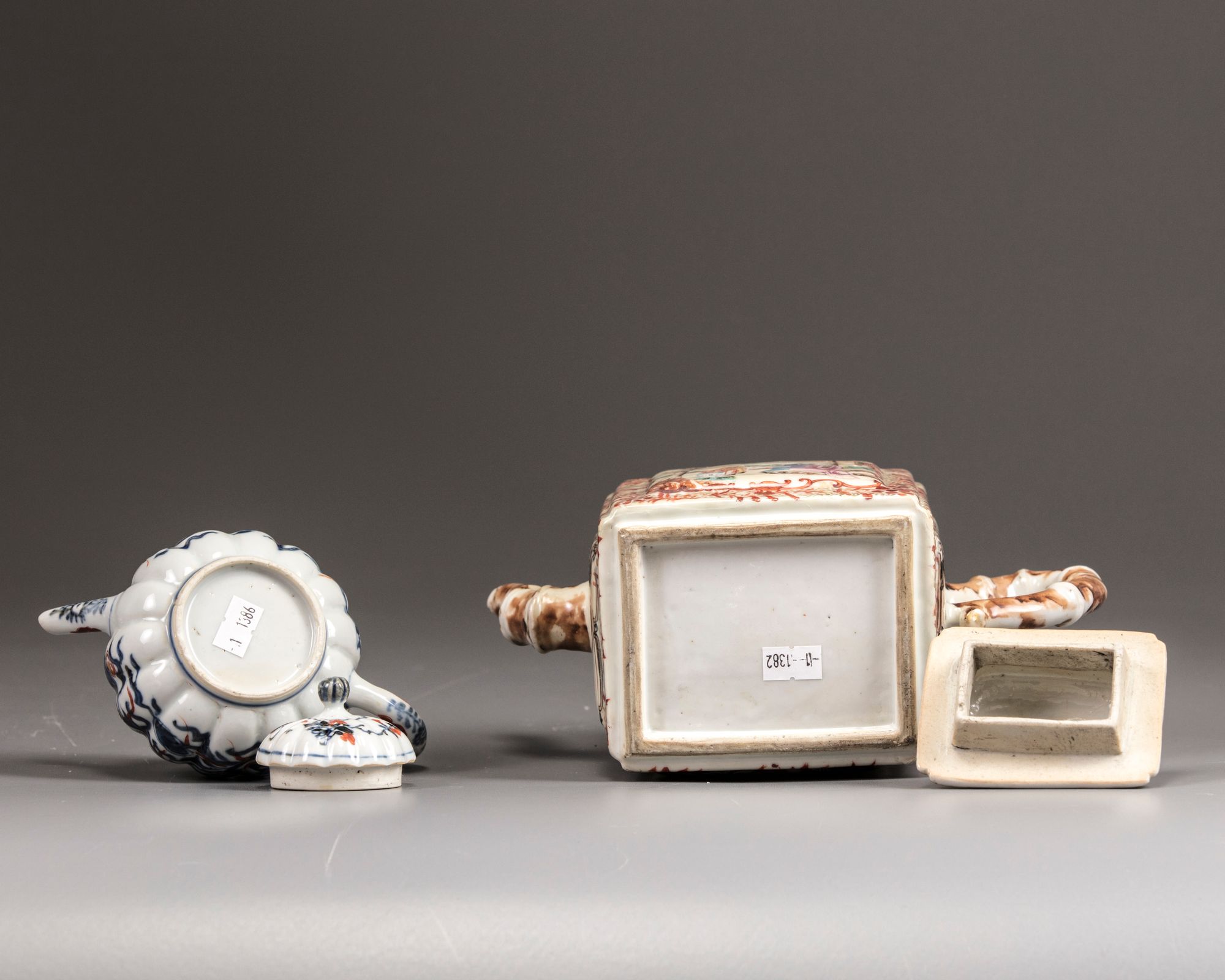 The Chinese imari teapot is decorated to the fluted body with scrolling flowers highlighted with gilding and iron-red enamels, the domed cover is surmounted by a moulded knop finial. The square-section teapot is modelled with a handle and spout imitating bamboo, the body is decorated with panels figures at leisure surrounded by a scrolling leaf band, the shoulder is decorated with landscape cartouches.