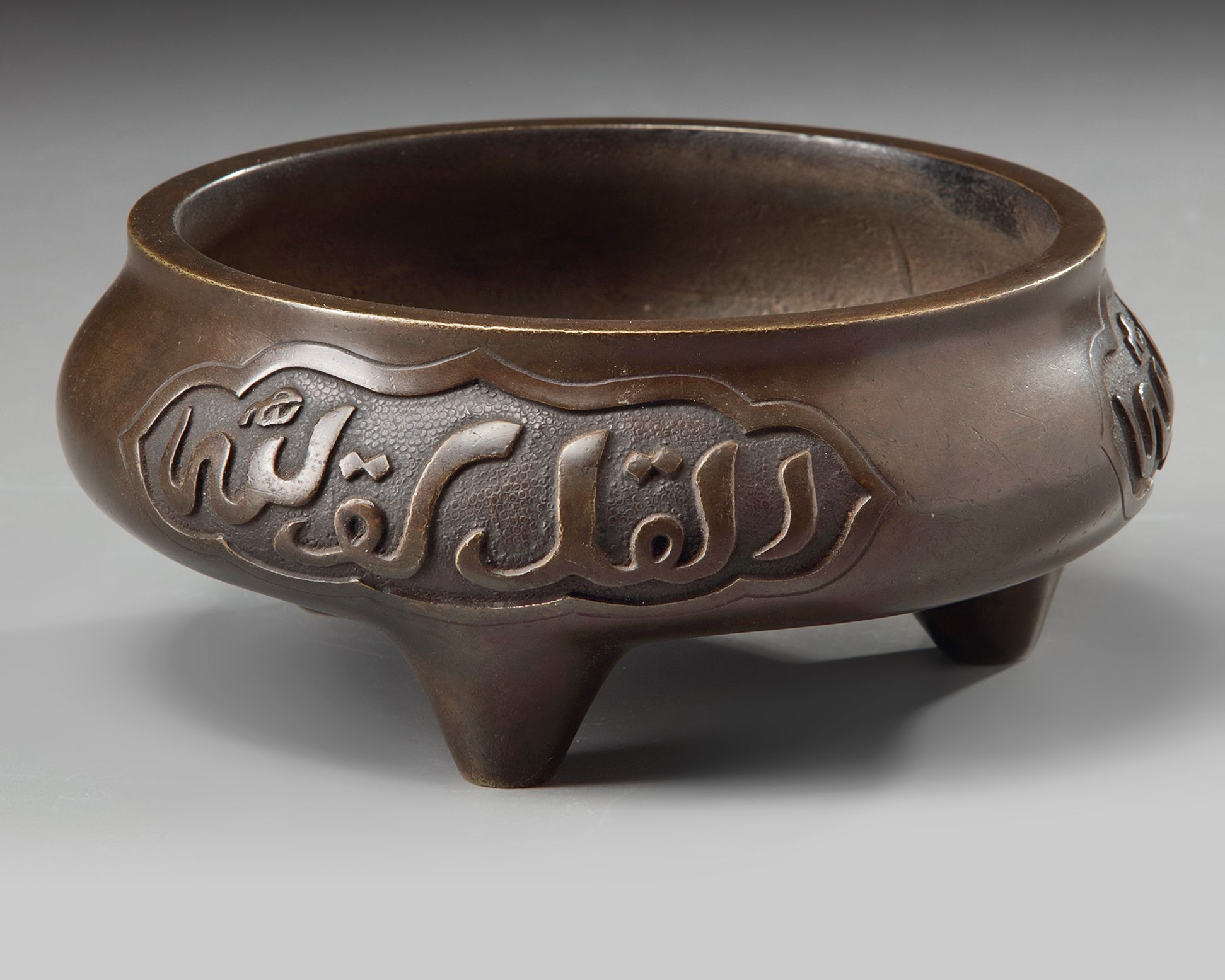 Of compressed globular shape standing on three conical feet, cold-worked with three ruyi-shaped cartouches containing Islamic script on a ring-punched ground, the bronze with a reddish-brown patina with a seal mark to the bottom.