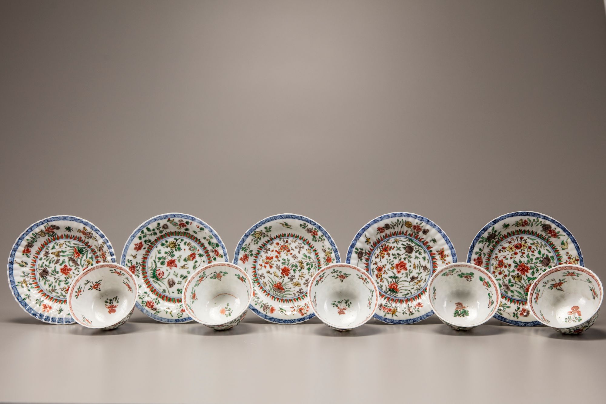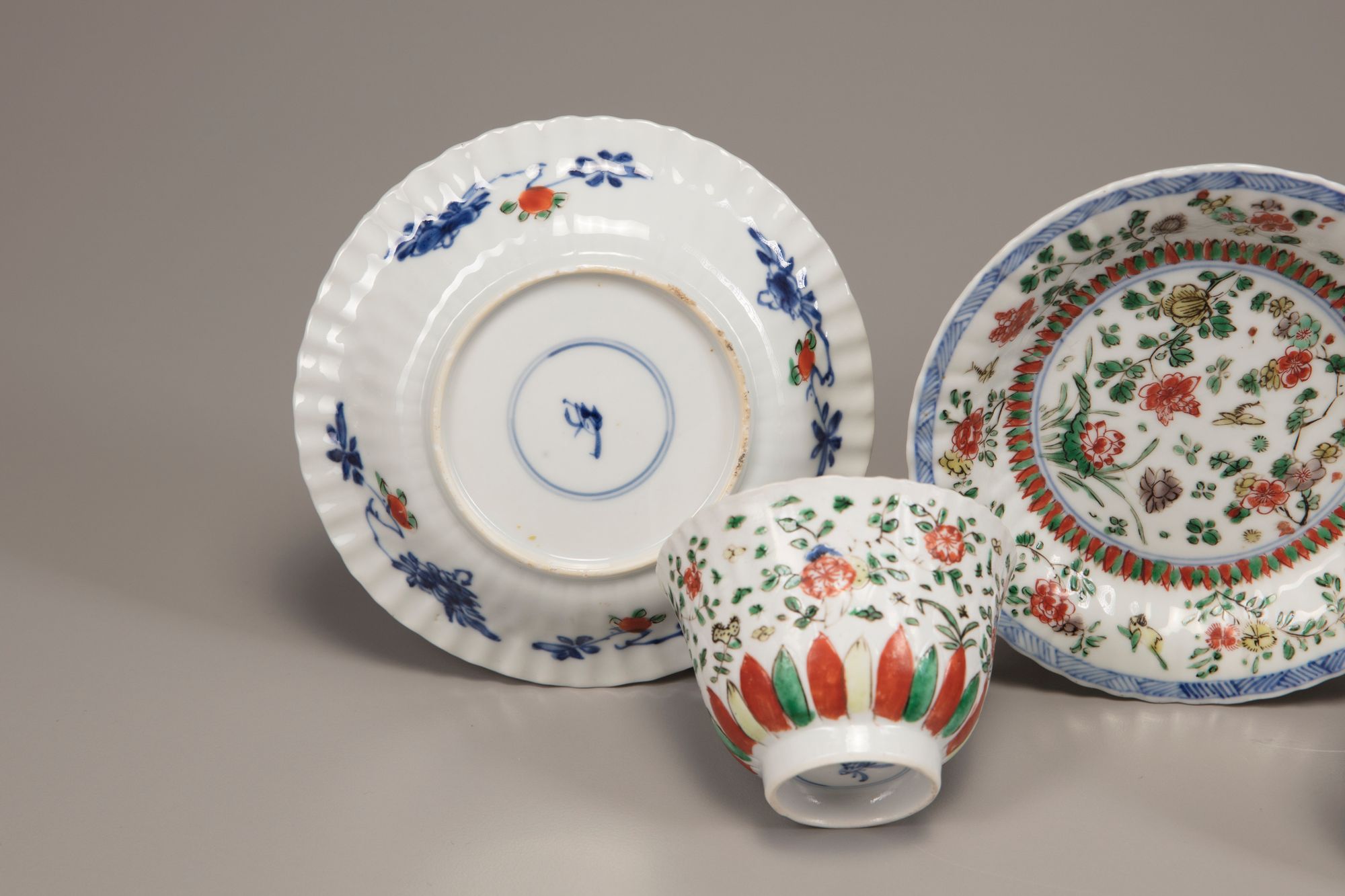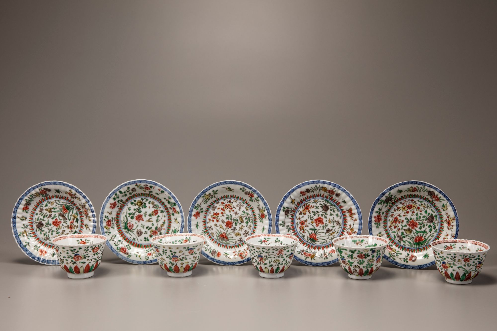 Each cup is decorated with flower sprays above lappet bands, the interior is decorated with scattered flower sprays. Each base with an underglaze blue lingzhi mark. Each saucer is decorated with prunus, peony and lotus in the centre surrounded by further flowers and birds. The reverses with flower sprays and each base with an underglaze blue leaf mark.