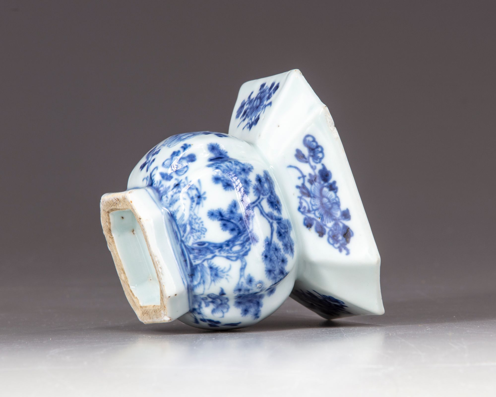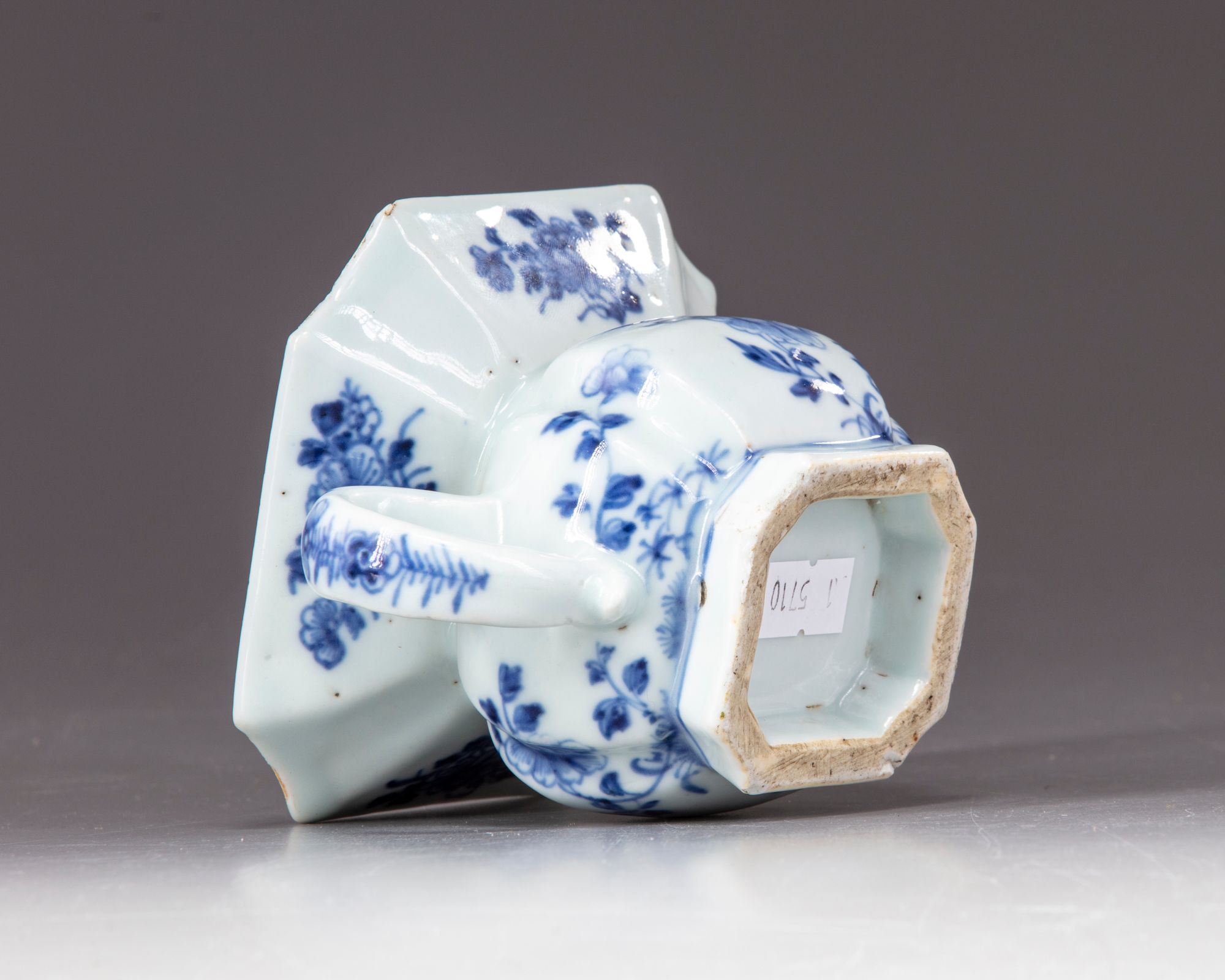 A Chinese porcelain spittoon with an incised base, everted rim and a handle, decorated in cobalt-blue with a one tree and flowering branches.