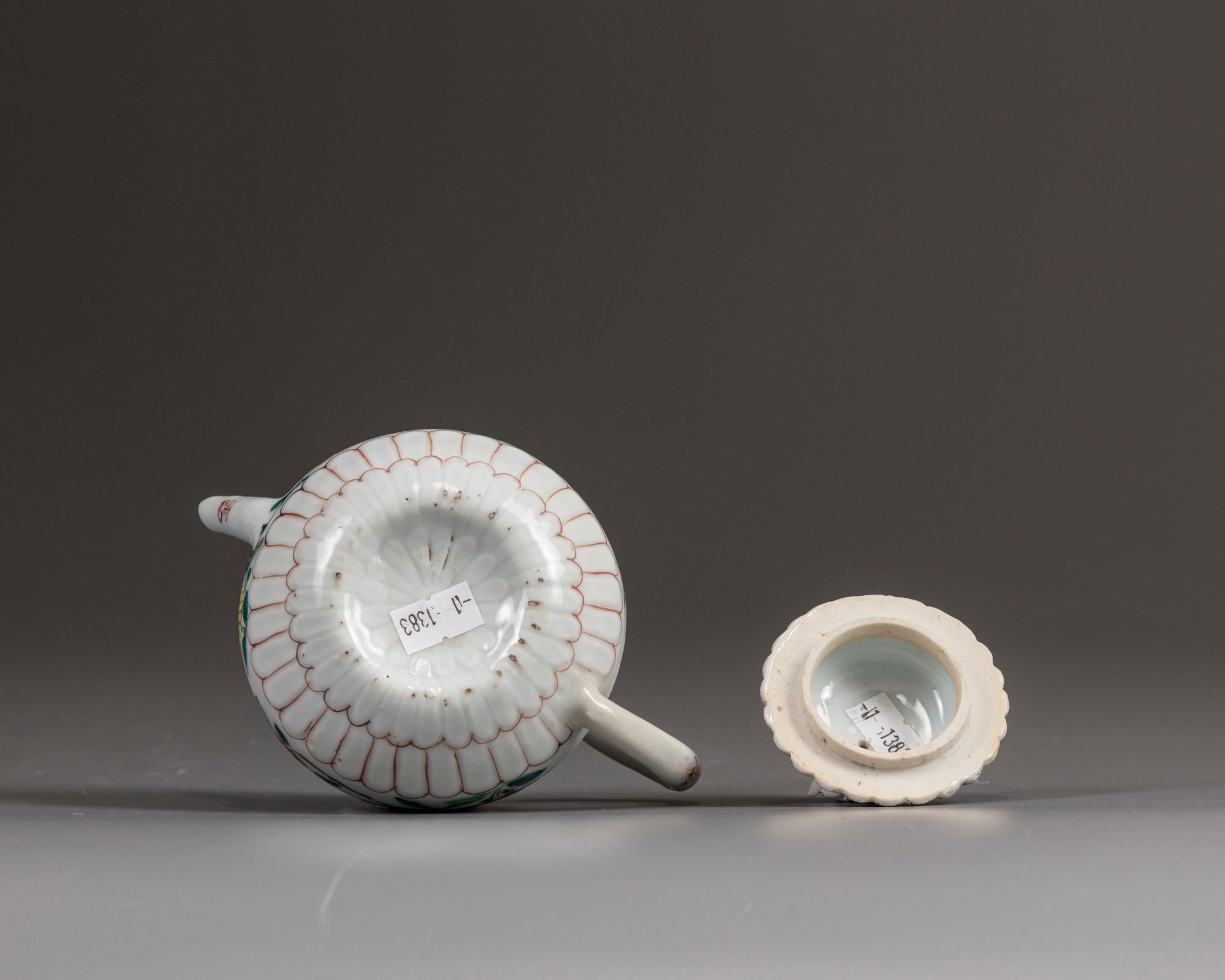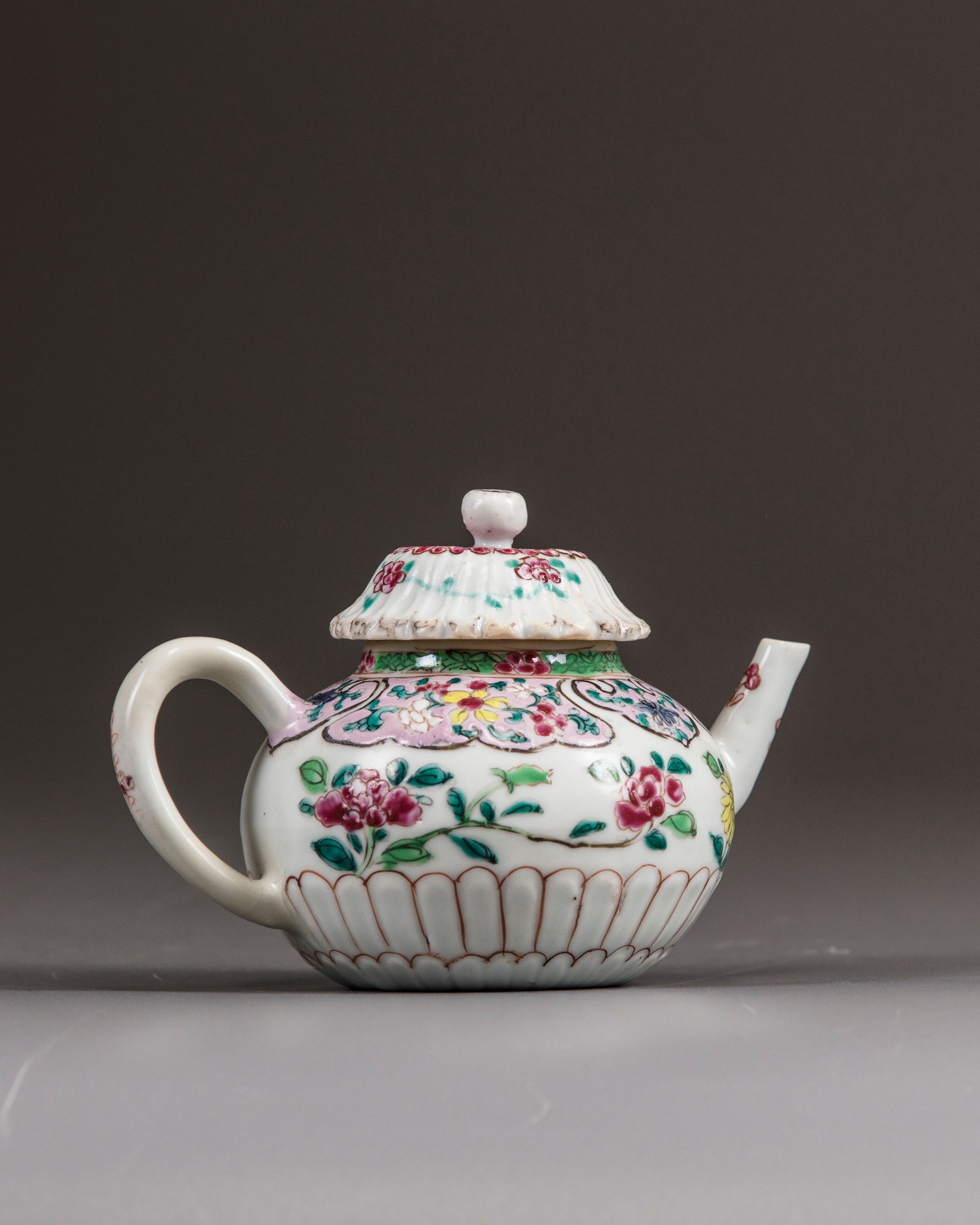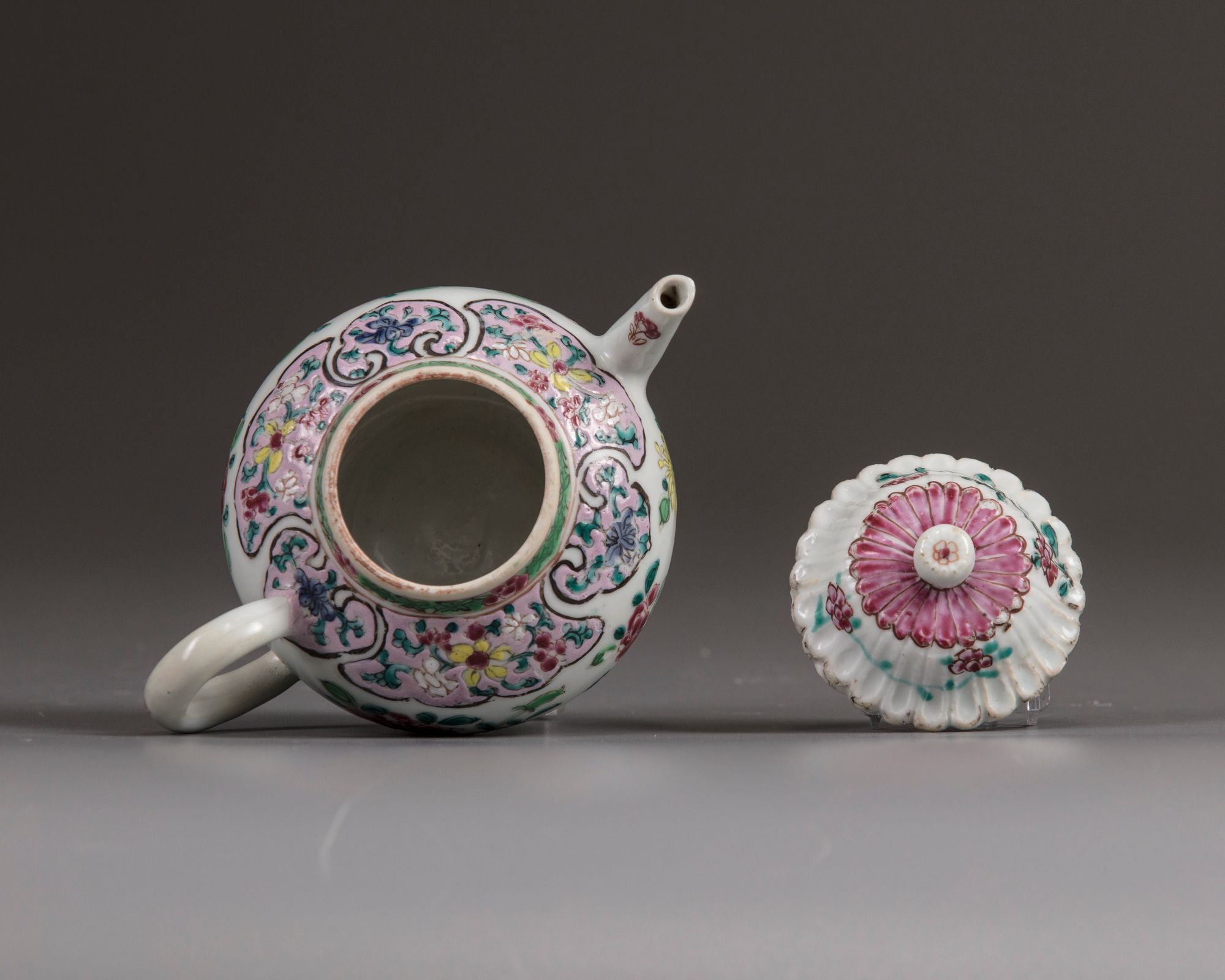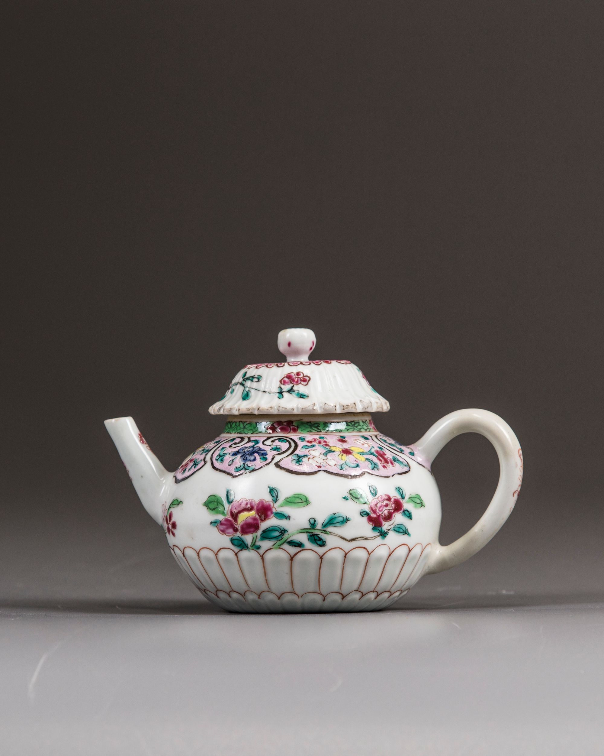 The teapot is moulded with a chrysanthemum to the lower section, the body is decorated with flower sprays below a shaped lappet border enclosing further flowers on a light pink ground. The chrysanthemum-shaped cover is decorated with further scattered flower sprays.