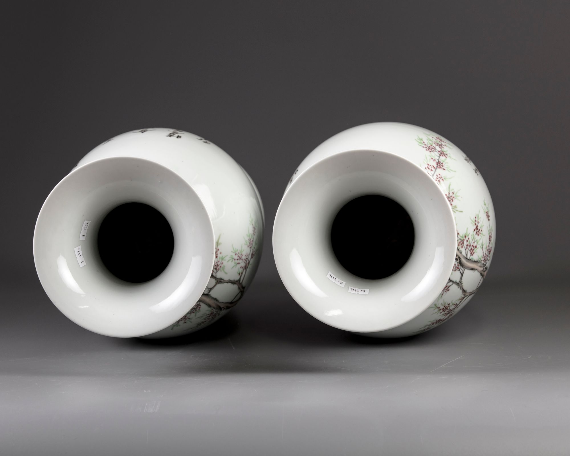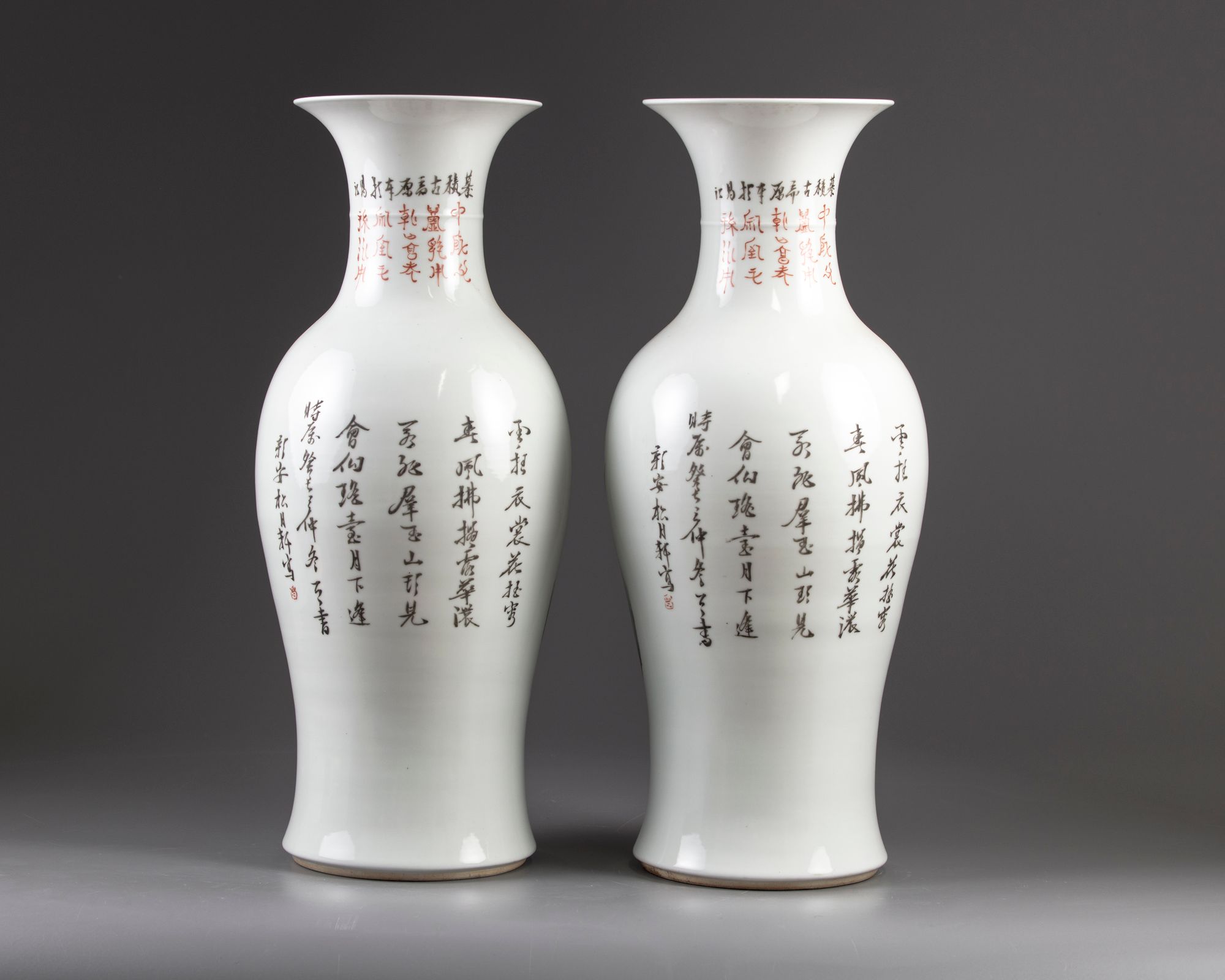 Each vase is finely enameled in mirror image around with colorful figures standing next to a flowering tree, the reverse with a calligraphic inscription.