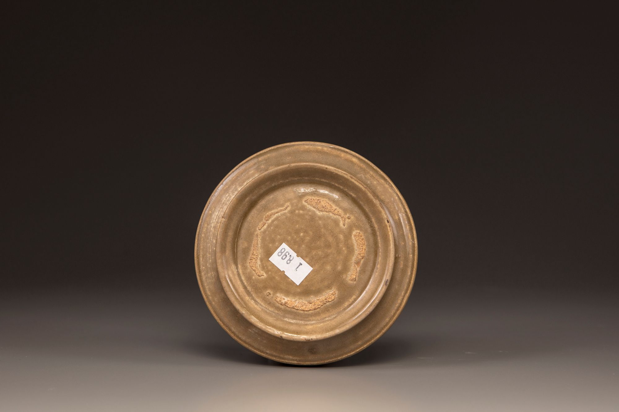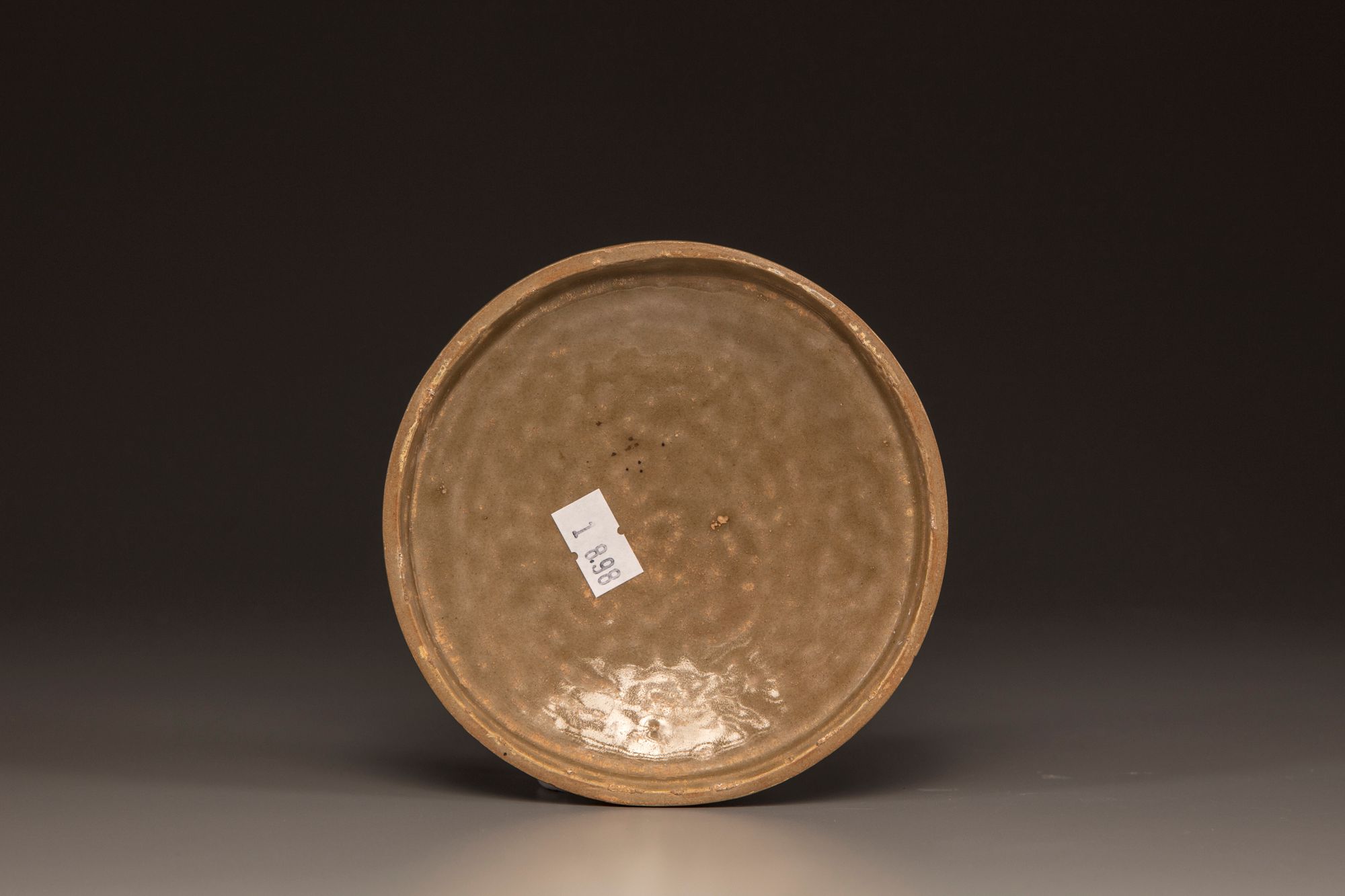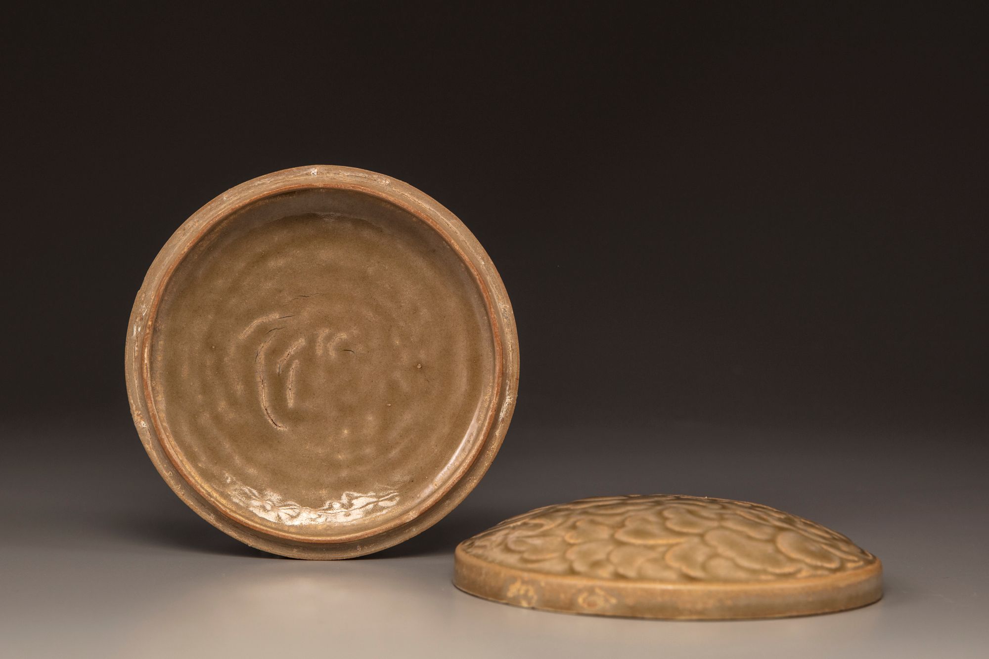The shallow domed cover is moulded in relief with a scrolling peony spray, the veining of the petals are incised. The box is supported on a splayed foot. Both the box and the cover are applied overall with an olive-green glaze.