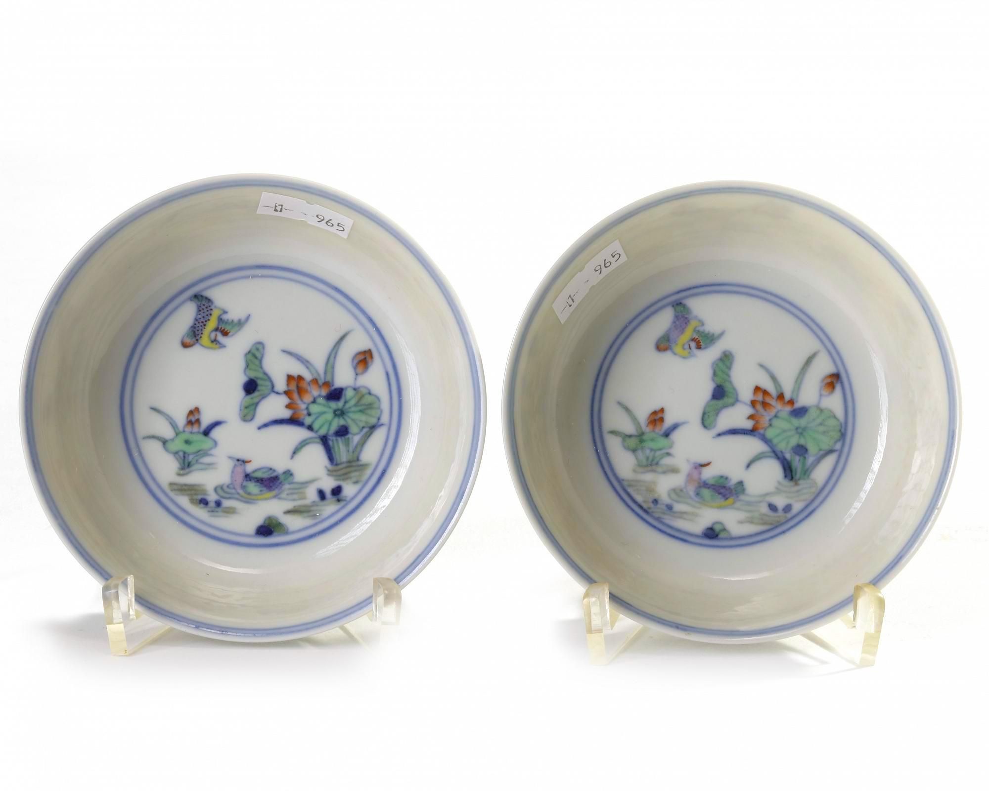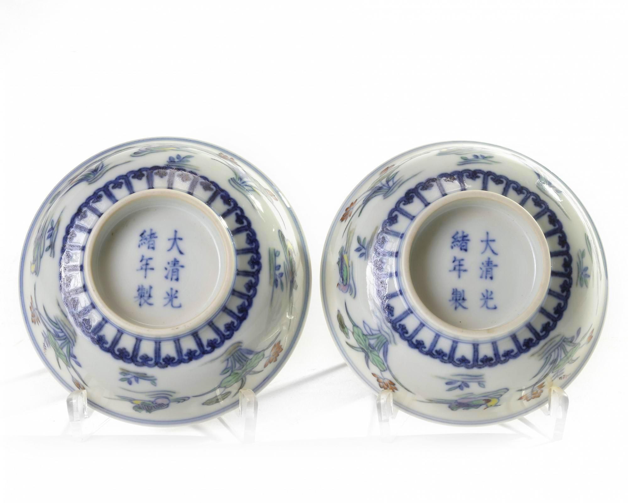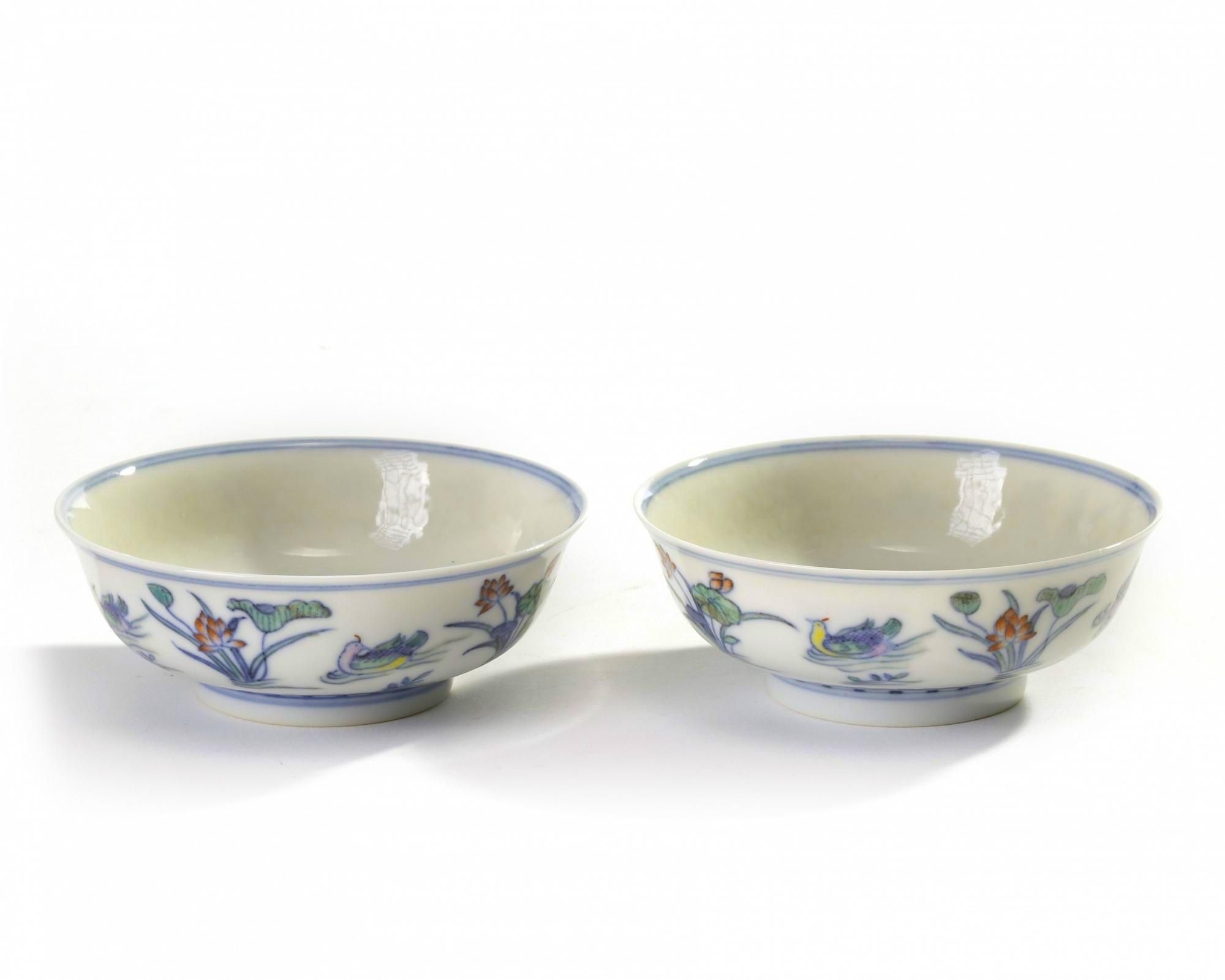 Each bowl is decorated to the exterior with a continuous scene of mandarin ducks swimming in a lotus pond. The interior is decorated with a roundel enclosing a mandarin duck swimming in a lotus pond with a further duck in flight. The bases with apocryphal Guangxu marks.