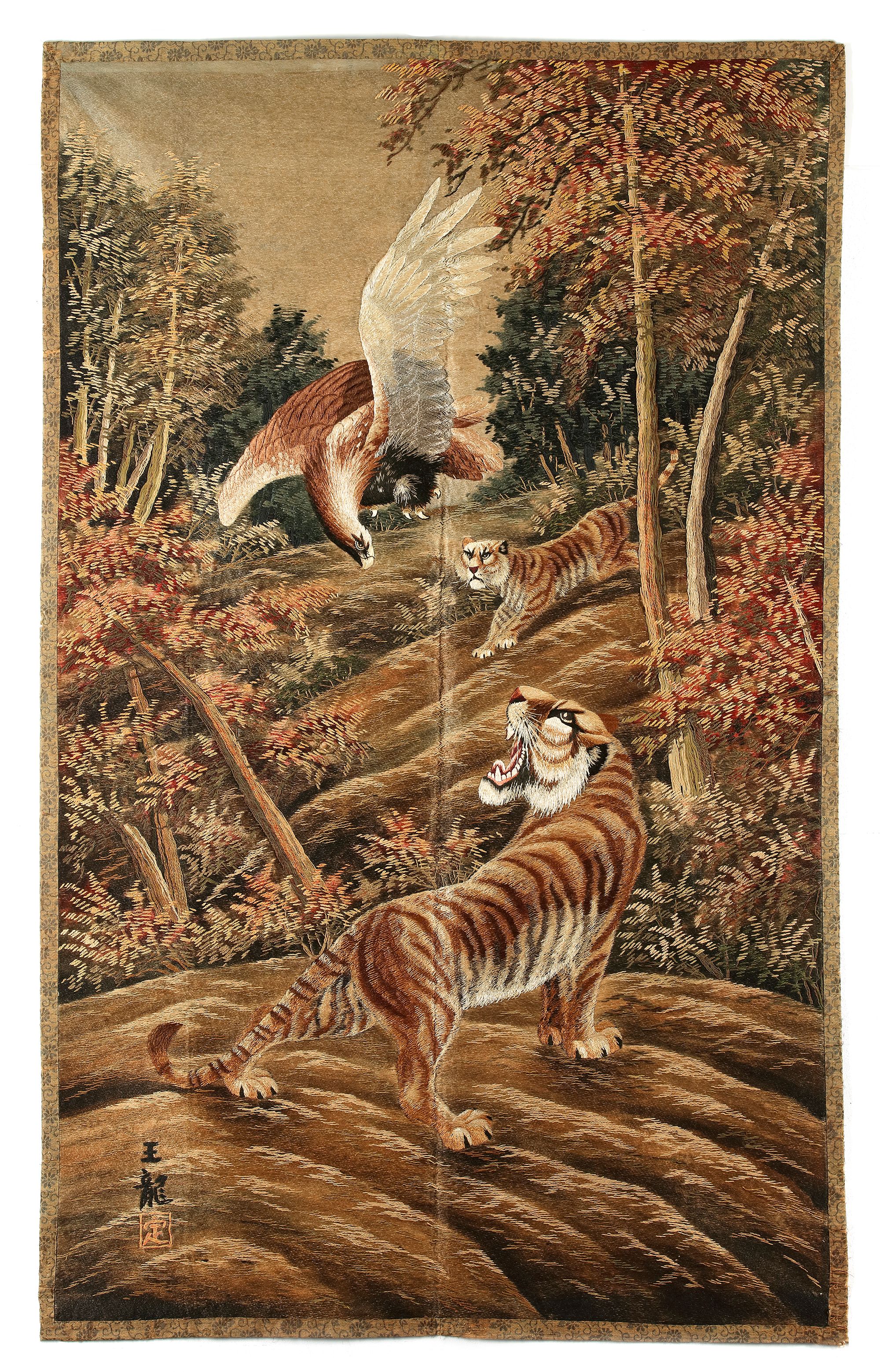 A Chinese wool rug hand knotted with an eagle flying over two large tigers in a forest. 105 by 170 cm.