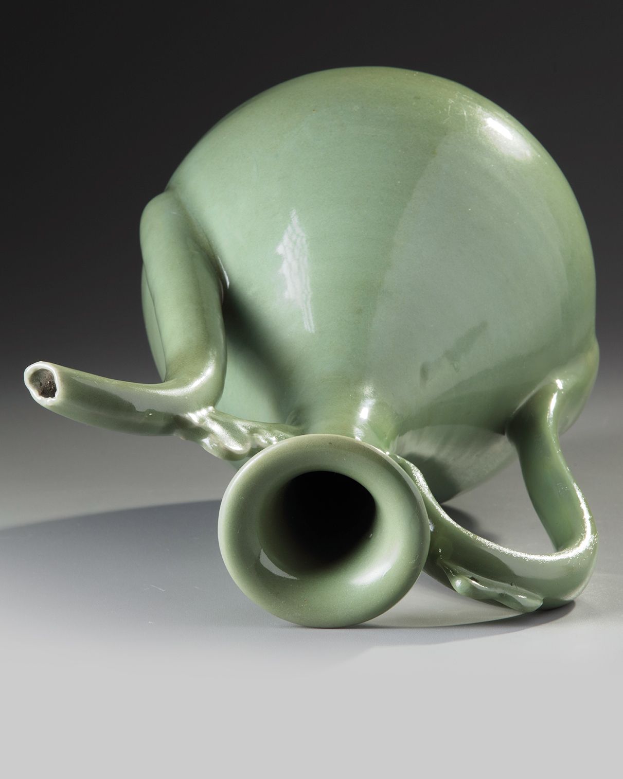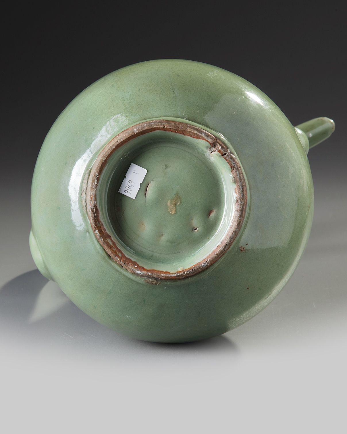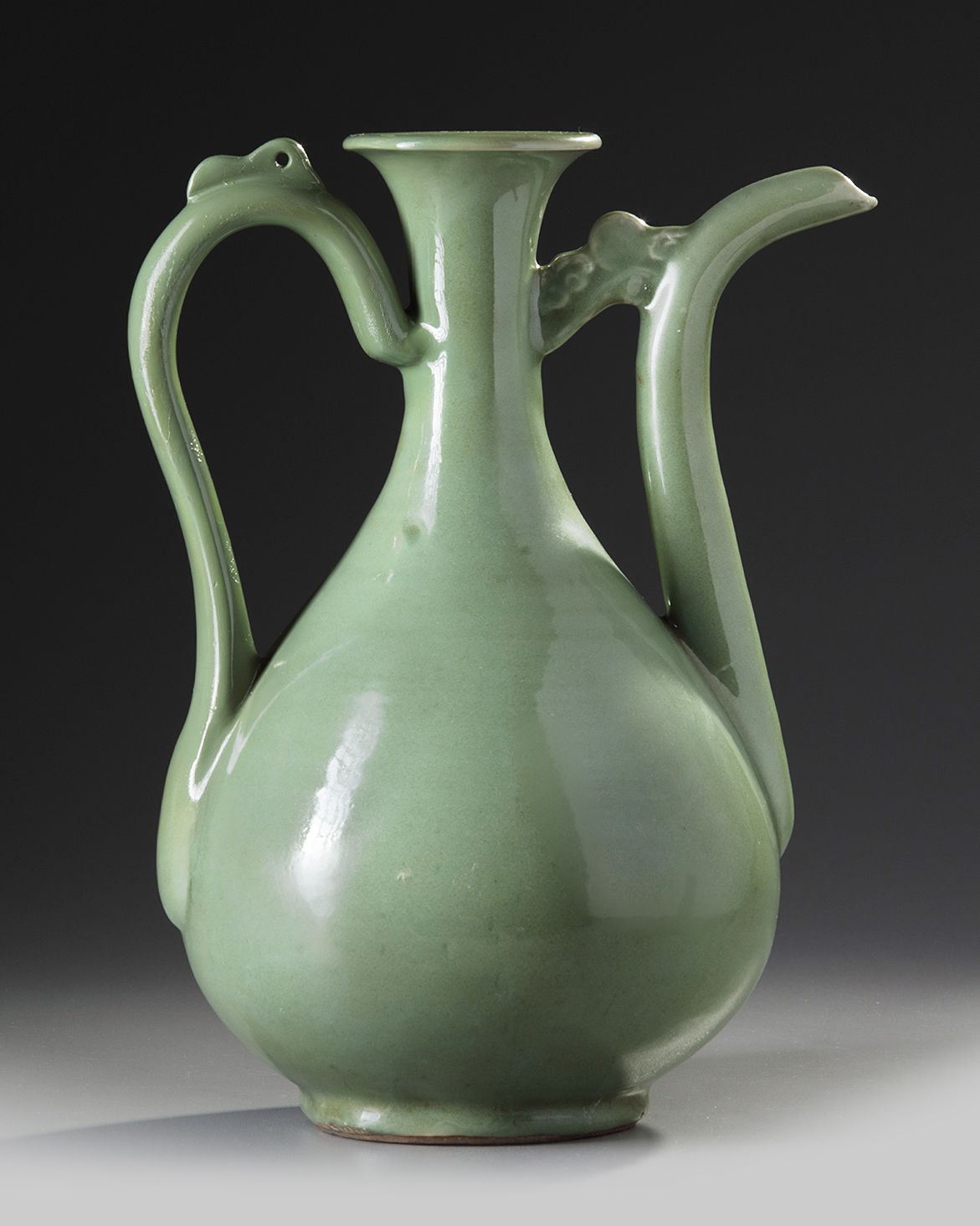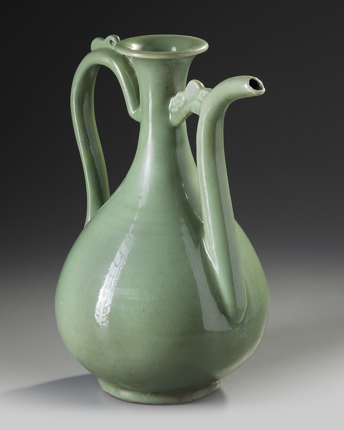 The pear-shaped ewer is decorated with an elegant c-shaped handle, the s-shaped spout is supported by a shaped truss. The ewer is covered overall with a seafoam-green glaze.
