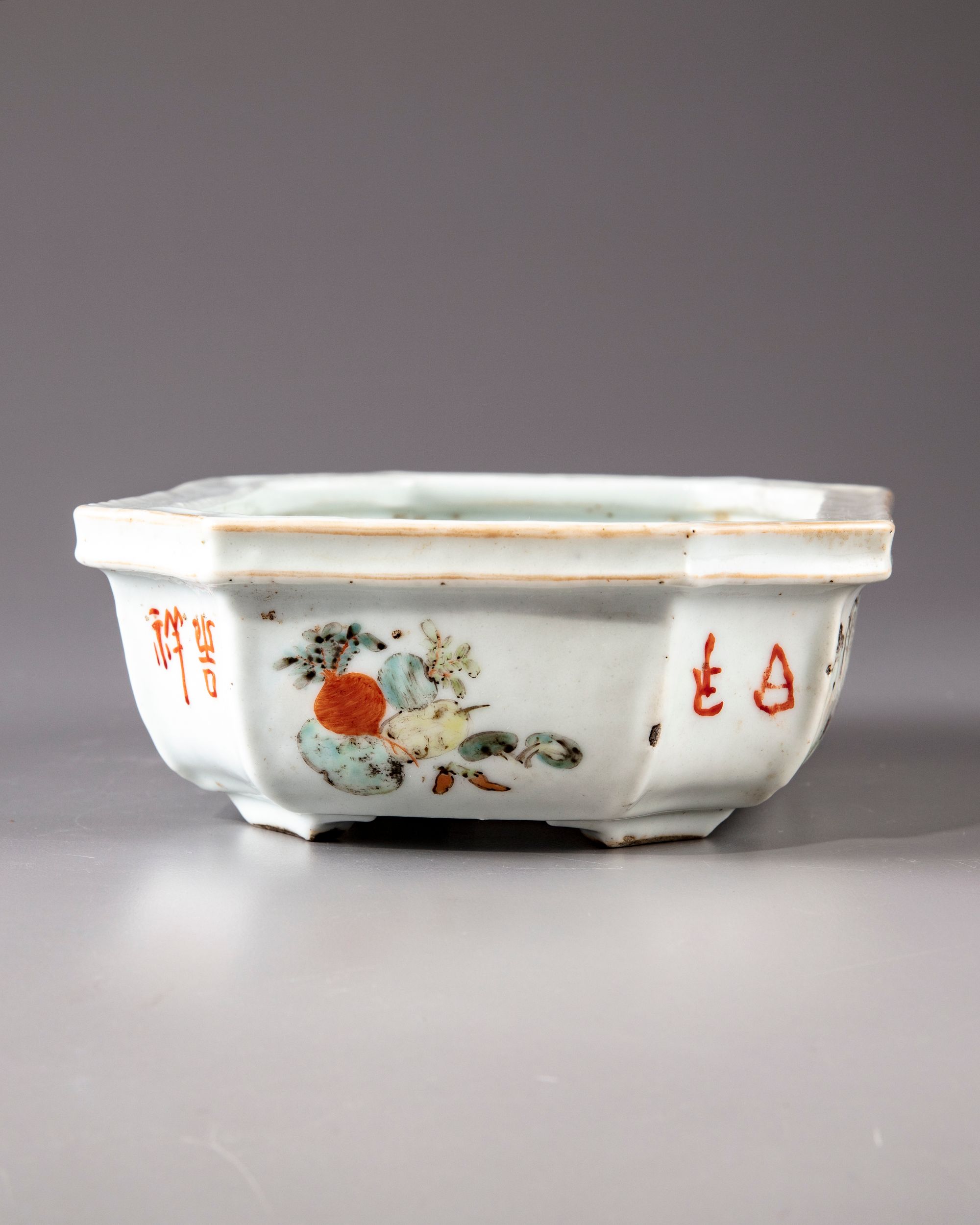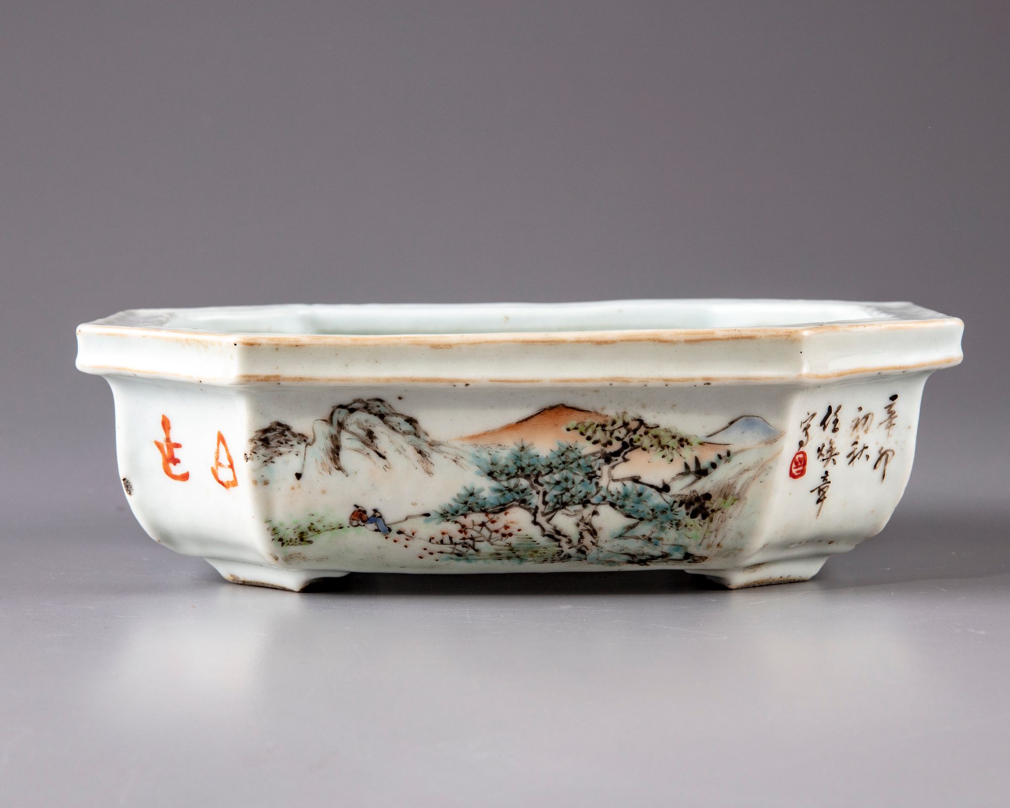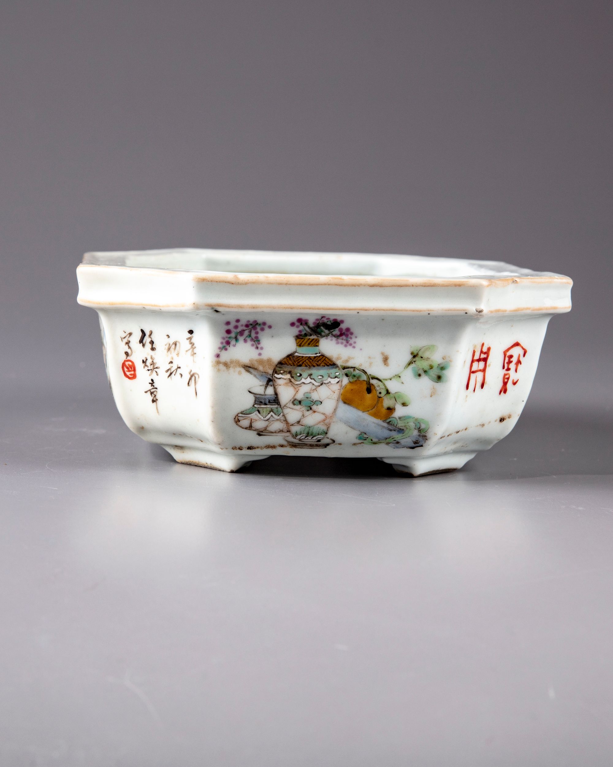 A small octagonal jardiniere to the sides with , a seated scholar, fuits, precious items and a landscape with further a Chinese poem.