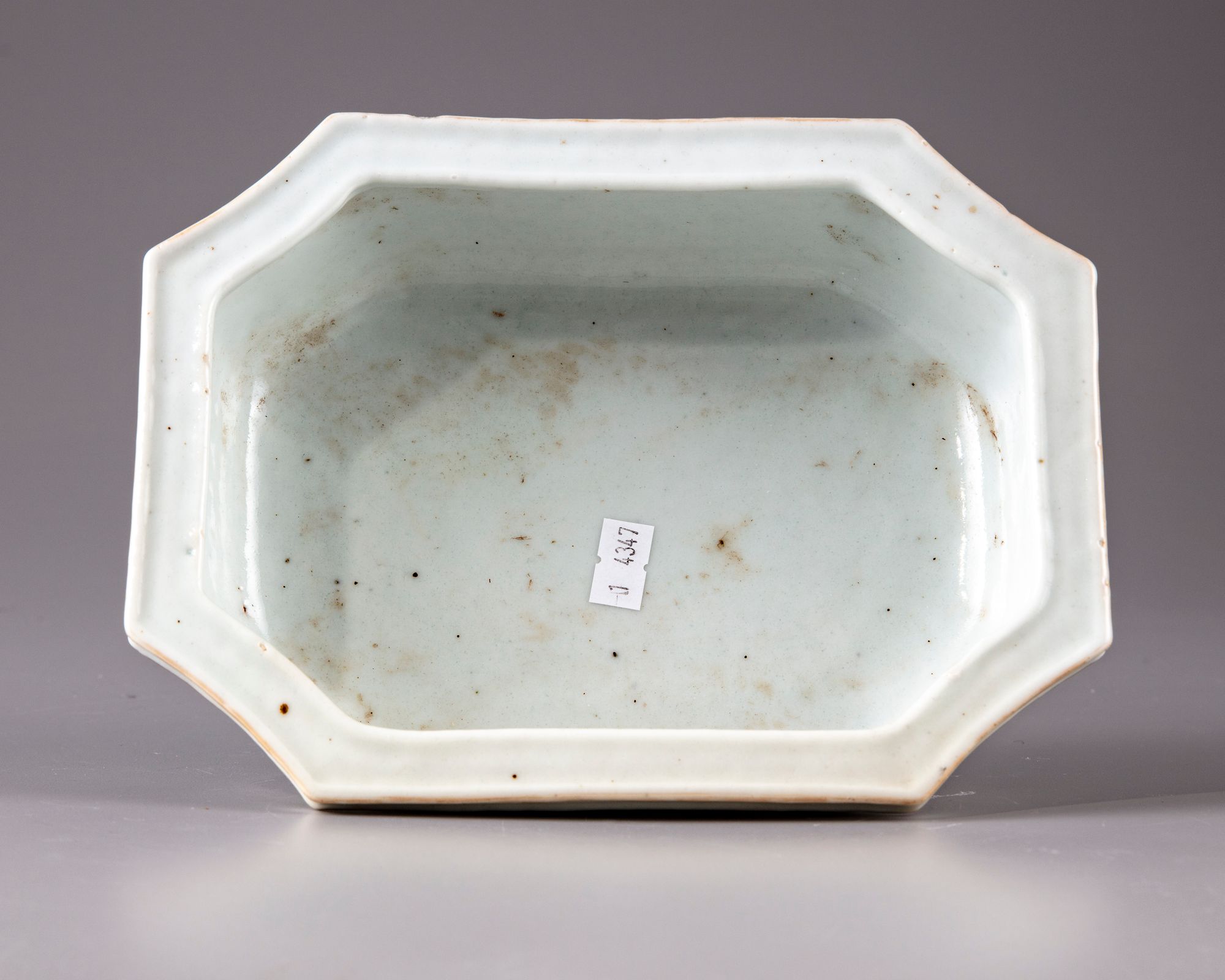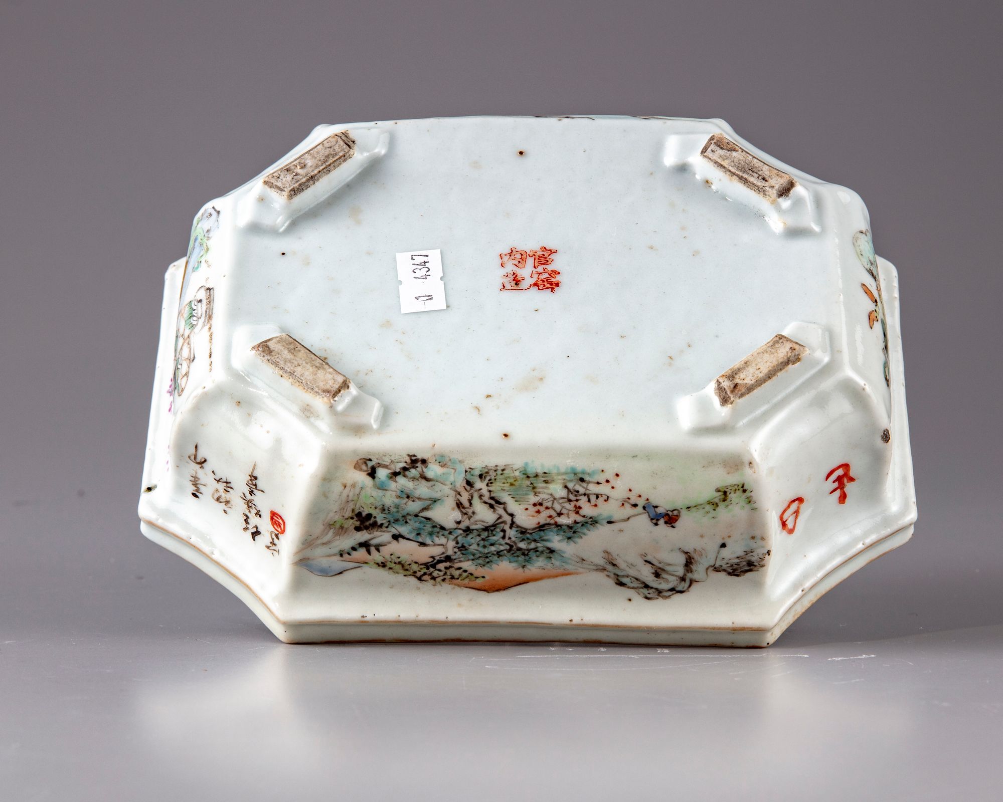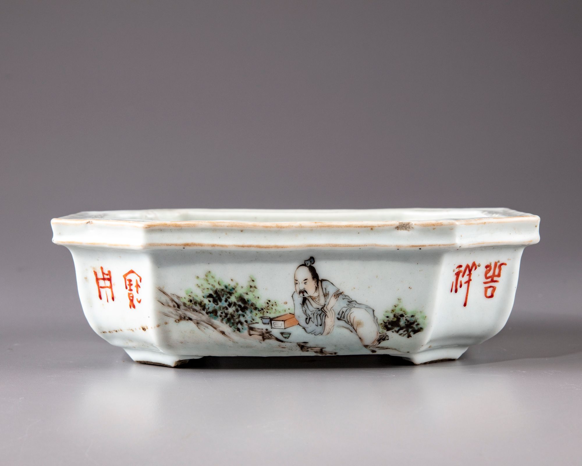 A small octagonal jardiniere to the sides with , a seated scholar, fuits, precious items and a landscape with further a Chinese poem.