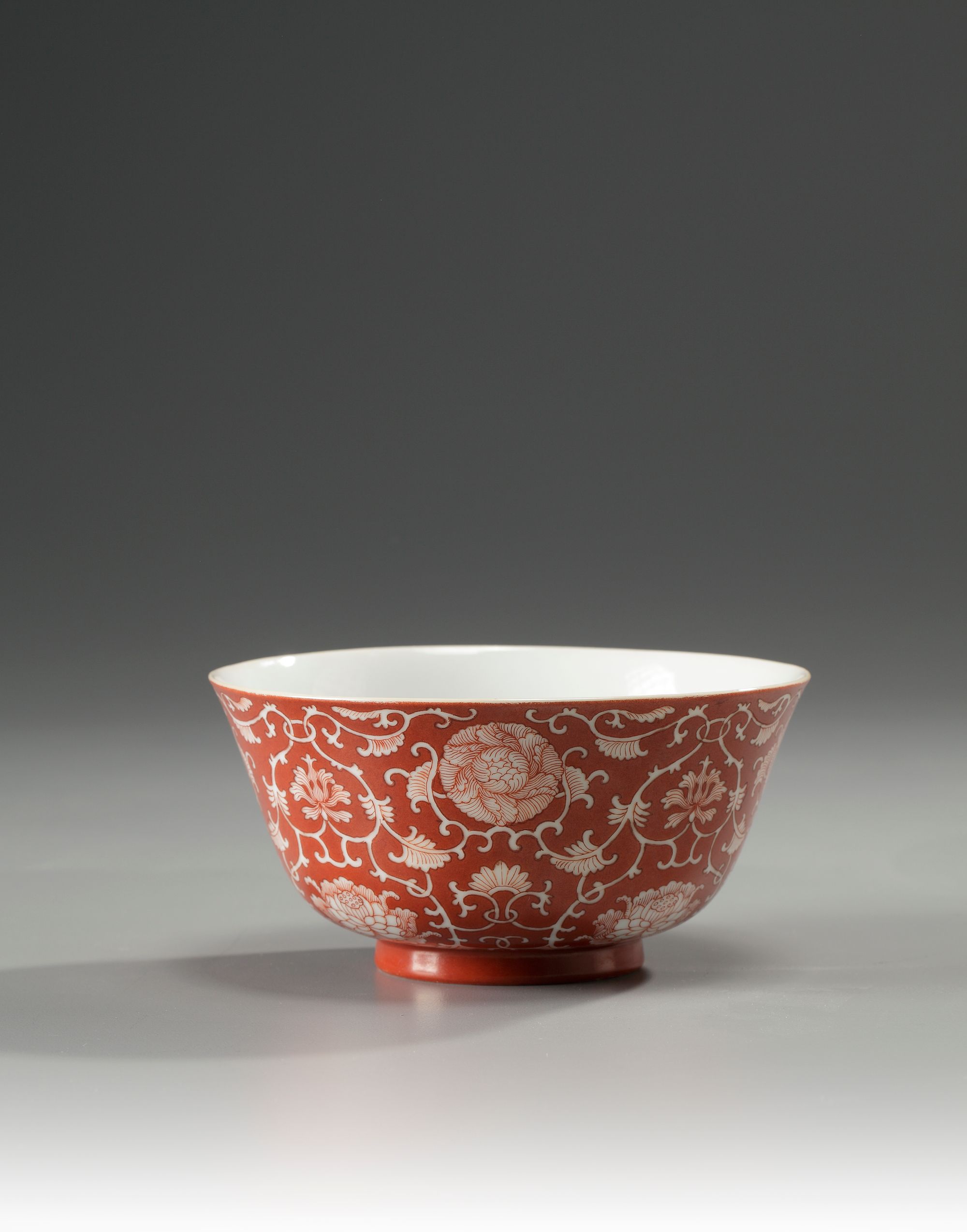 The bowl is thinly potted with tall rounded sides and a flaring mouth rim, raised on a short foot. The exterior of the bowl is delicately painted in iron-red to depict flower heads with leafy scrolls.