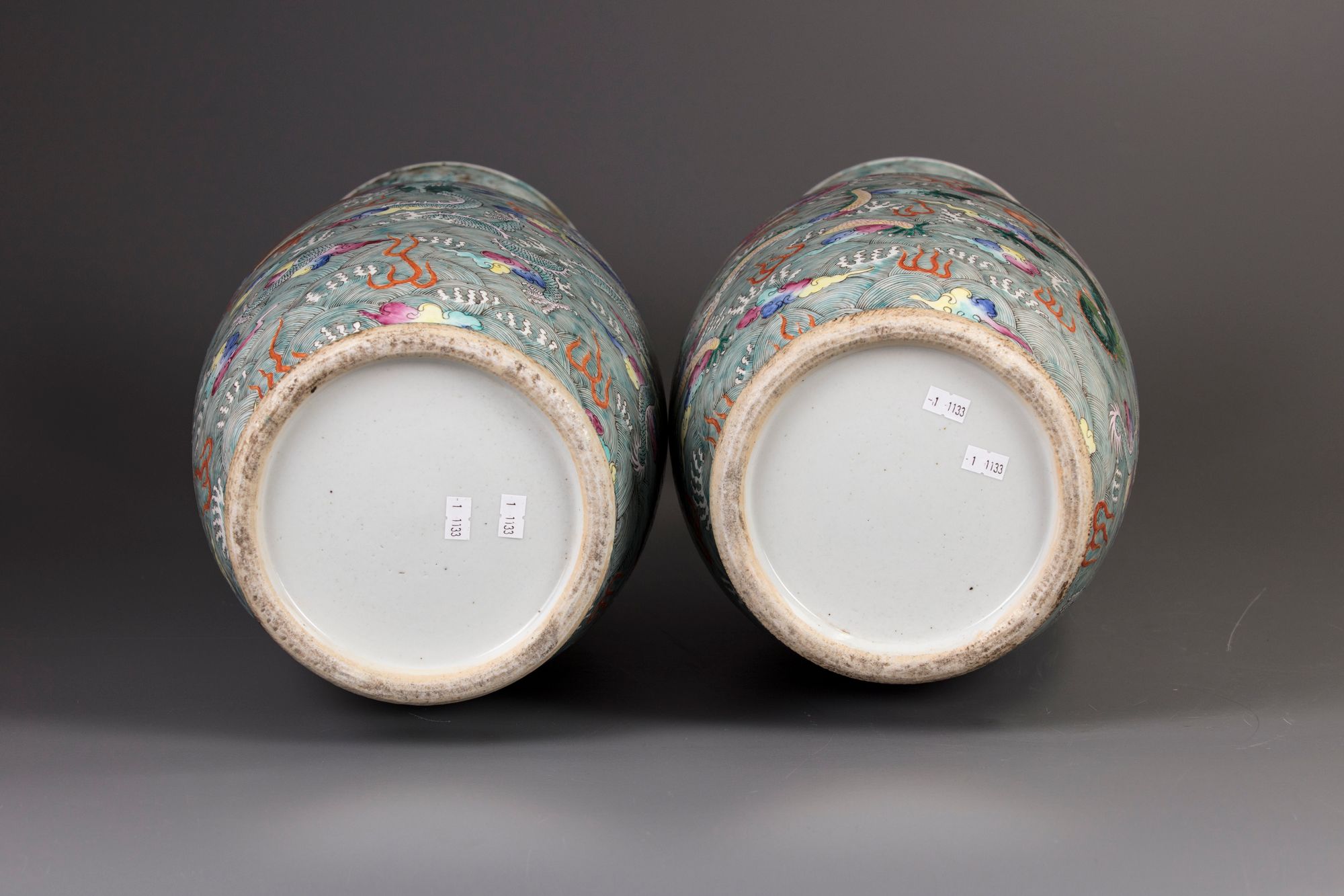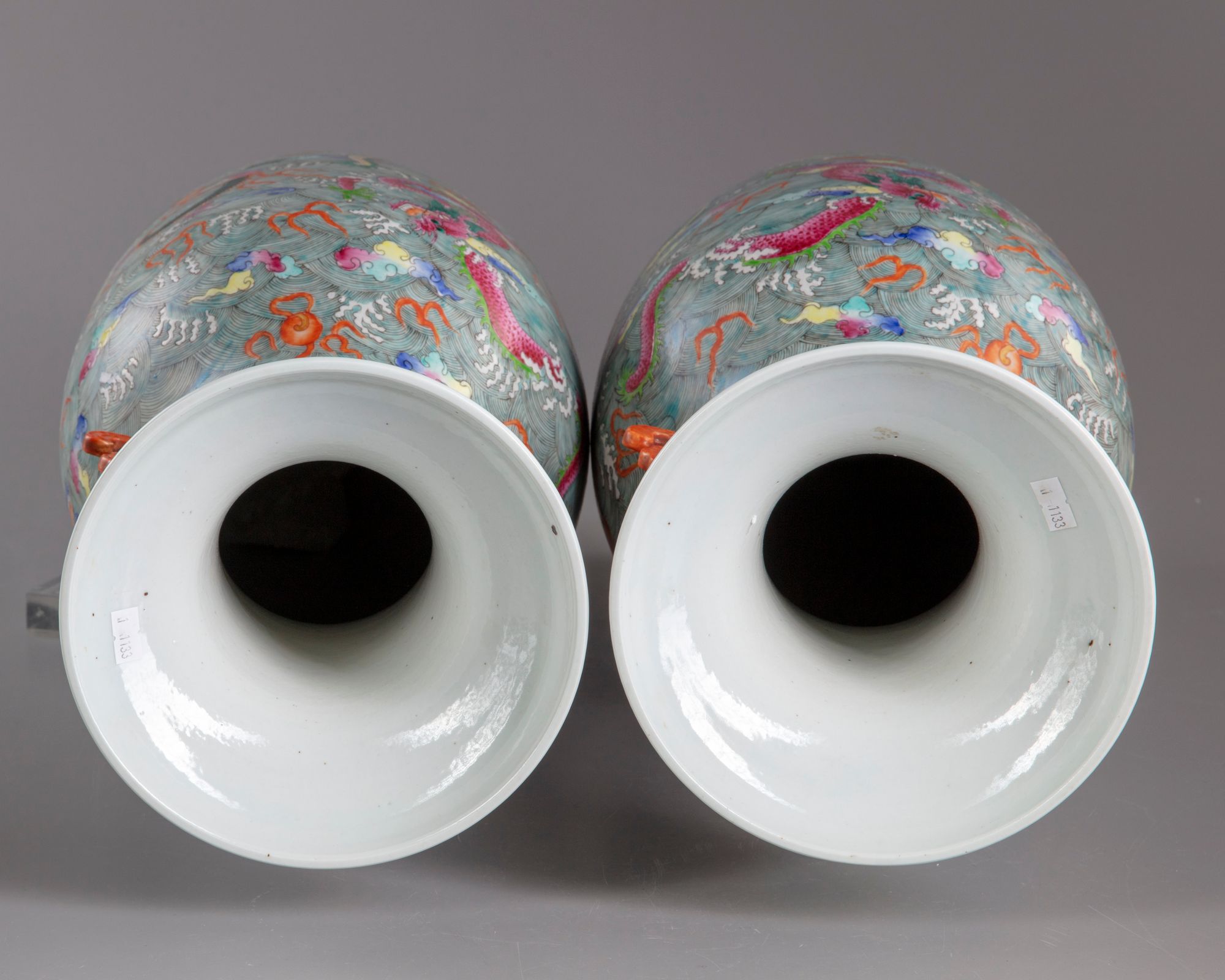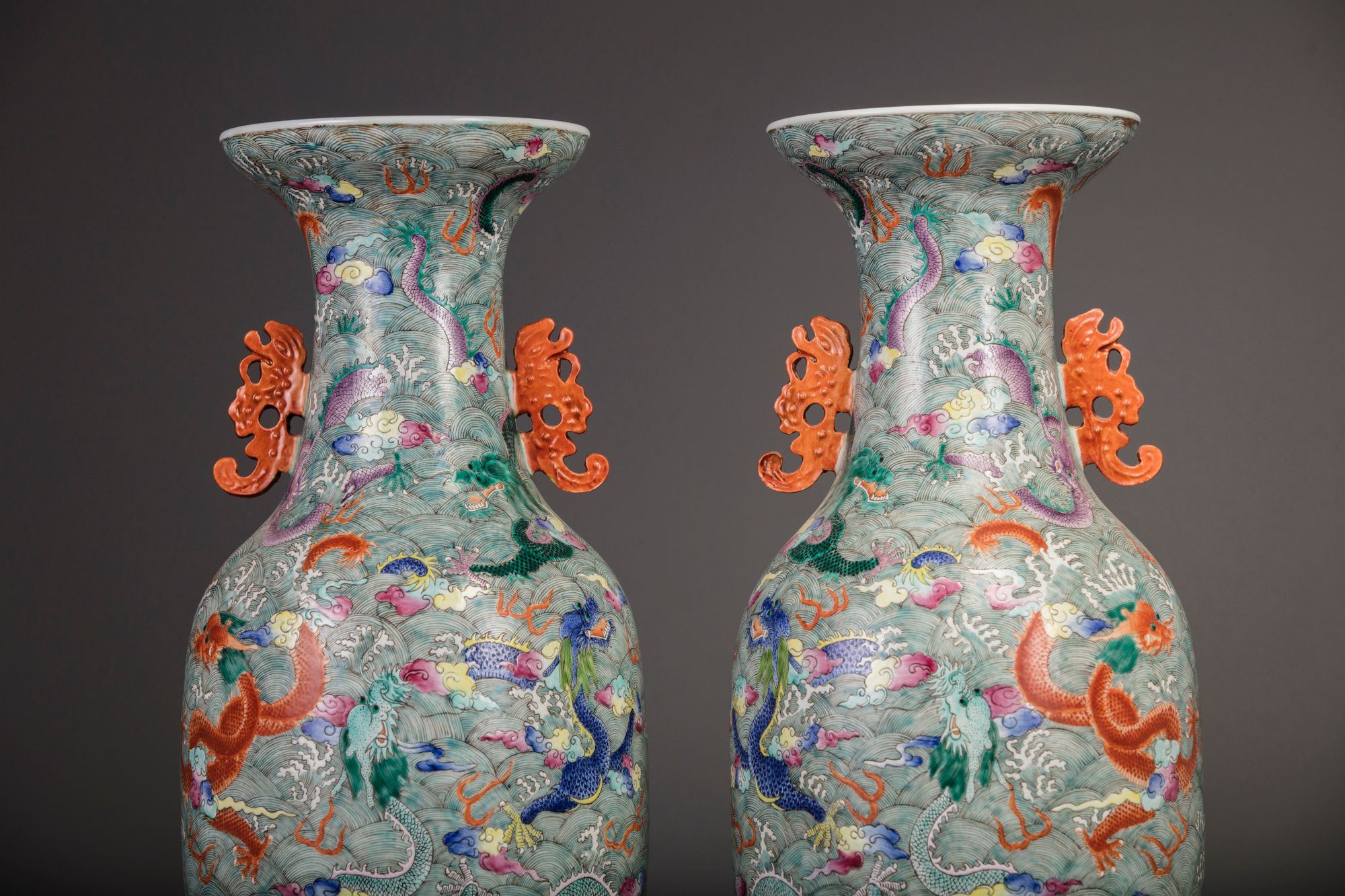 Each vase is decorated with two stylised mythical beast handles to the neck, the bodies are decorated in mirror image with a central dragon to the neck chasing the flaming pearl, and eight further multi colored dragons amongst cloud scrolls striding through foaming waves. 61 cm.