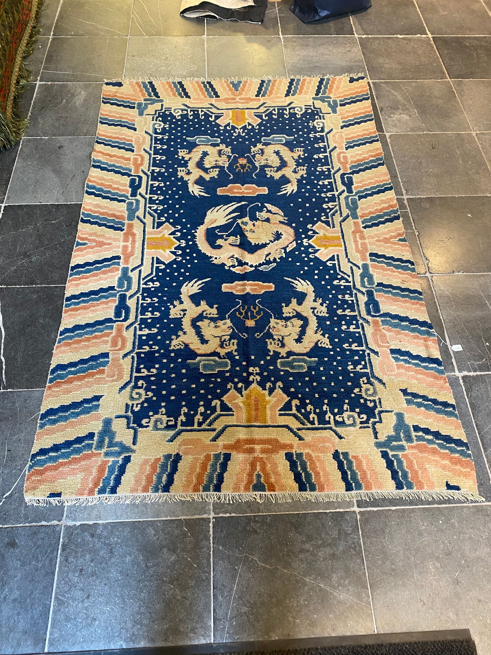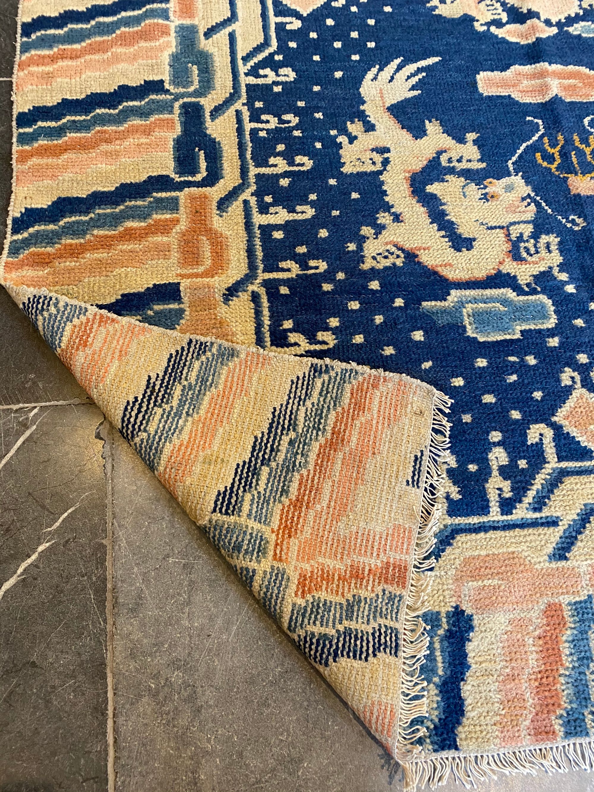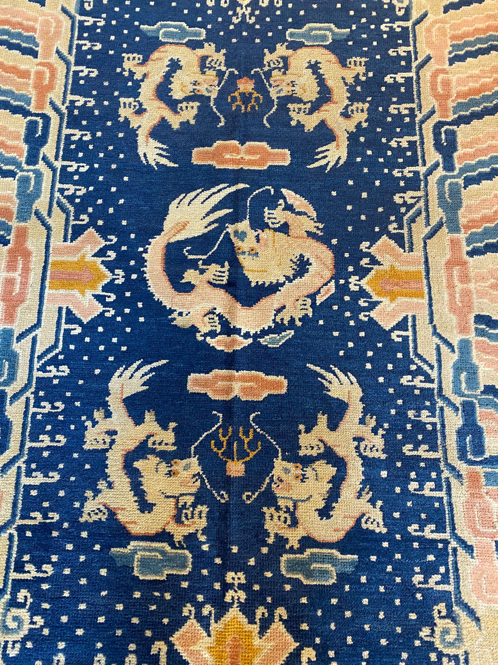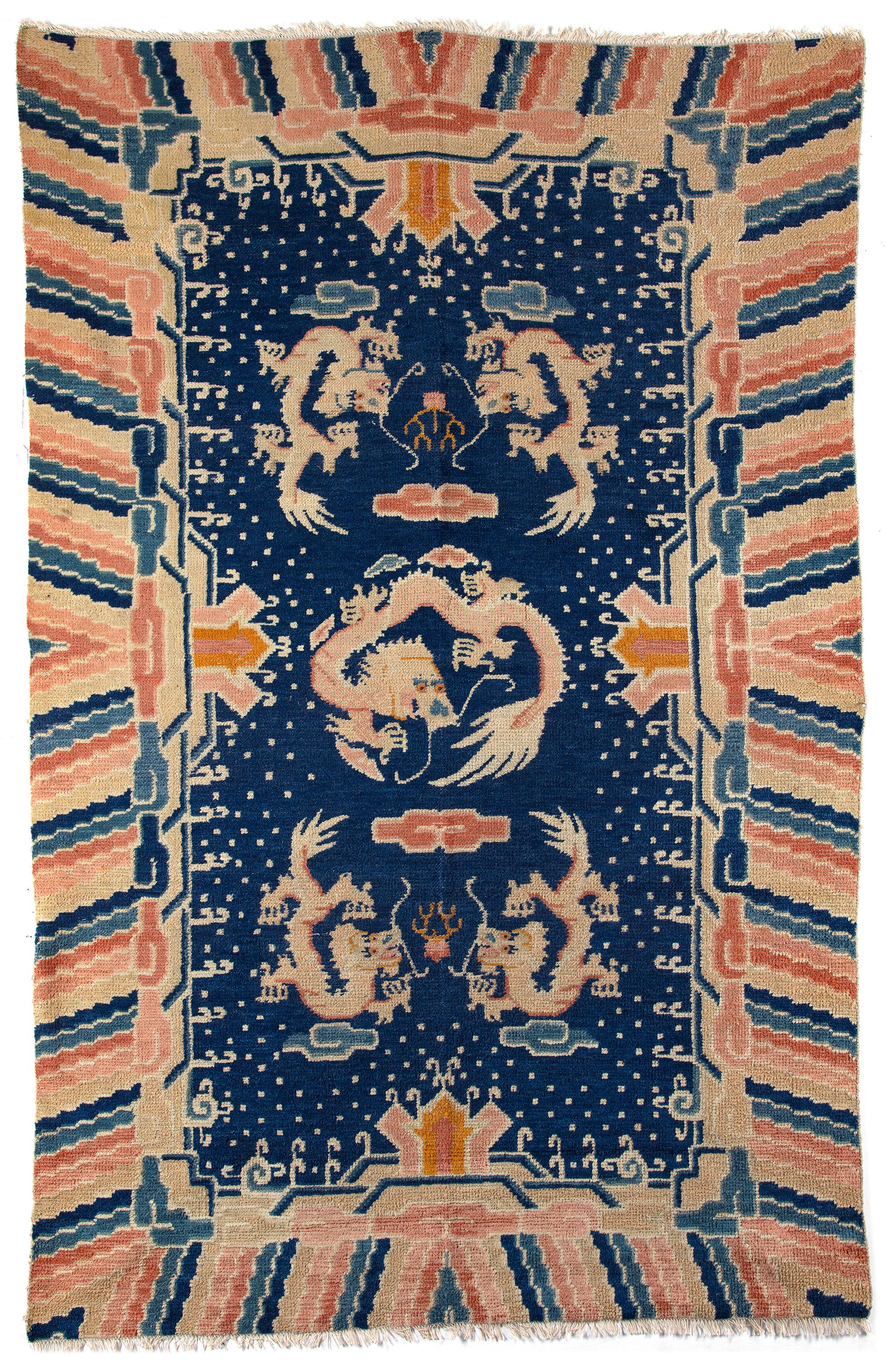 Decorated with five dragons chasing flaming pearls within a polychrome wave-pattern border. 200 by 130 cm.
