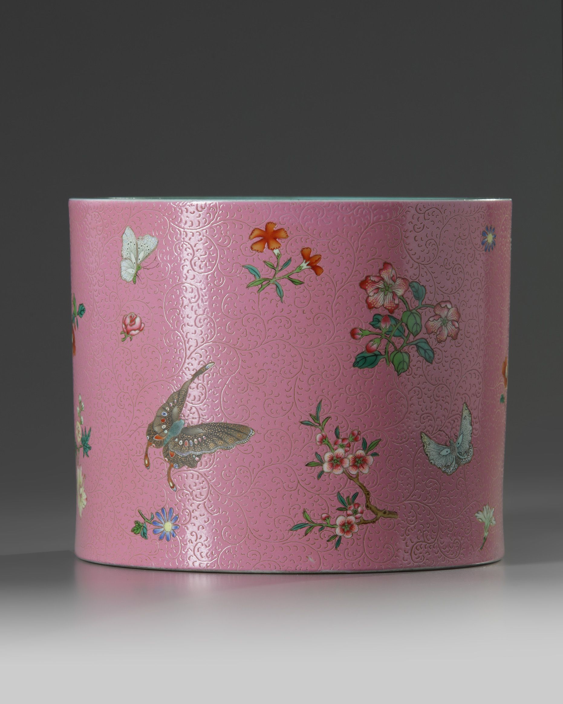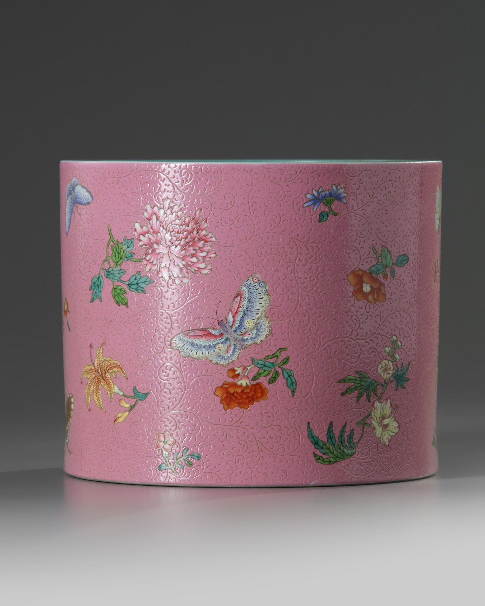 A Chinese pink-ground sgraffiato famille rose 'butterflies and flowers' brush pot, bitong