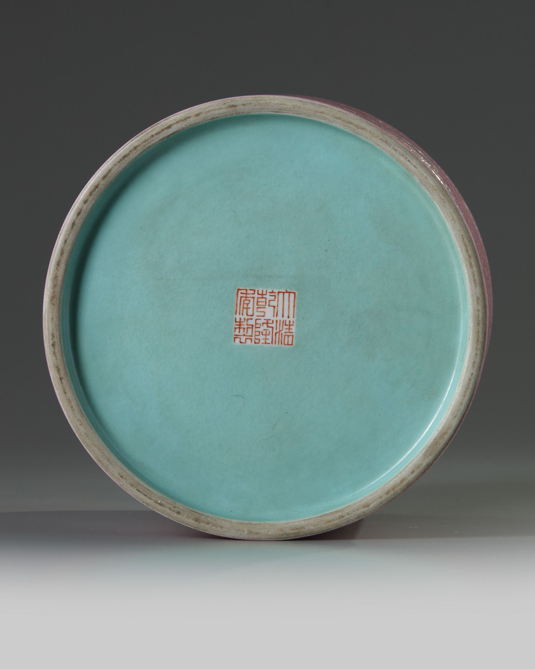 The exterior is decorated with scattered flowers and butterflies in flight, all reserved on a pink-enamelled ground decorated with carved foliate scrolls. The interior and base were glazed turquoise, with an apocryphal Qianlong mark.